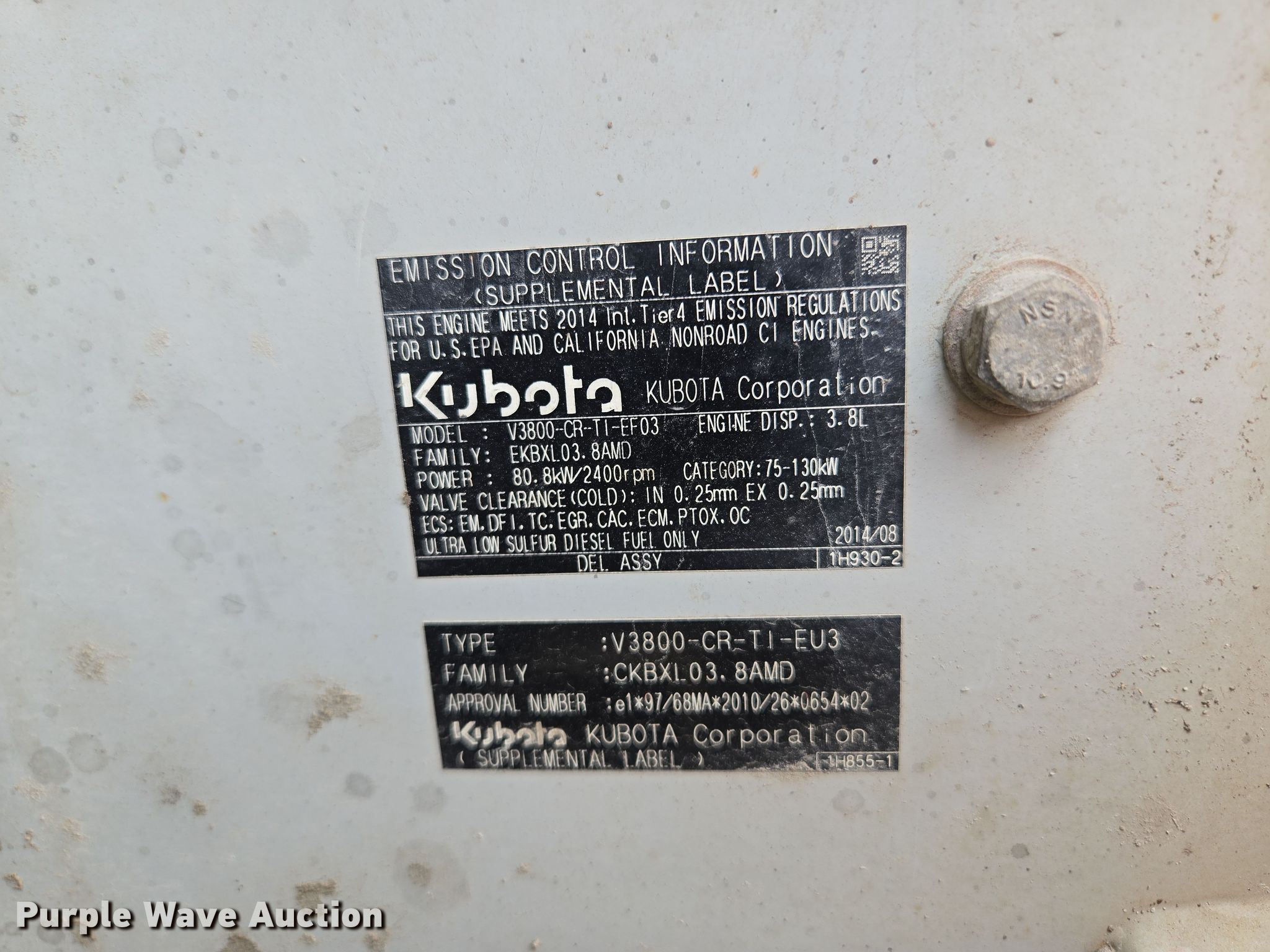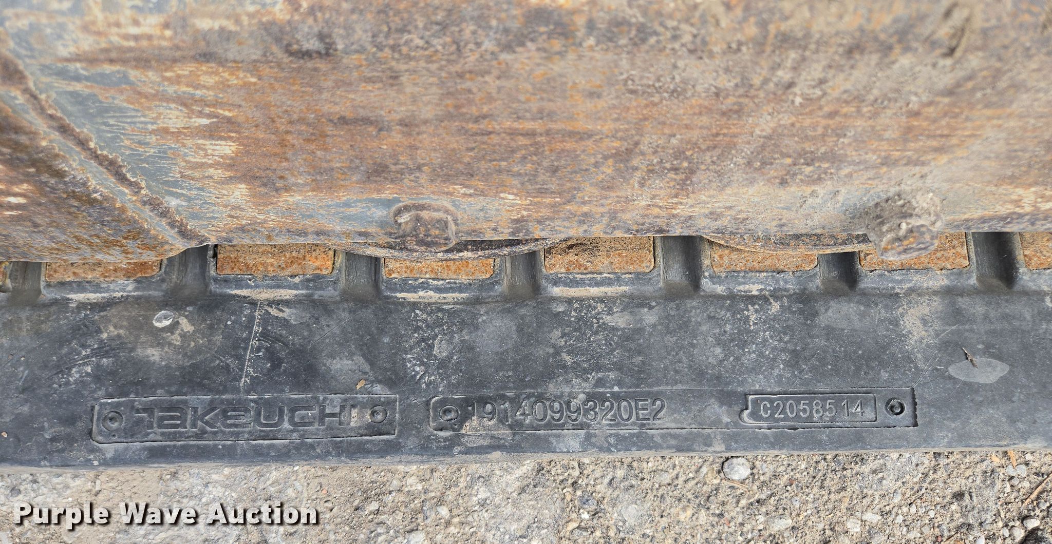 2014 Takeuchi TL12 tracked skid steer loader. Hours: 3,894 on meter, Serial: 201201289. Engine Kubota V3800-CR-TI-EF03, Displacement: 3.8L, Cylinders: 4, Fuel type: Diesel. Transmission Hydrostatic. Operators station Enclosed cab, AC, Heat, Bucket control: Hand. Features Auxiliary hydraulics, Auxiliary electrical outlet, Quick coupler: Hydraulic. Tracks Width: 17.5". Notes AC issues, Engine issues Dipstick ejects. Ray-Carroll County Grain Growers, Inc.. Mayview, MO 64071