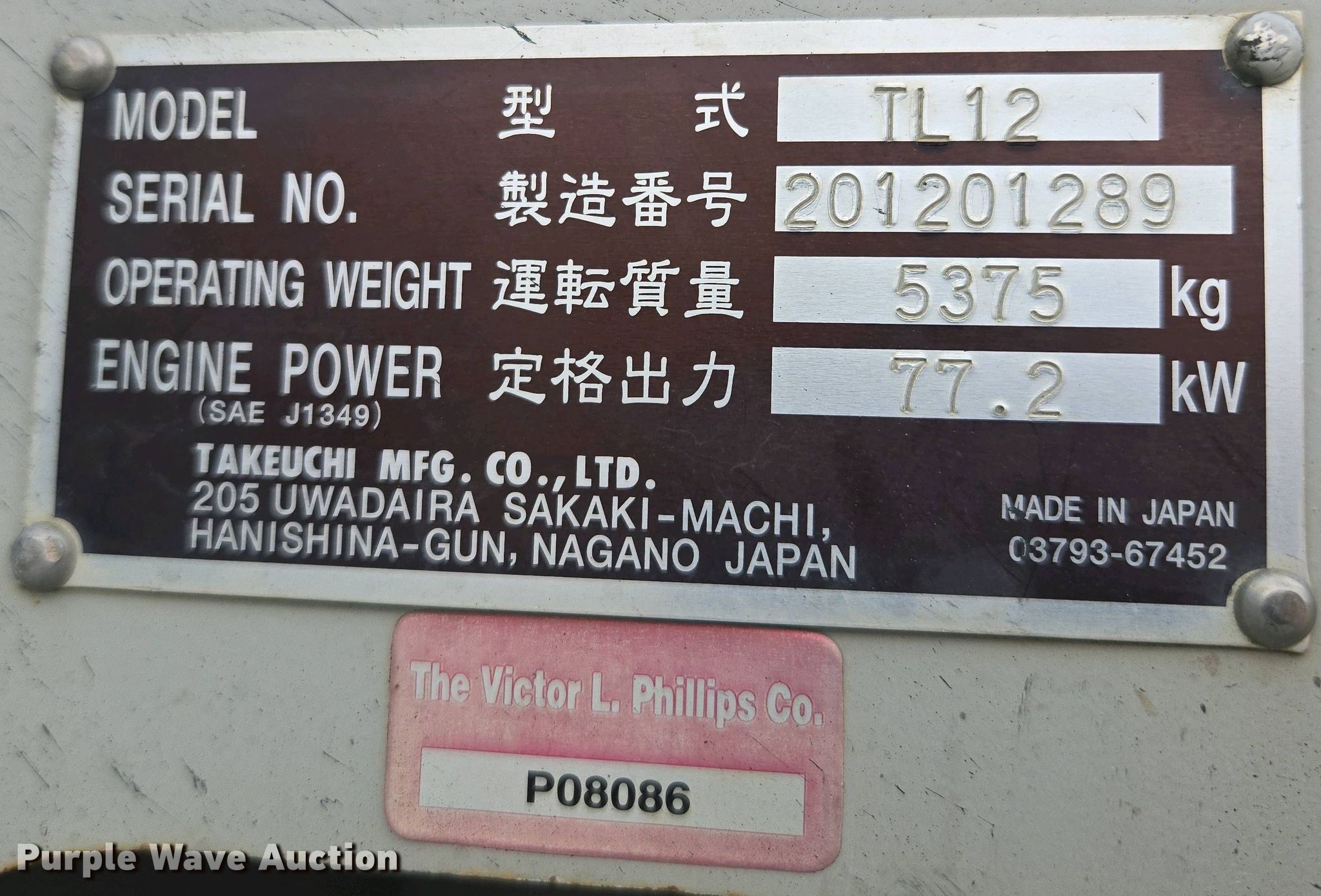 Purple Wave is selling a used Tracked Skid Steer Loader in Missouri. This item is a 2014 Takeuchi TL12 tracked skid steer loader with the following: Hours: 3,894 on meter, Serial: 201201289