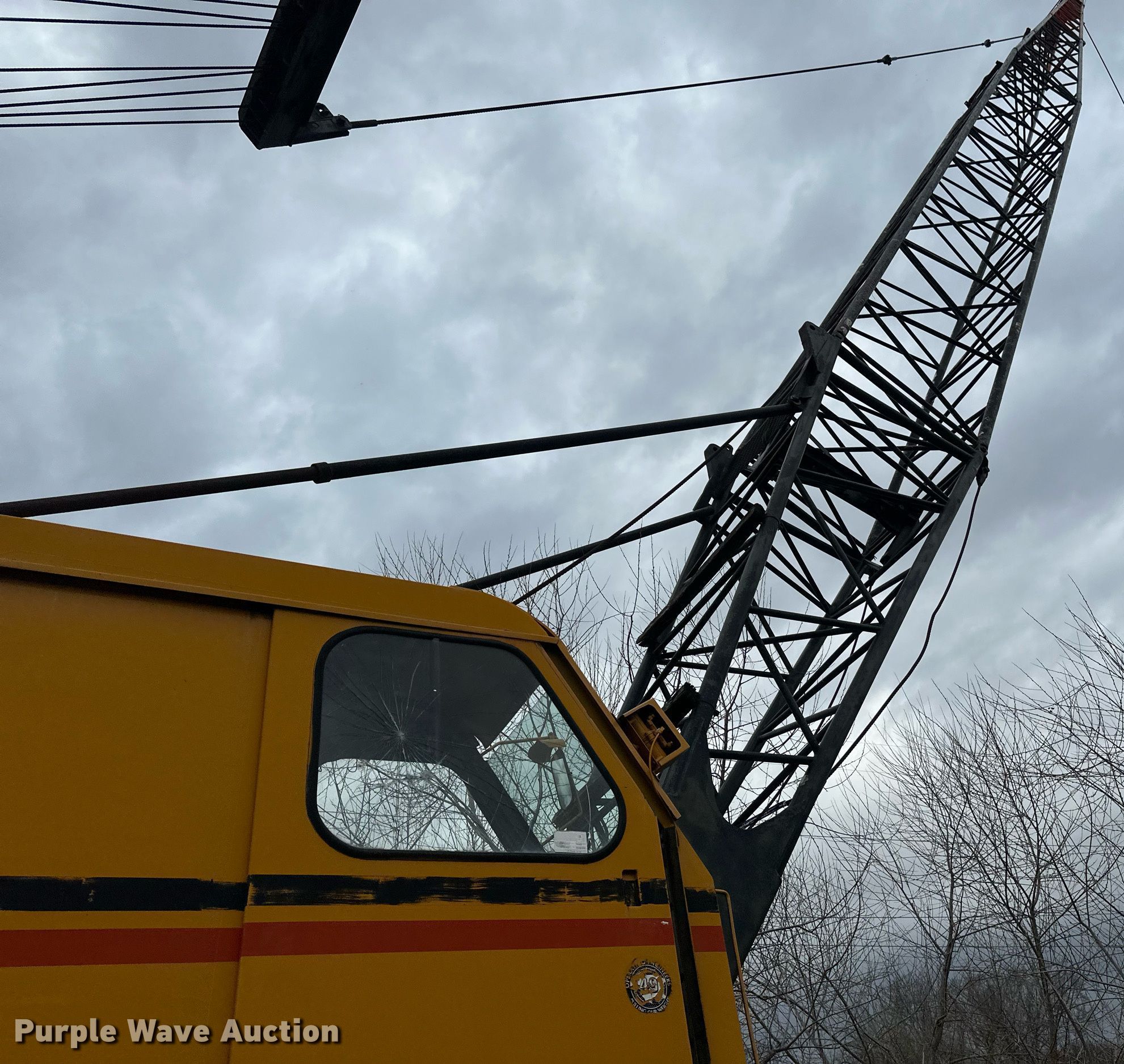 1986 American 7450 crane. Miles: 16,150 on odometer, Hours: 79 on meter, Actual hours unknown, Serial: CS8638. Engine Detroit Diesel 8v71, Cylinders: 8, Fuel type: Diesel. Upper engine Detroit Diesel 671, Cylinders: 6, Fuel type: Diesel. Transmission Automatic, Manual, Speed: 5. Chassis Axles: Tandem, Suspension: Spring, Brakes: Air. Operators station Enclosed cab, Heat, Crane controls: Stick. Features Boom Lattice, Maximum boom length: 75'. Tires Size: 14.00-24. Notes Glass cracked, Unknown operating condition. Frattalone Companies. Little Canada, MN 55117