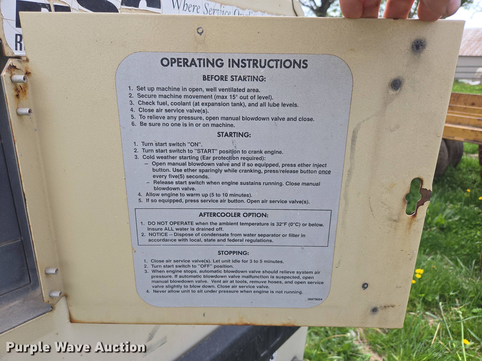 Purple Wave is selling a used Air Compressor in Missouri. This item is a Ingersoll-Rand P185WJD air compressor with the following: Hours: 3,571 on meter, Actual hours unknown, Serial: 289387UEI221