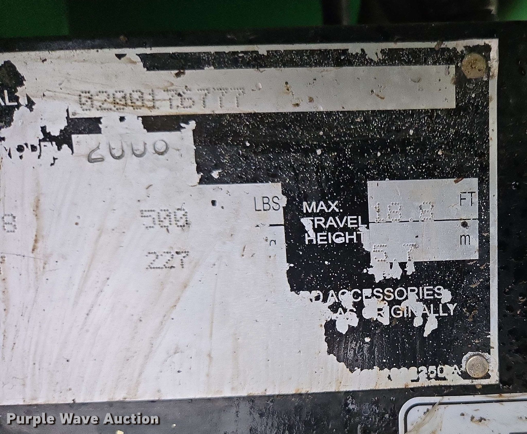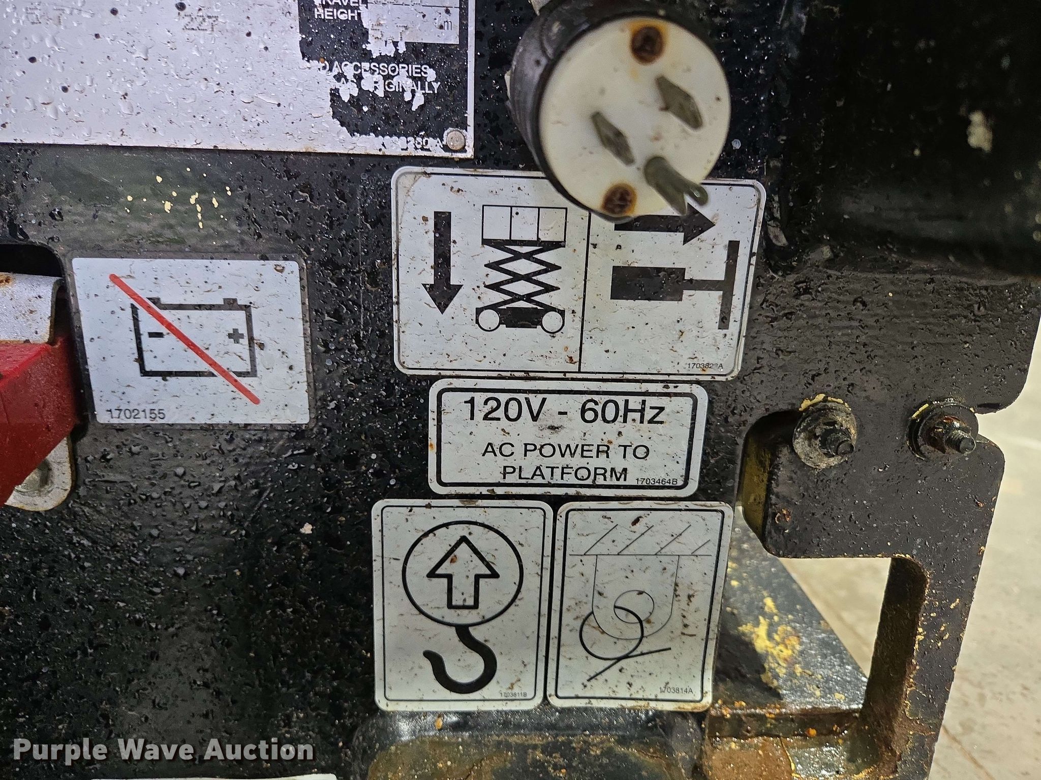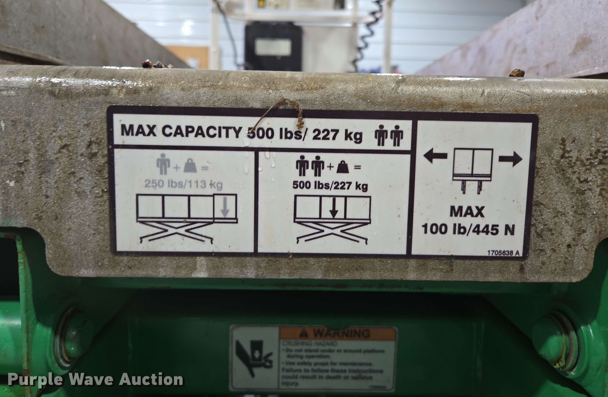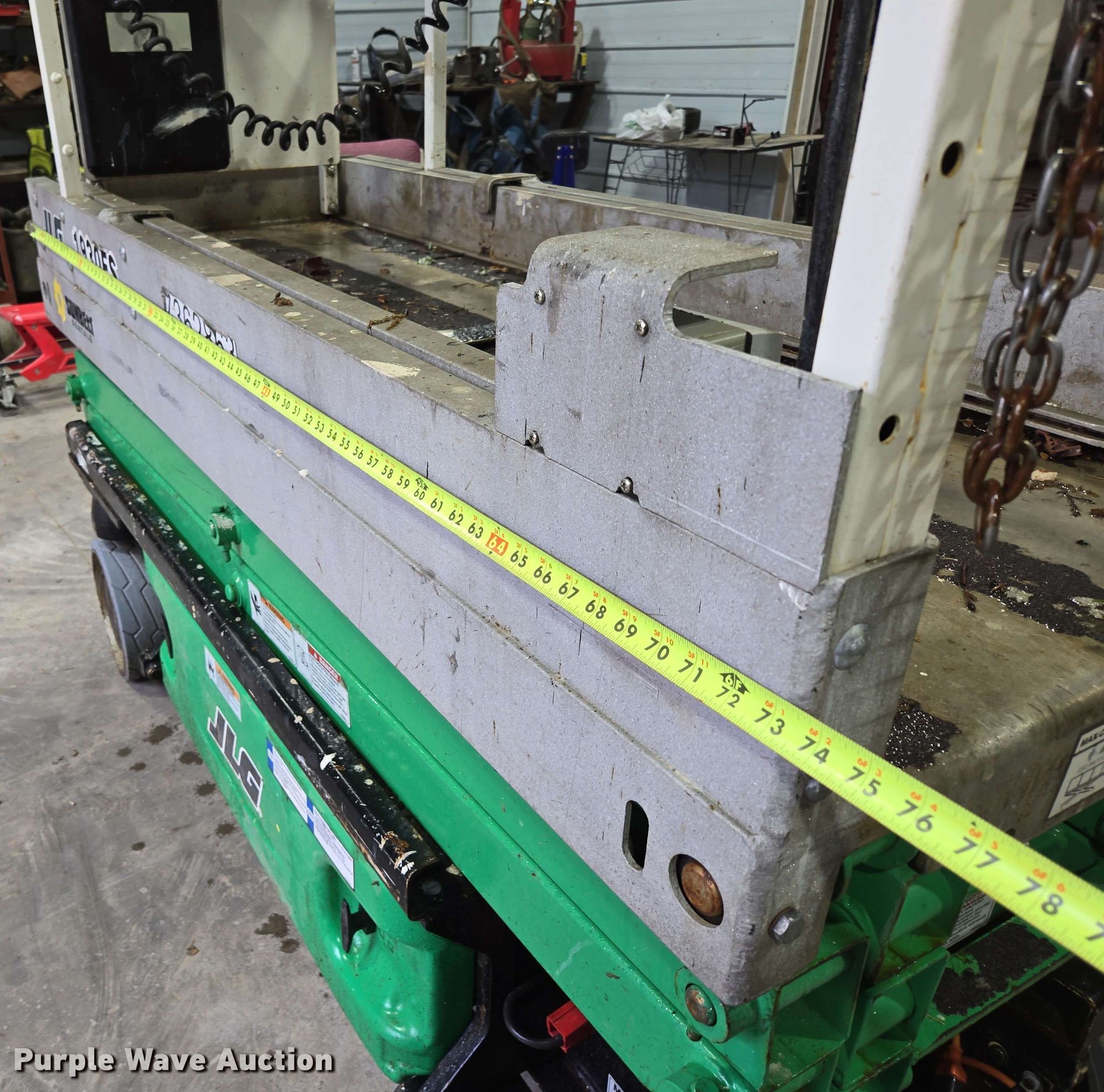 2008 JLG 1930ES scissor lift. Hours: 476 on meter, Serial: 0200176777, Unit #: Z362863. Electric Motor Volts: 24. Features Maximum lift capacity: 500 lbs, Maximum lift height: 18.8', Platform: 73.5" L x 29.5" W, AC power outlet, Controls: Remote Control, Ground, Platform extensions: Manual. Tires Tire size: 323x1.00, Solid. Notes Non-operational unit. Magnum Equipment LLC. Walnut Shade, MO 65771
