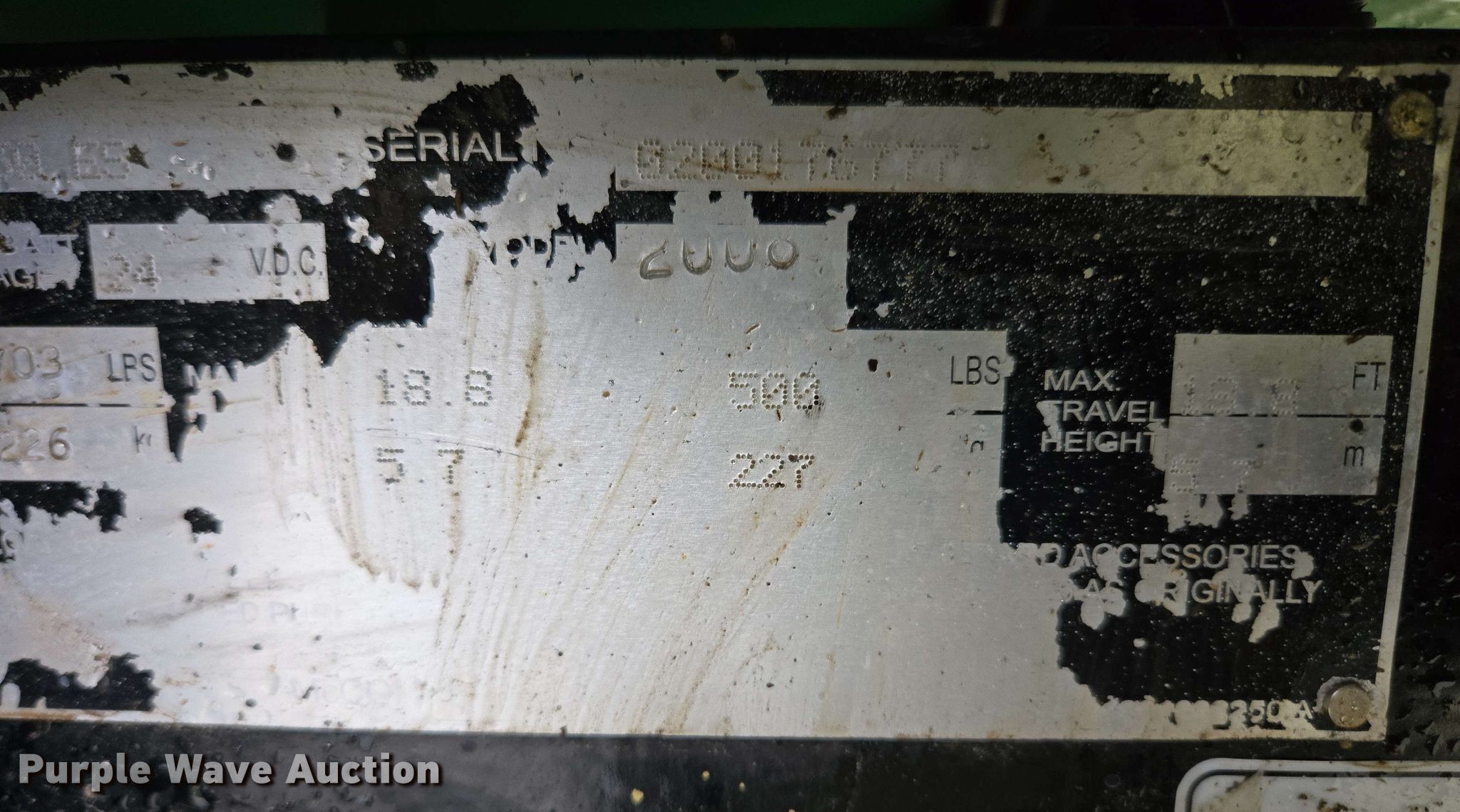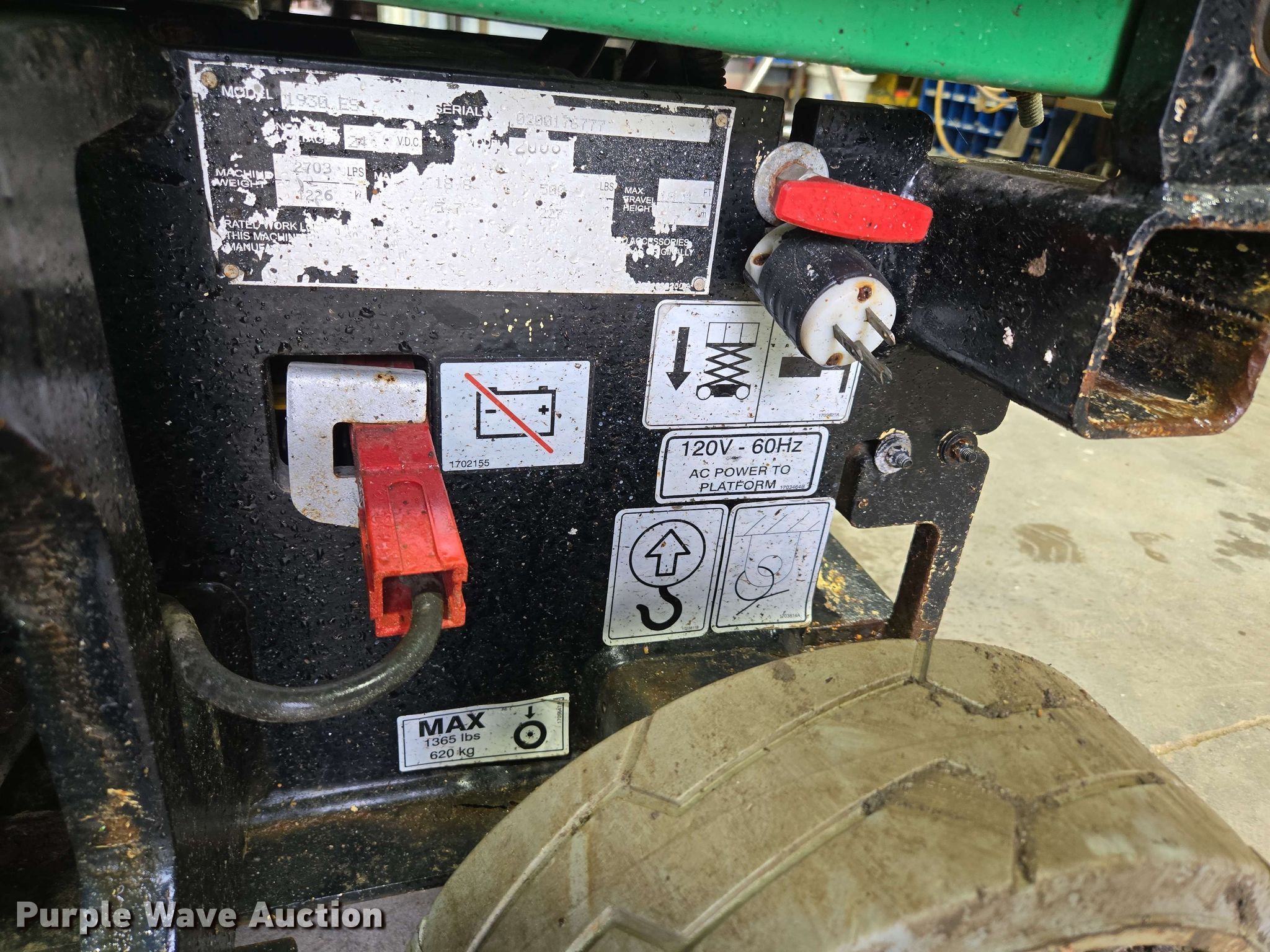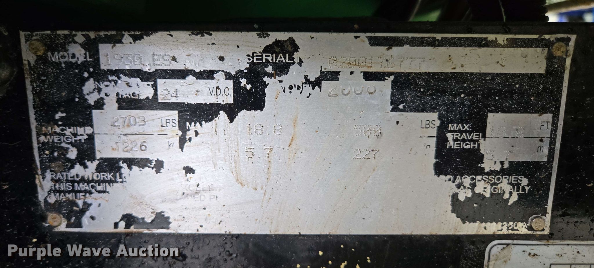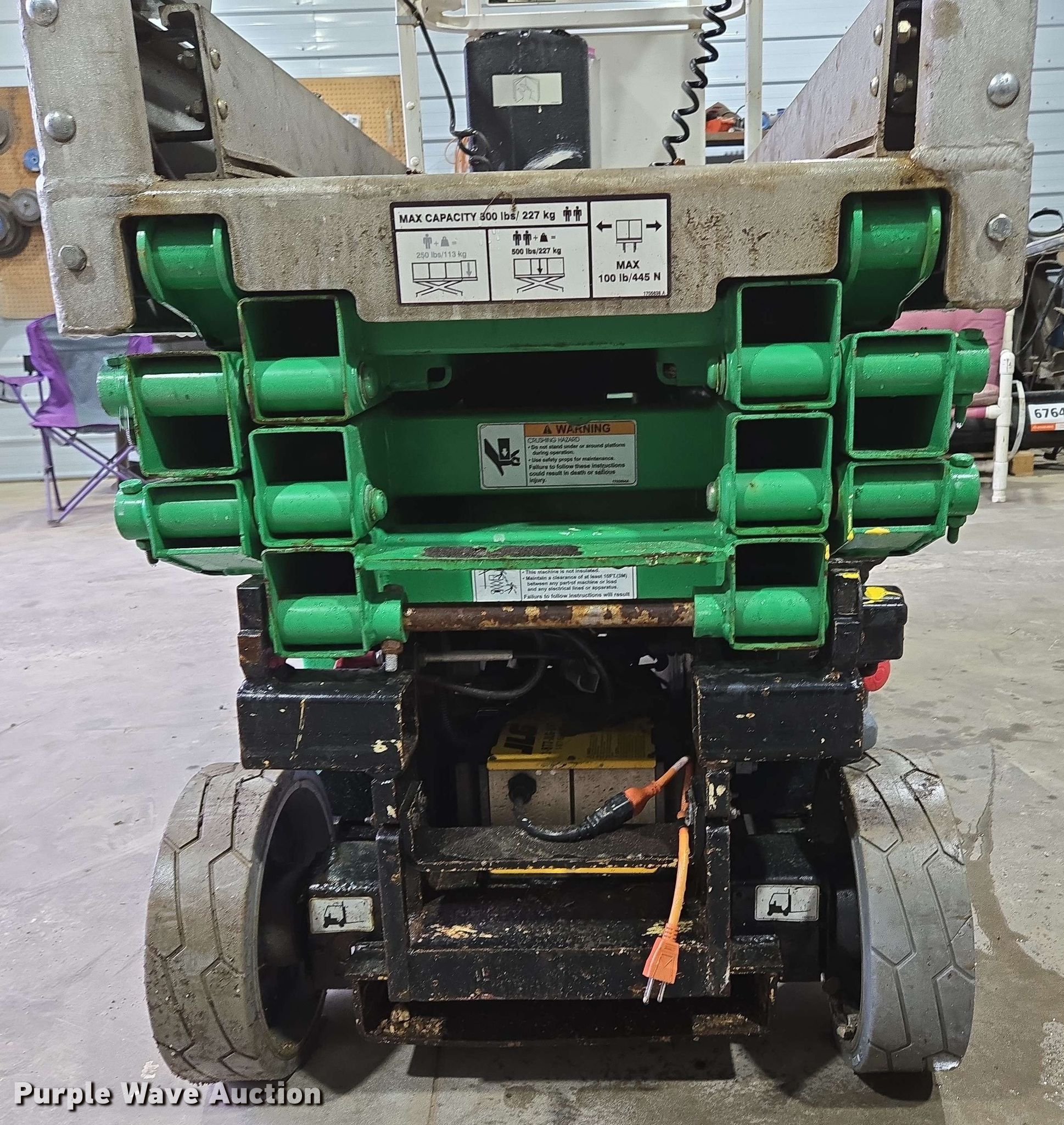 2008 JLG 1930ES scissor lift. Hours: 476 on meter, Serial: 0200176777, Unit #: Z362863. Electric Motor Volts: 24. Features Maximum lift capacity: 500 lbs, Maximum lift height: 18.8', Platform: 73.5" L x 29.5" W, AC power outlet, Controls: Remote Control, Ground, Platform extensions: Manual. Tires Tire size: 323x1.00, Solid. Notes Non-operational unit. Magnum Equipment LLC. Walnut Shade, MO 65771