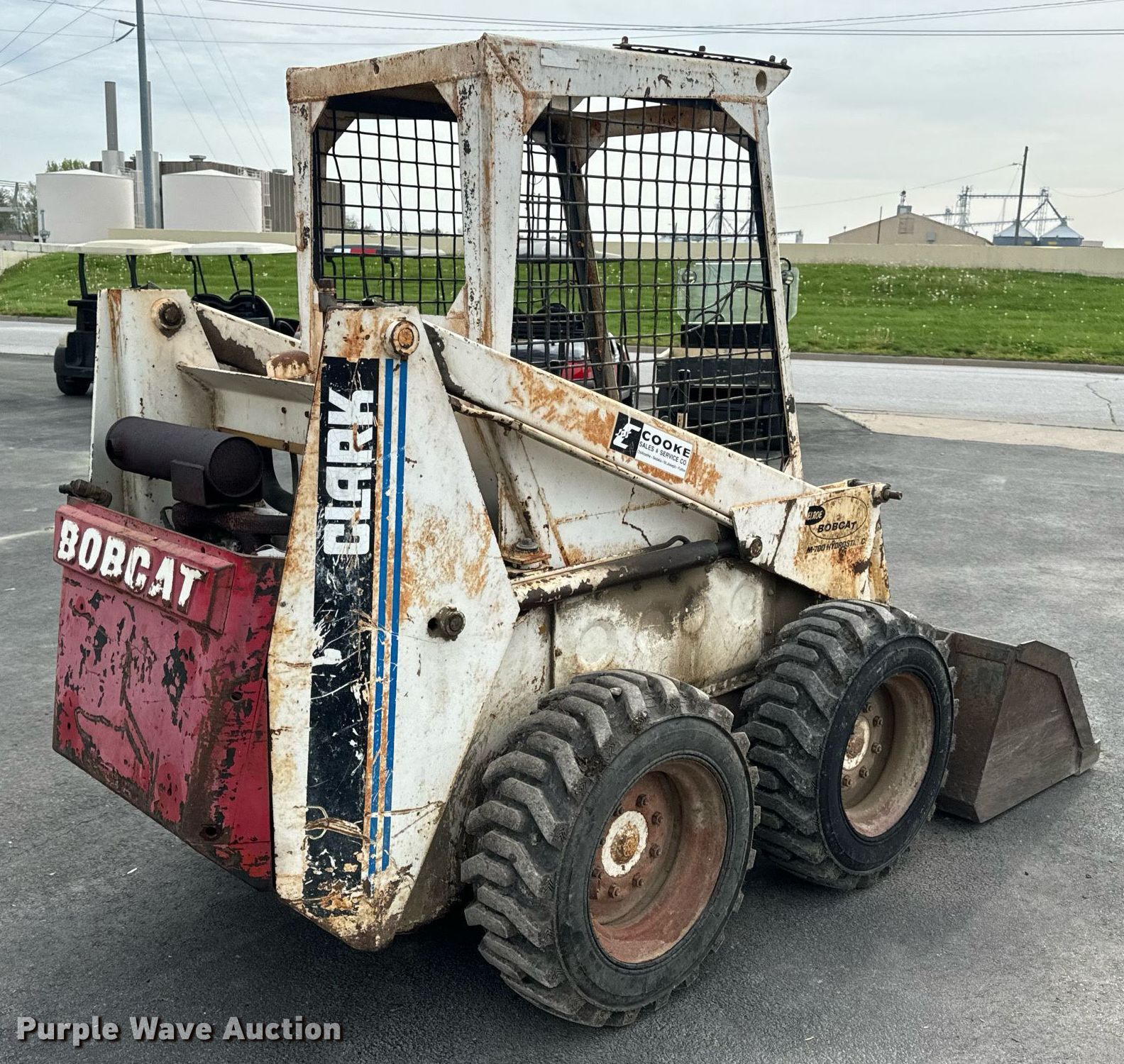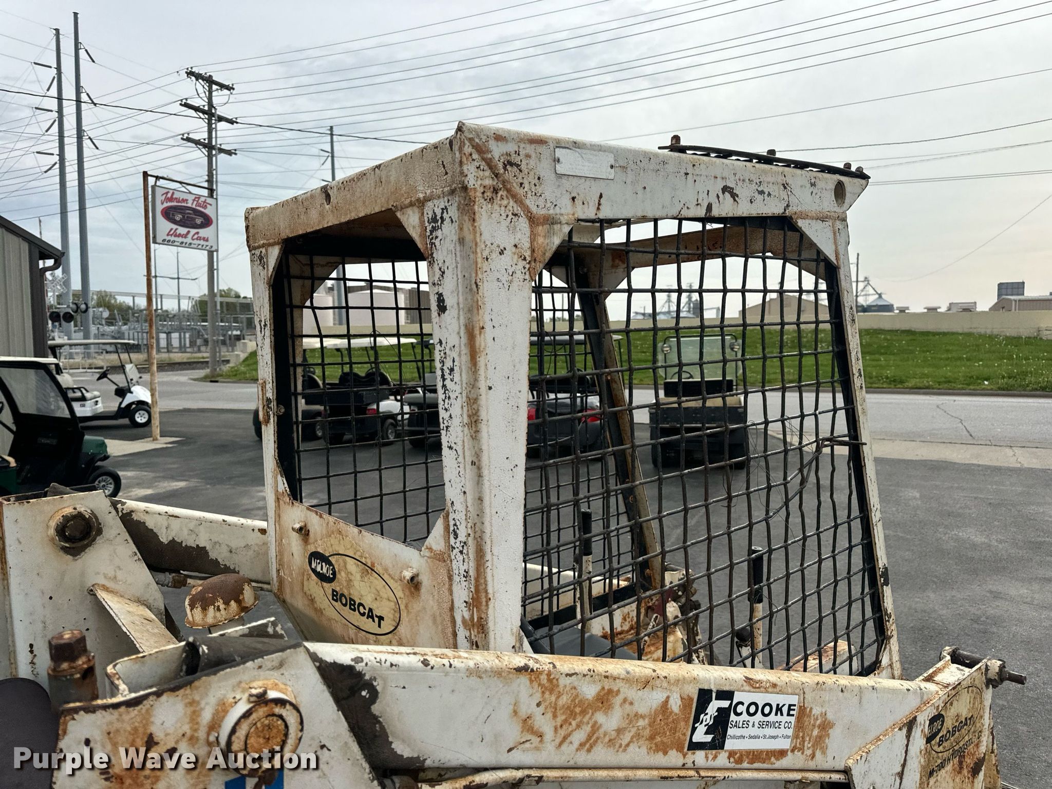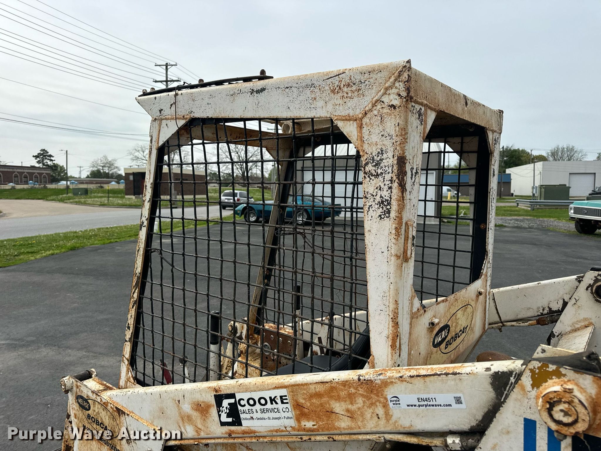Bobcat M-700 skid steer loader. Hours: 2,230 on meter, Serial: 4957-C-1364UGM. Engine Cylinders: 4, Fuel type: Gas. Transmission Hydrostatic. Operators station Bucket control: Foot. Features Auxiliary hydraulics, Quick coupler: Manual, Bucket Width: 61", Cutting edge: Weld-on, Forks Length: 36", Box blade Width: 73", Cutting edge: Bolt-on. Tires Size: 10-16.5. Notes Box blade cutting edge damaged, Bucket damaged, cracked, Hydraulic leak, Hydraulic hoses damaged, cracking. Johnson Auto Used Cars & Golf Carts. Marshall, MO 65340