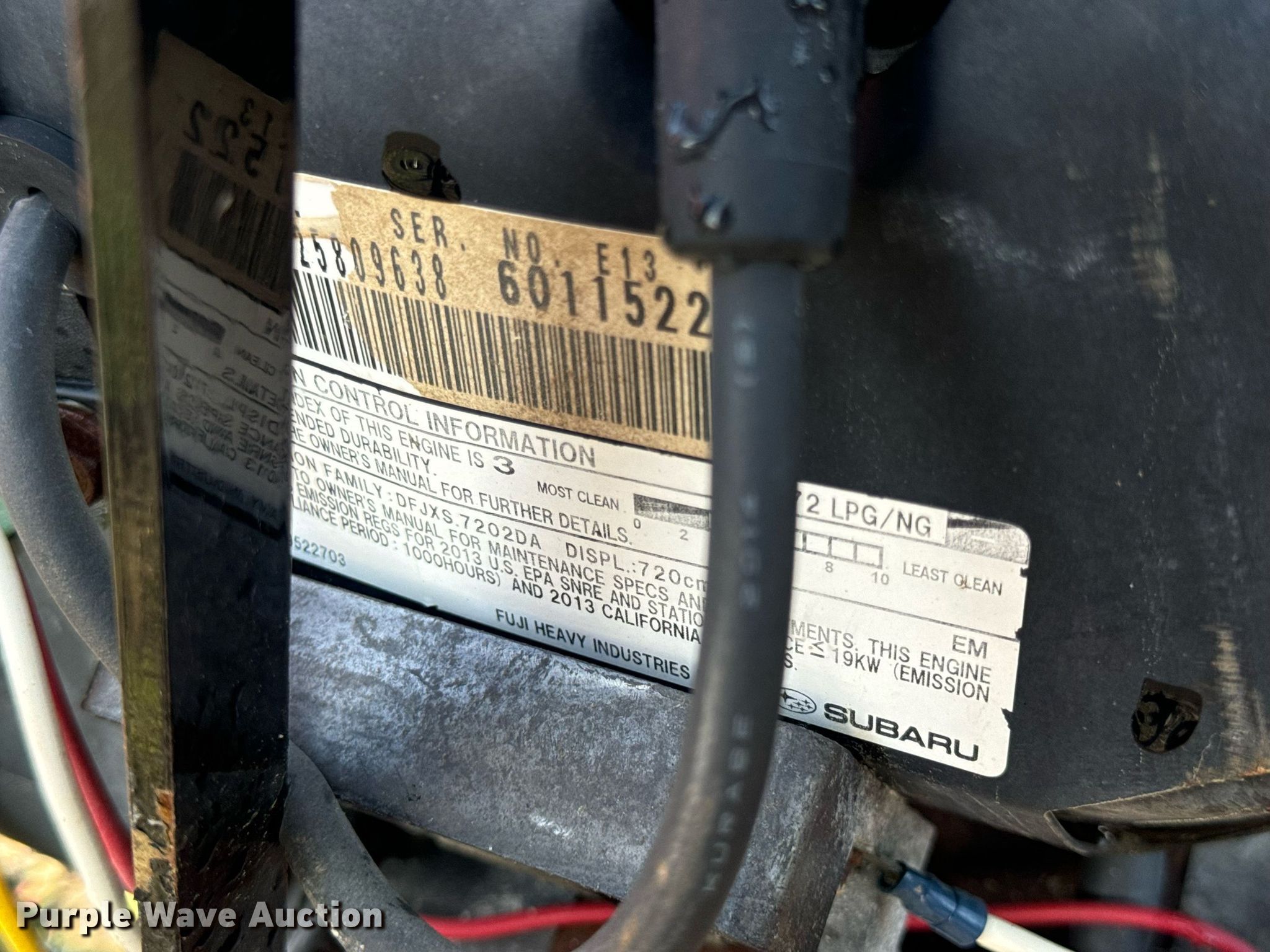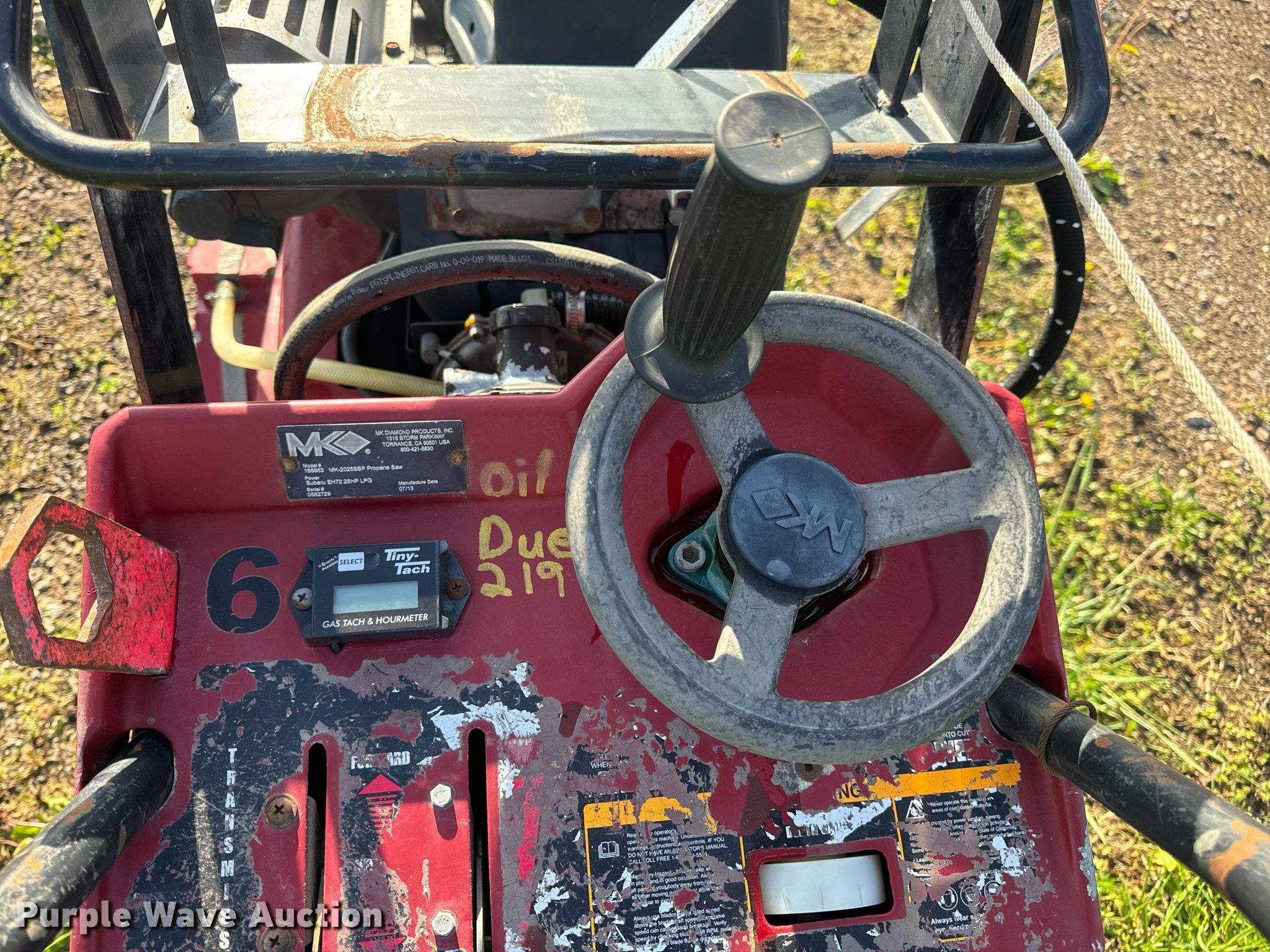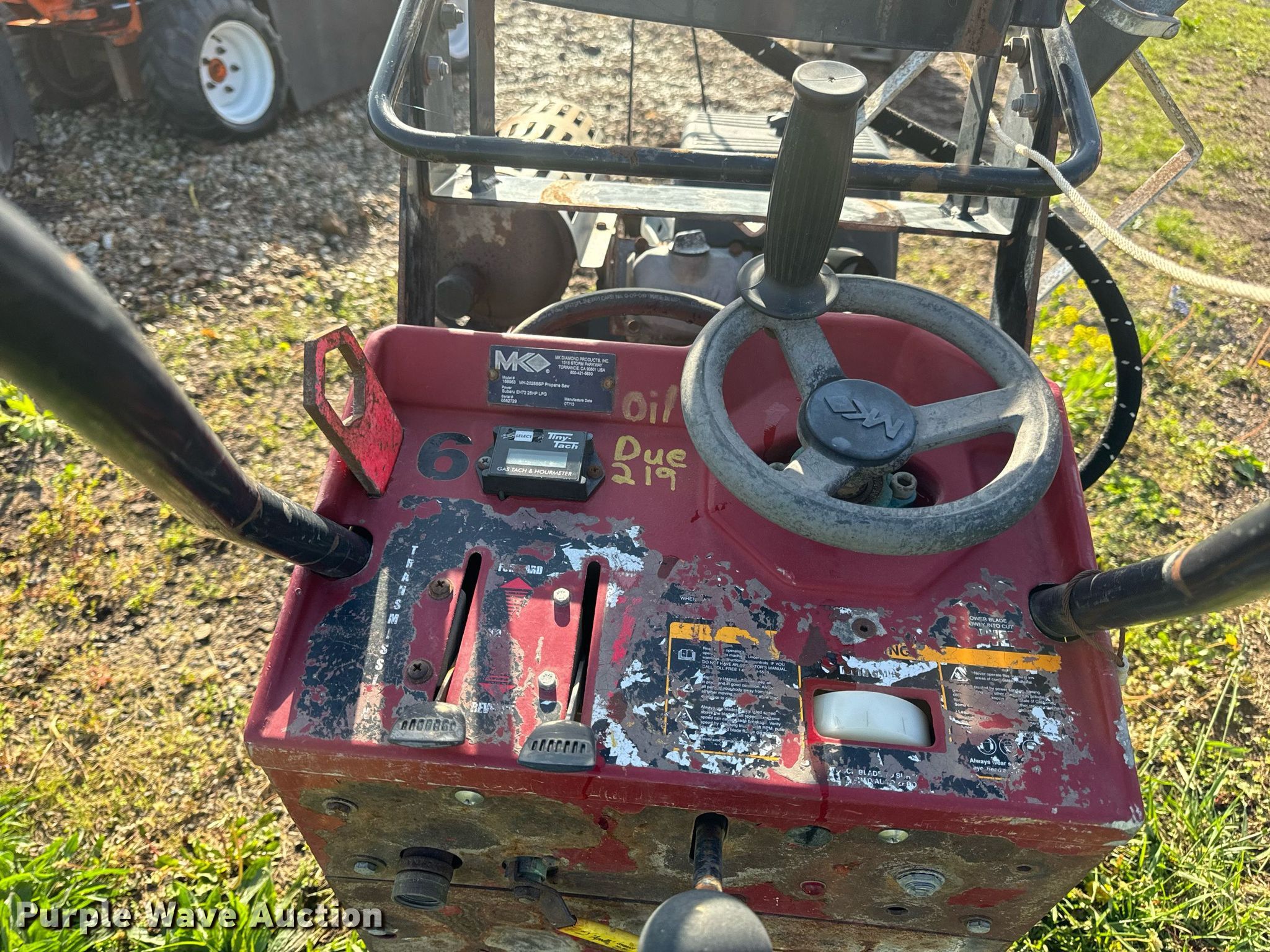 2013 MK Diamond MK-2025SSP concrete saw. Hours: Unknown, Serial: 0582729. Engine Subaru, Serial: 6011522, Cylinders: 2, Fuel type: LPG LP bottle: Not included. Transmission Hydrostatic. Features Blade capacity: 20". Notes Dead battery, Non-operational hour meter, Unknown operating condition. T&R Equipment. New Bloomfield, MO 65080