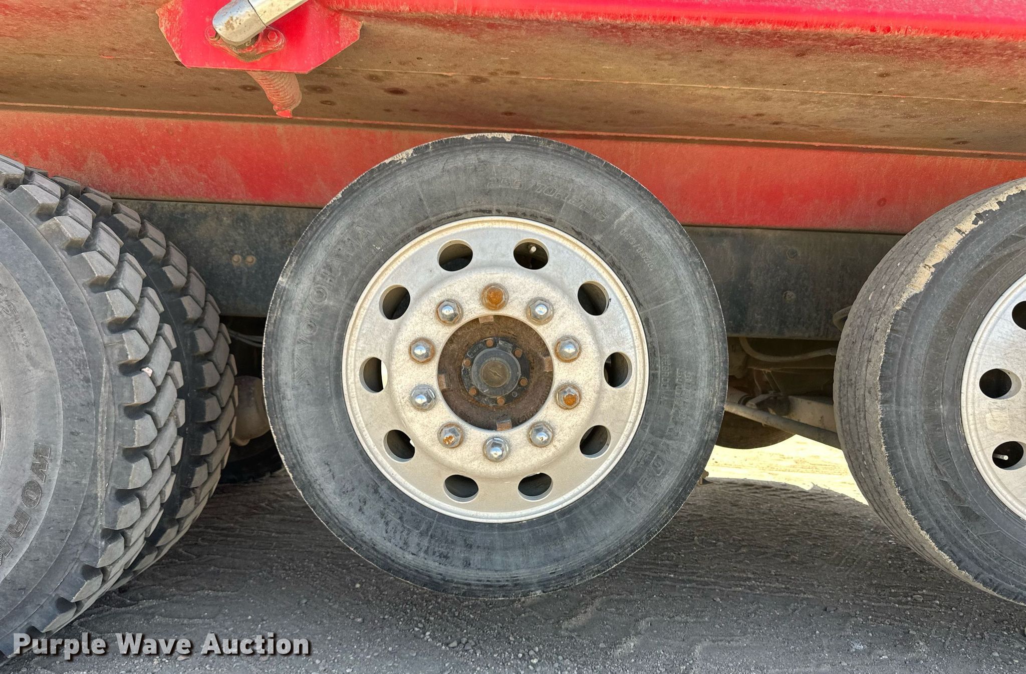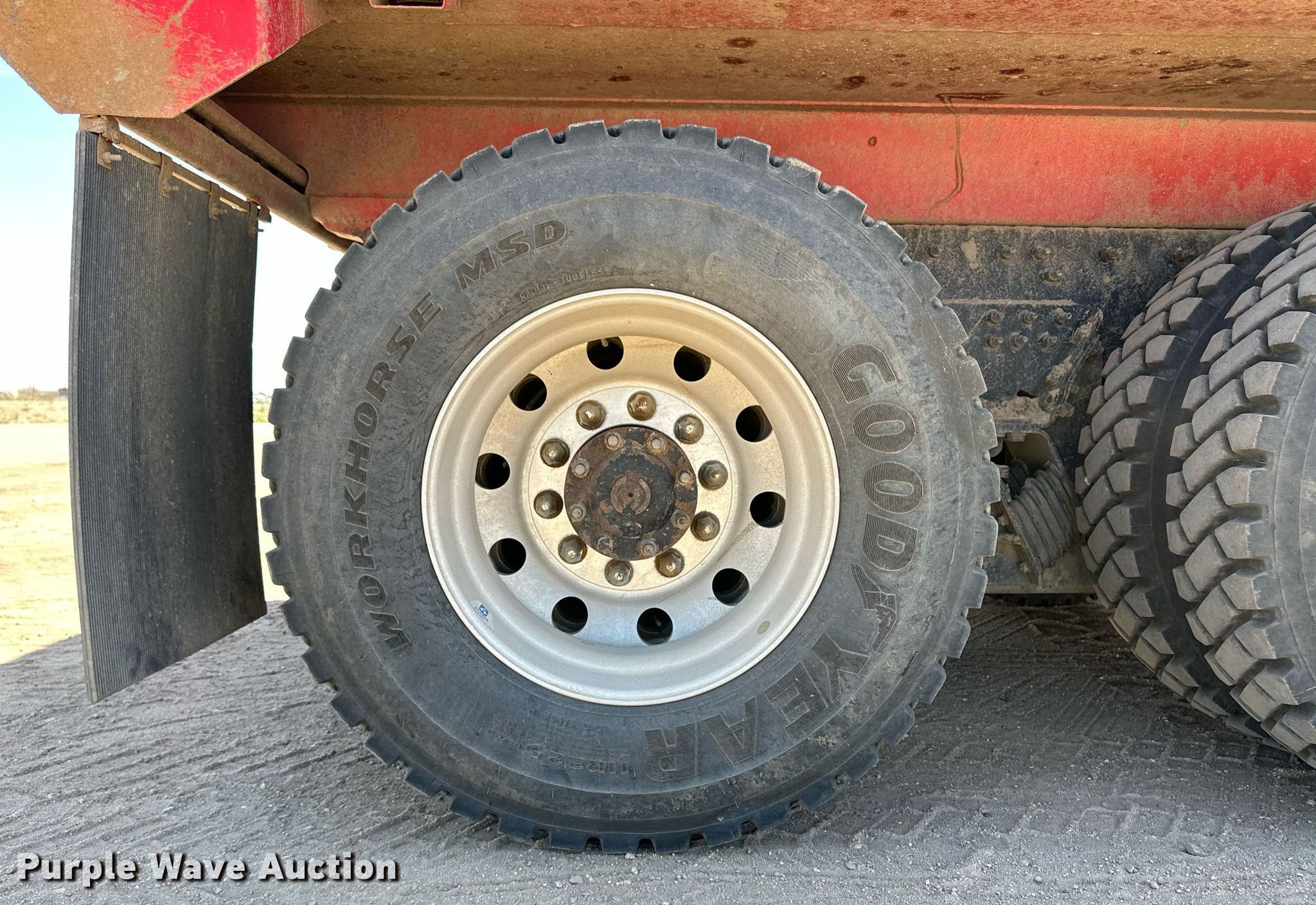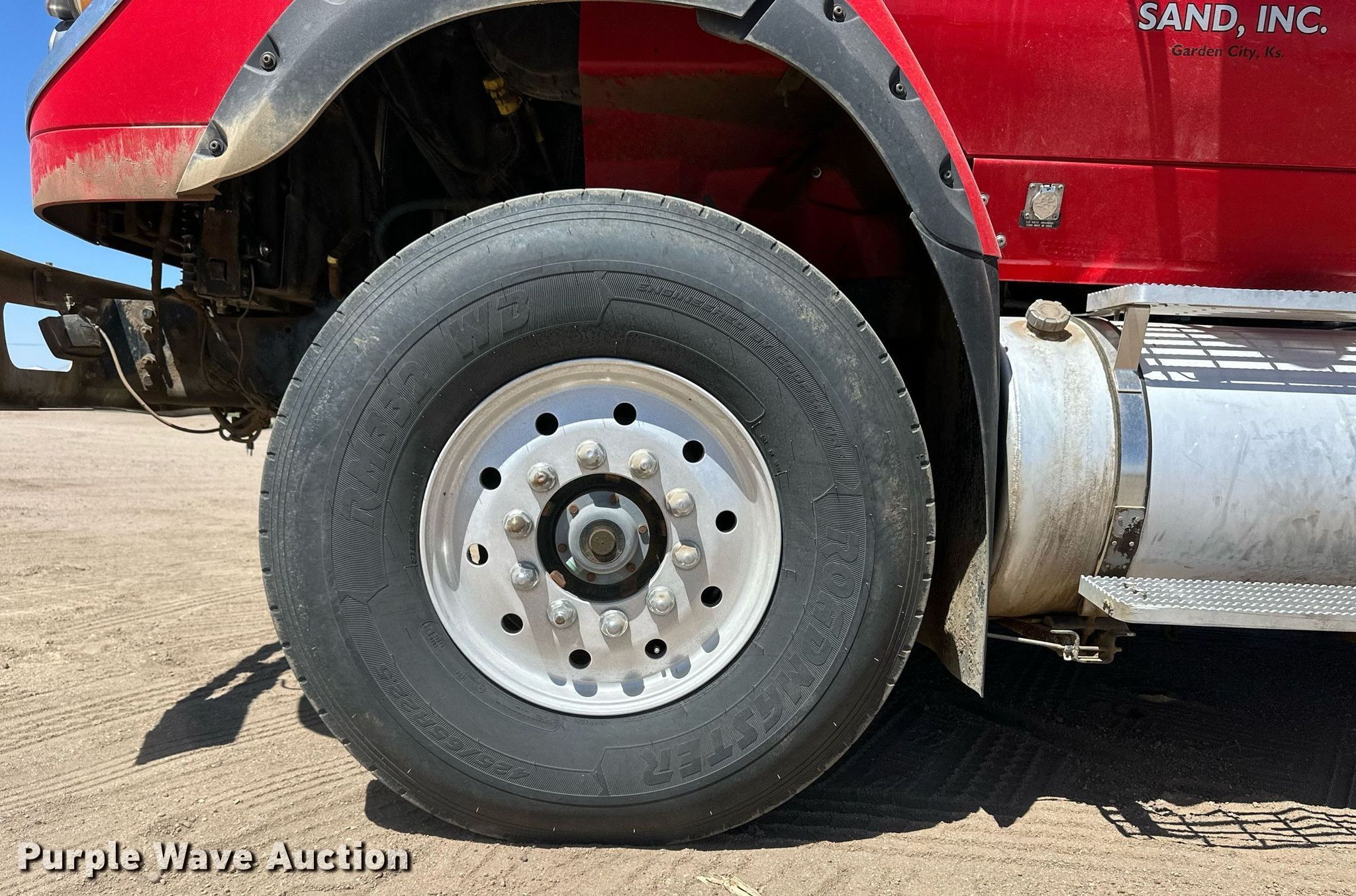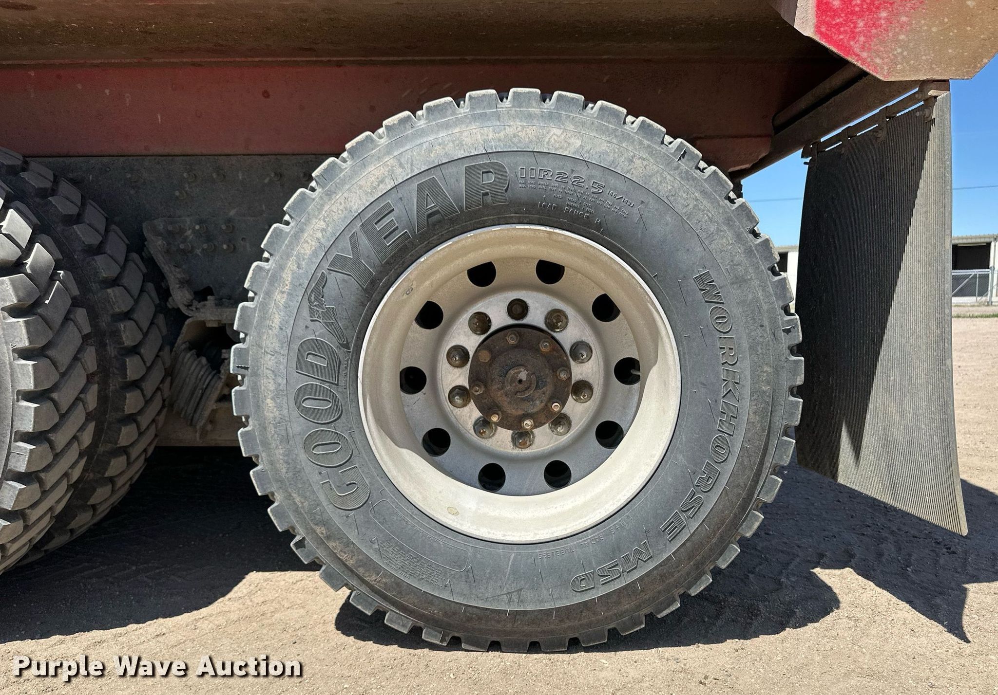 2013 International WorkStar 7600 dump truck. Miles: 691,572 on odometer, Hours: 21,515 on meter, VIN: 1HTGSSJT5DJ235512. Engine International, Displacement: 13L, Cylinders: 6, Fuel type: Diesel. Transmission Eaton Fuller, Manual. Chassis Axles: 4, Pusher axle Steerable, Differential lock: Full, Suspension: Spring over walking beam, Brakes: Air, PTO, Wheelbase: 590". Interior AC, Heat, Heated mirrors, Power windows, Cruise control. Features Dump bed 18' L x 99" W, Bed type: Steel, Roll tarp, Ram: Single, End gate: Air operated. Tires Front: 425/65R22.5, Rear: 11R22.5, Lift axle: 255/70R22.5. Notes Dash warning indicator: Check engine, ABS. Kansas title. Title distribution may be delayed up to 14 days from verification of funds. Huber Sand Inc.. Garden City, KS 67846