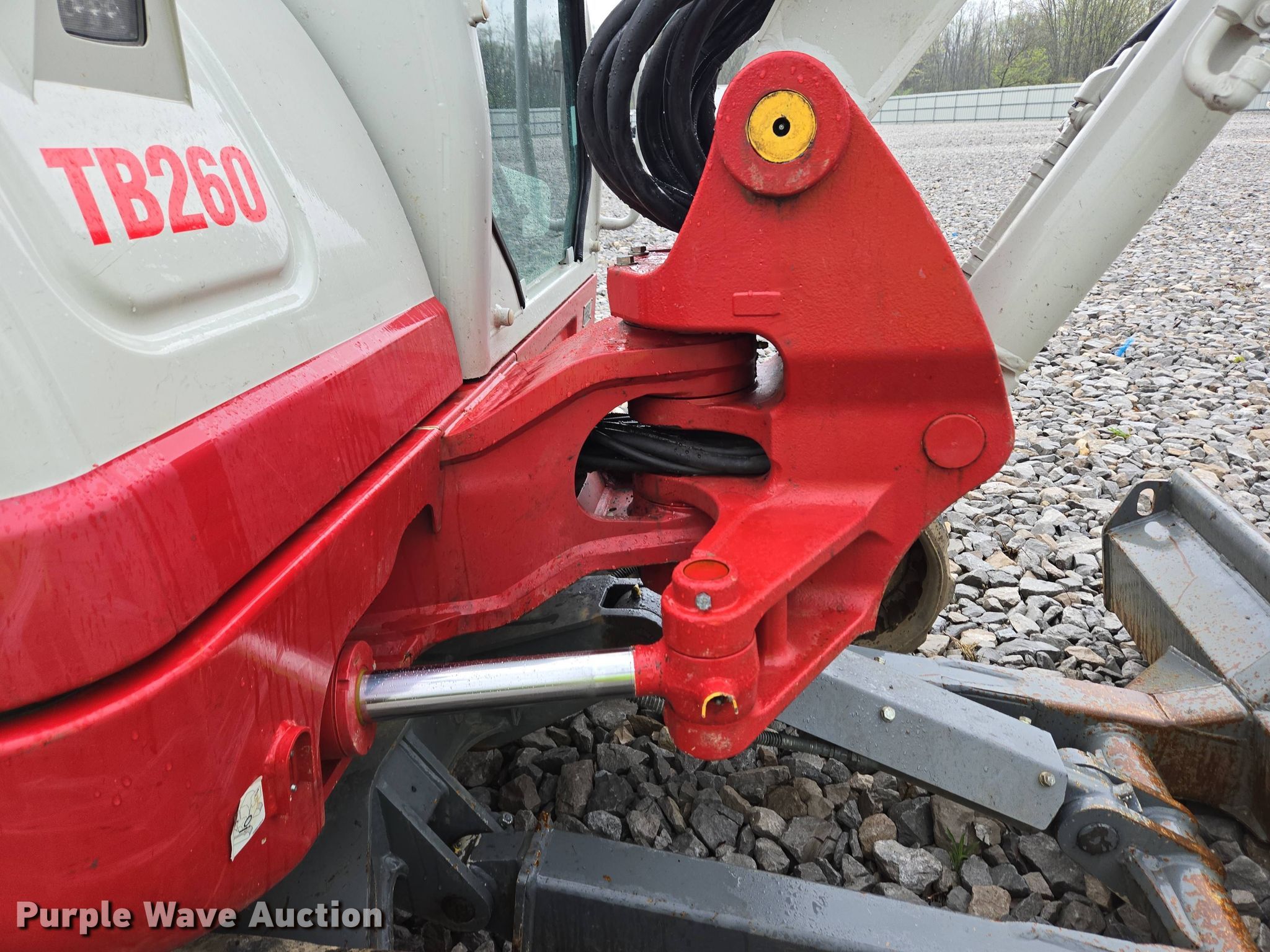 2022 Takeuchi TB260 mini excavator. Hours: 1,142 on meter, Serial: 126106927, Unit #: 54321295. Engine Yanmar, Cylinders: 3, Fuel type: Diesel. Transmission Hydrostatic, Two speed travel. Operators station Enclosed cab, AC, Heat, Pattern changer. Features Auxiliary hydraulics, Backfill blade Width: 78", Boom Swing, Stick Stick length: 5' 10", Quick coupler: Mechanical, Thumb: Hydraulic, Bucket Width: 19", Teeth: 4, Bucket Width: 12", Teeth: 3, Bucket Width: 37", Teeth: 6, Bucket Width: 49", Cutting edge: Bolt-on. Tracks Width: 15.5", Rubber. Repossessed item, stored at a secured facility. Please review REQUIRED REMOVAL INSTRUCTIONS. Lender Owned Asset. Barberton, OH 44203