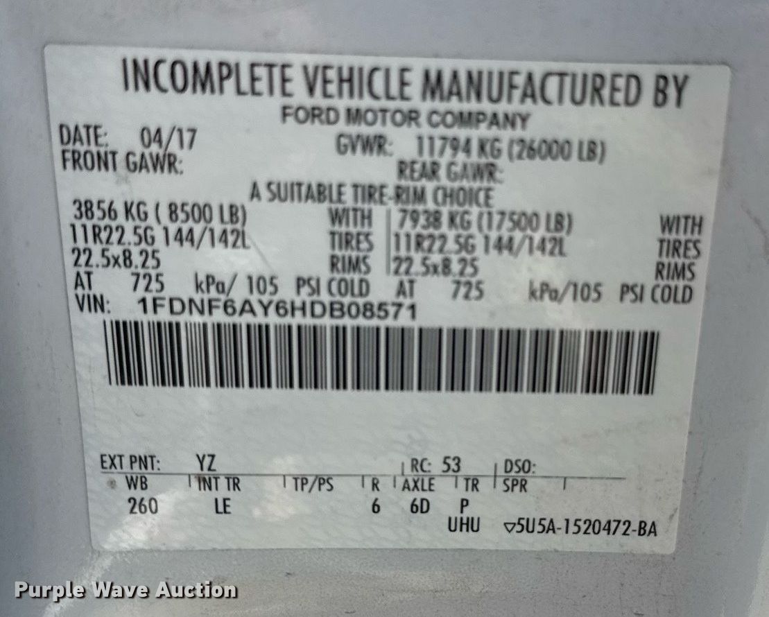 2017 Ford F650 refrigerated truck. Miles: 7,974 on odometer, Miles or hours may vary, unit still in use, VIN: 1FDNF6AY6HDB08571. Engine Displacement: 6.8L, Cylinders: 10, Fuel type: Gas. Transmission Automatic. Chassis Axles: Single, Suspension: Spring, Brakes: Hydraulic. Interior AC, Heat, Heated mirrors, Cruise control. Features Box bed Morgan GVSR09122096, 20' L x 96" W x 12' H, Floor: Aluminum, End gate lift, Tommy Gate CO 00623557, Refrigeration unit Thermoking.. Tires Size: 11R22.5. Kansas title. Lawrence, KS 66044