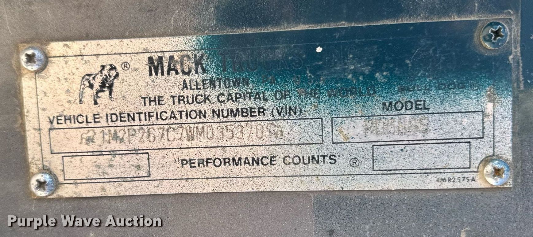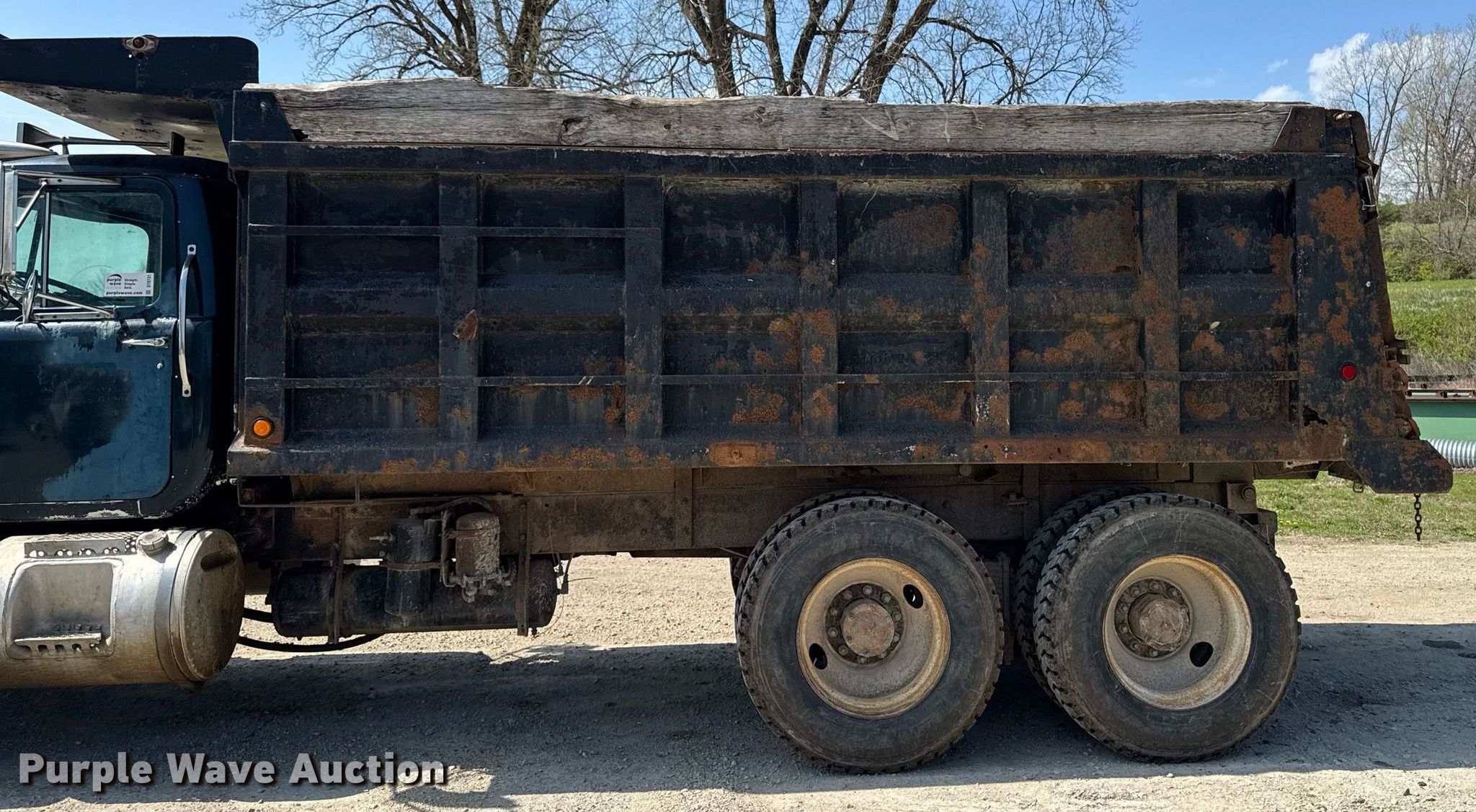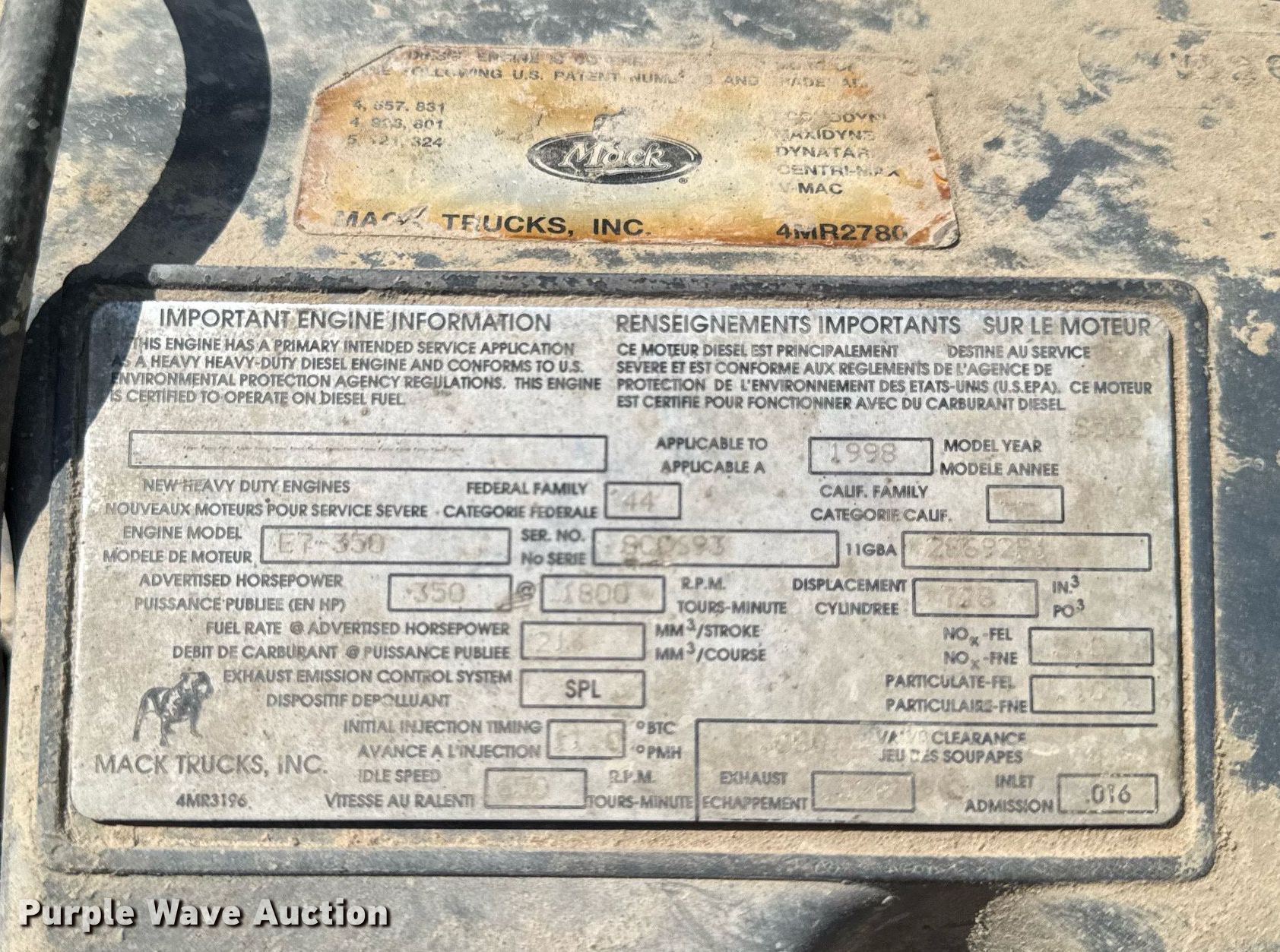 1998 Mack RD688S dump truck. Miles: 499,554 on odometer, Hours: 28,377 on meter, VIN: 1M2P267C7WM035370. Engine Mack E7-350, Displacement: 12.0L, Cylinders: 6, Fuel type: Diesel, HP: 350, Engine brake. Transmission Eaton Fuller 8LL, Manual, Speed: 10. Chassis Double frame, Axles: Tandem, Suspension: Camelback, Brakes: Air, PTO. Interior AC, Heat, Heated mirrors. Features Dump bed 17' L x 96" W, Side height: 63", Side board height: 12", Bed type: Steel, Roll tarp, Ram: Single, End gate: Air operated. Tires Front: 385/65R22.5, Rear: 11R24.5. Notes Windshield chipped or cracked, Dump bed issues, slow. Iowa title. Title distribution may be delayed up to 14 days from verification of funds. Decatur County Secondary Roads. Leon, IA 50144