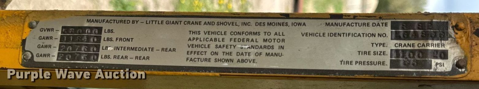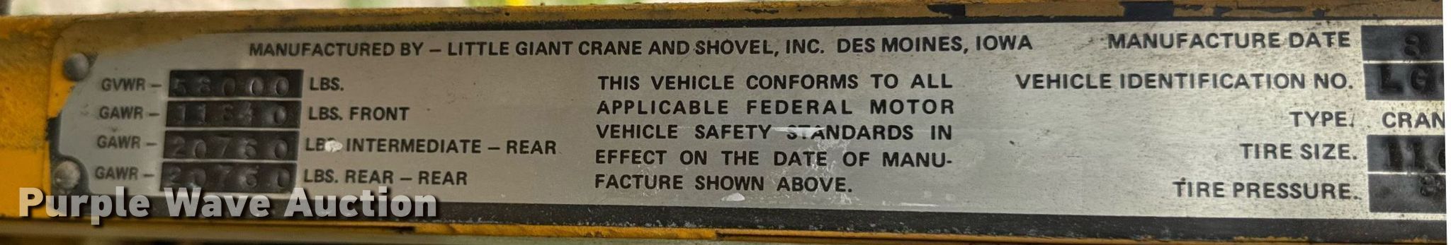 1982 Little Giant 48 crane. Miles: 3,563 on odometer, VIN: LG4866. Engine Detroit diesel, Serial: 6D211444, Cylinders: 8, Fuel type: Diesel. Transmission Manual, Speed: 10. Chassis Axles: Tandem, Brakes: Air. Features Boom, Maximum boom length: 50' Maximum lift capacity: 9,100 lbs, Boom controls Ground, Lift chart. Notes Dead battery, Non-operational hour meter, Non-operational unit Unit partially disassembled, parts may be missing. This is worksite support equipment and will not come with a title. Transfer of ownership documentation will be a bill of sale. Decatur County Secondary Roads. Leon, IA 50144