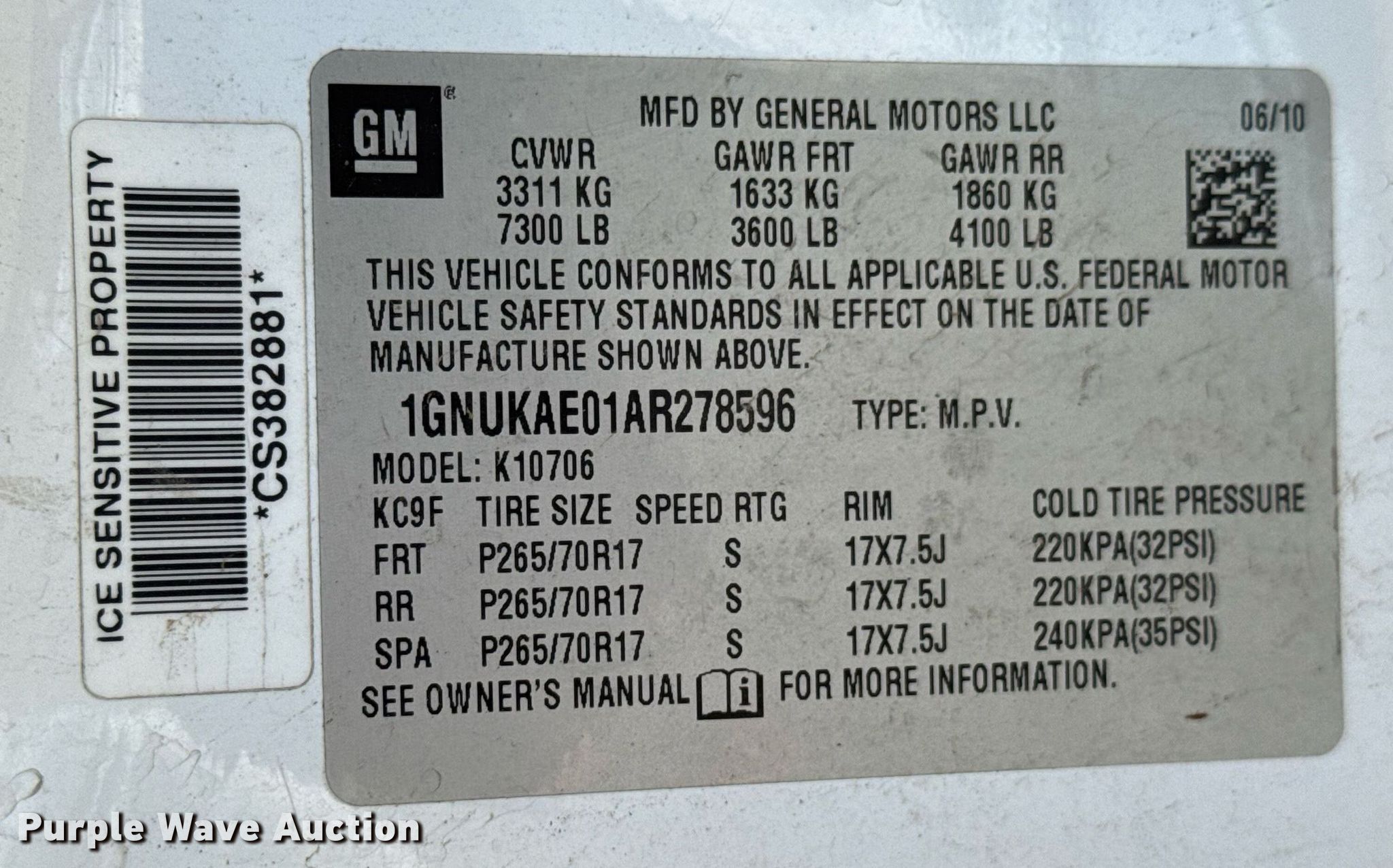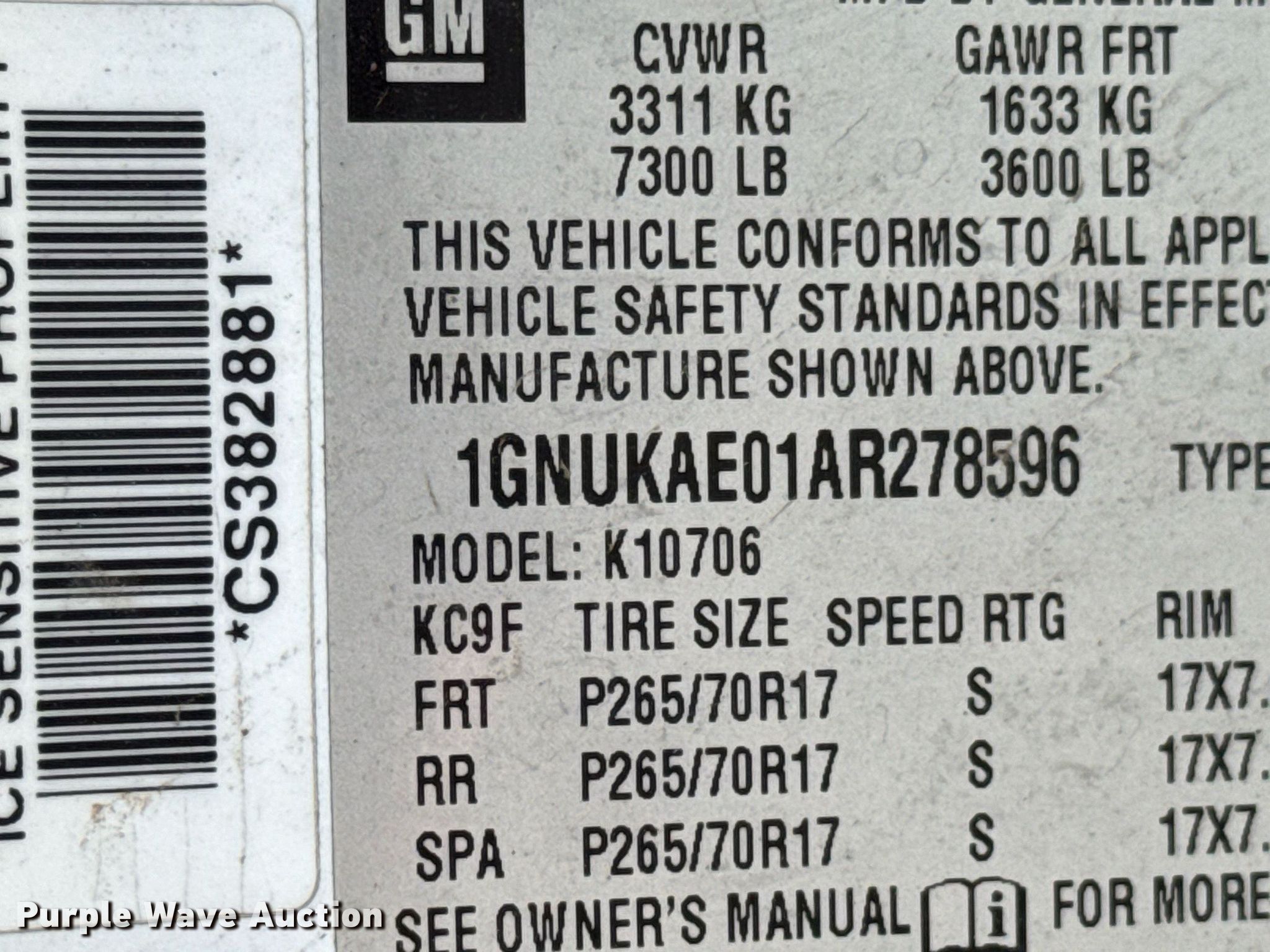 - VIN: 1GNUKAE01AR278596
