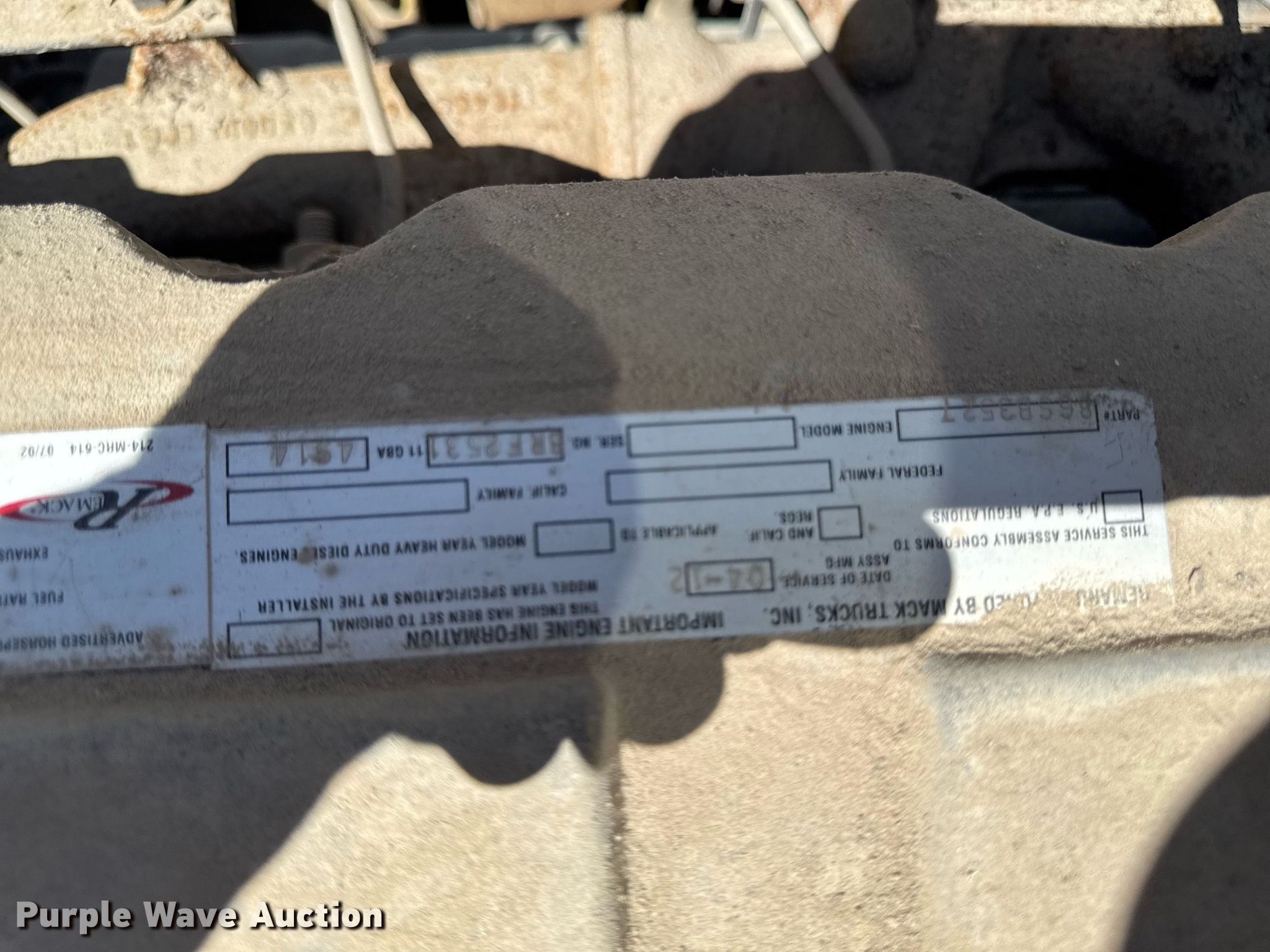 2000 Mack RD688S dump truck. Miles: 503,853 on odometer, Hours: 18,145 on meter, VIN: 1M2P270C2YM051334. Engine Mack, Displacement: 12.0L, Cylinders: 6, Fuel type: Diesel. Transmission Eaton fuller, Manual, Speed: 10. Chassis Double frame, Suspension: Camelback, Brakes: Air, Dual PTO. Interior AC, Heat, Cruise control. Features Dump bed 14' L x 96" W, Side height: 42", Bed type: Steel, Ram: Single, End gate: Air operated. Tires Size: 11R22.5. Notes Windshield chipped or cracked, Dead battery, Parts missing, Rear axles missing, Rodent damage, Non-operational unit Unit must be towed or hauled. Iowa title. Title distribution may be delayed up to 14 days from verification of funds. Carroll County Secondary Roads. Carroll, IA 51401