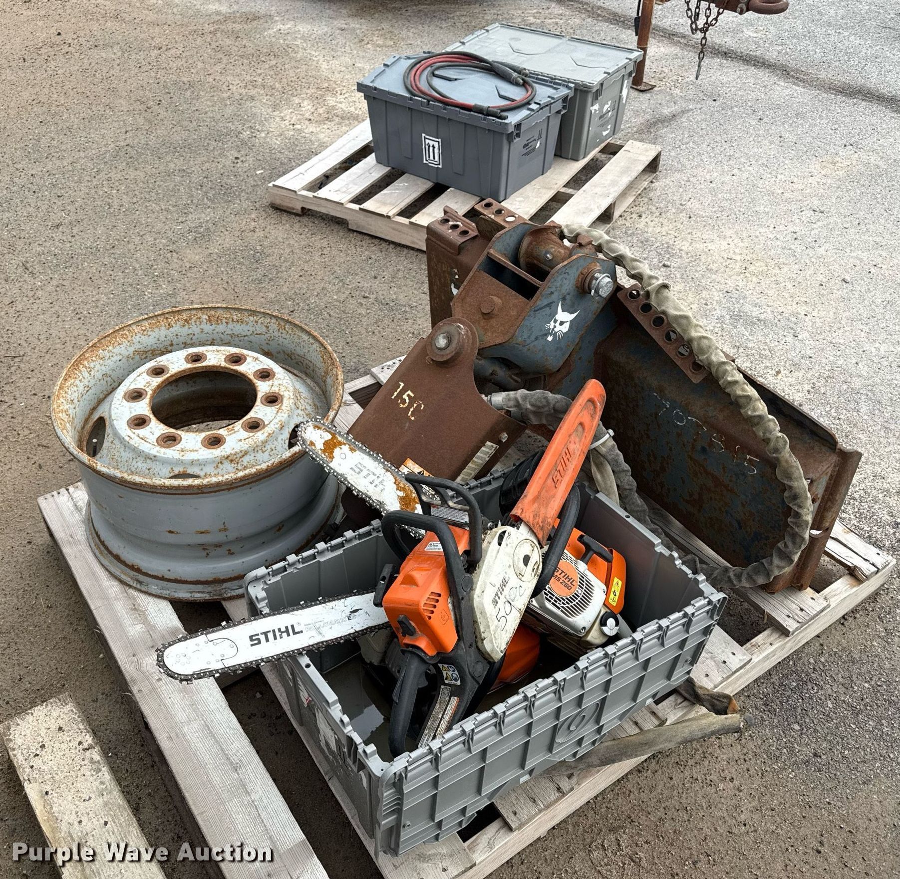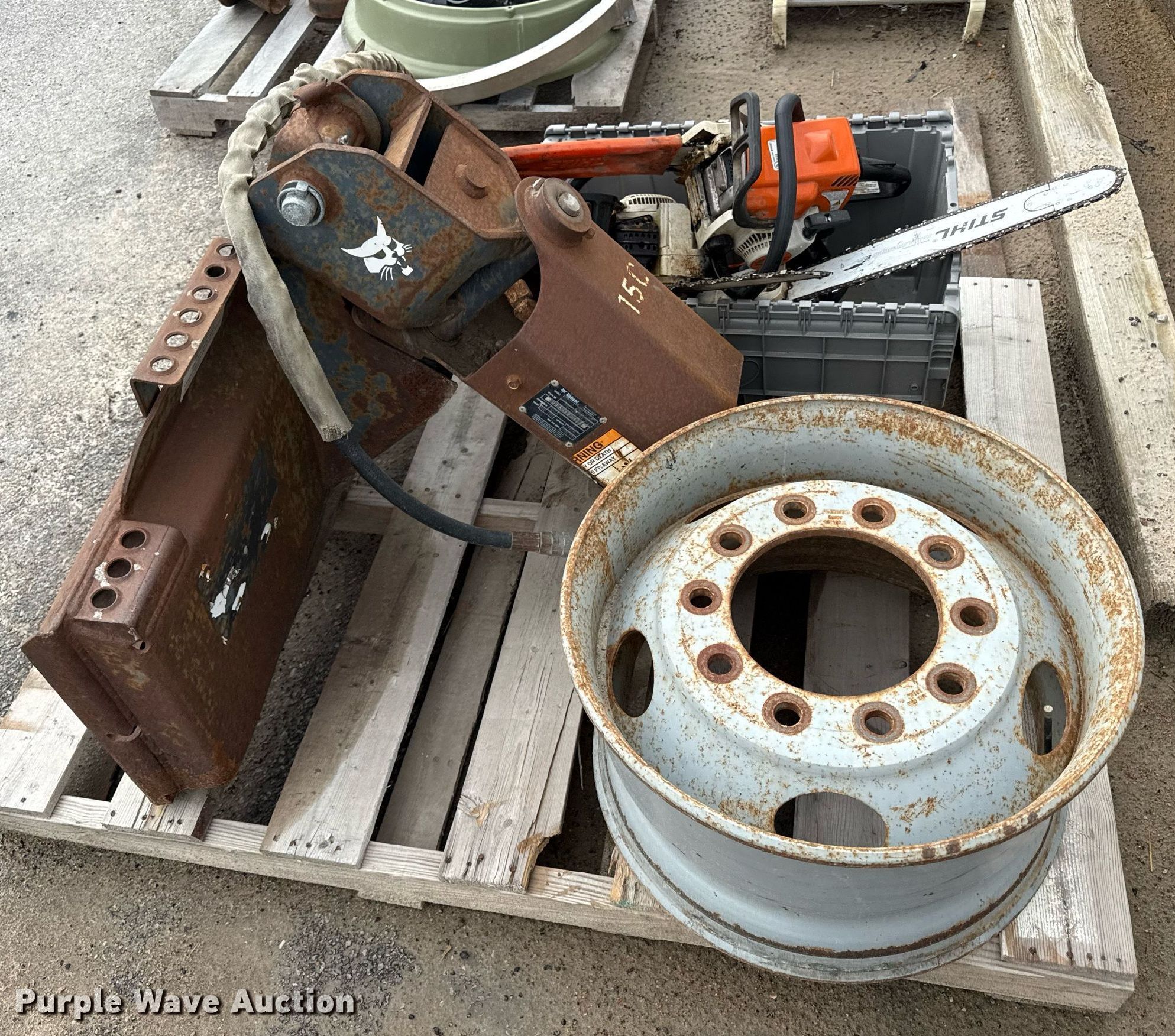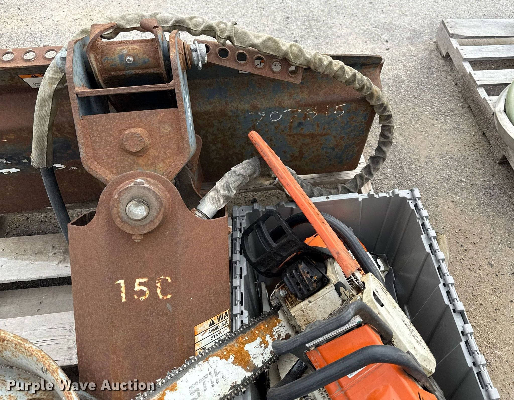 Purple Wave is selling a used Skid Steer Attach. in Kansas. This item is a Bobcat 15C skid steer auger with the following: Hardware, (3) Stihl chain saws, Unknown operating condition