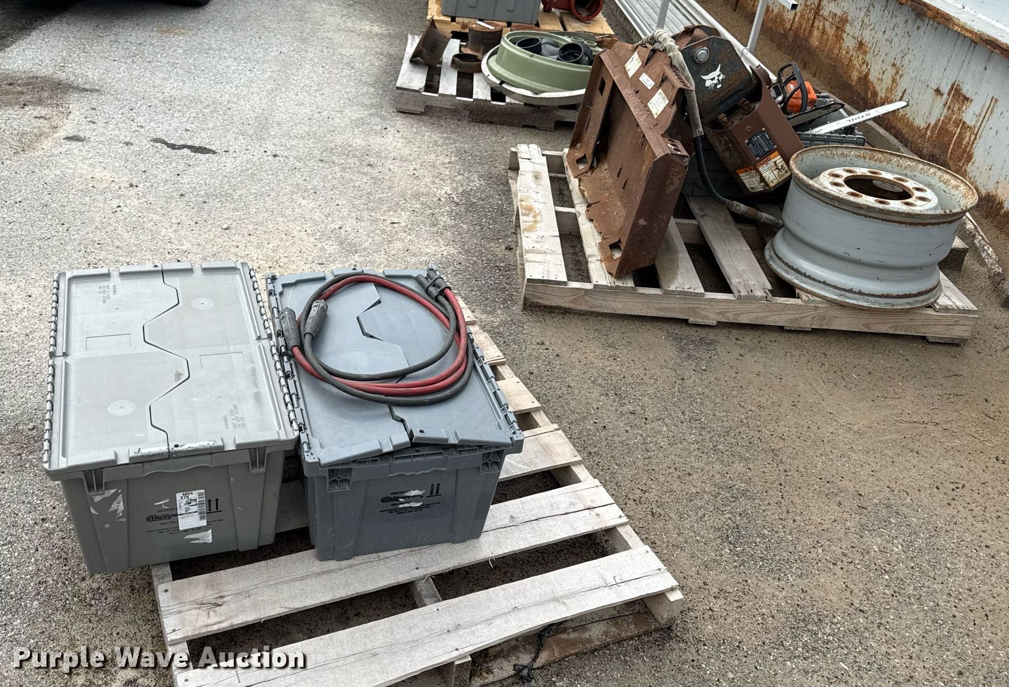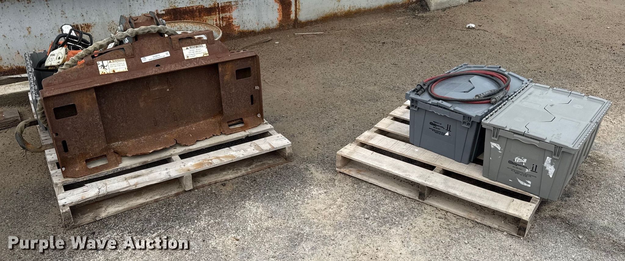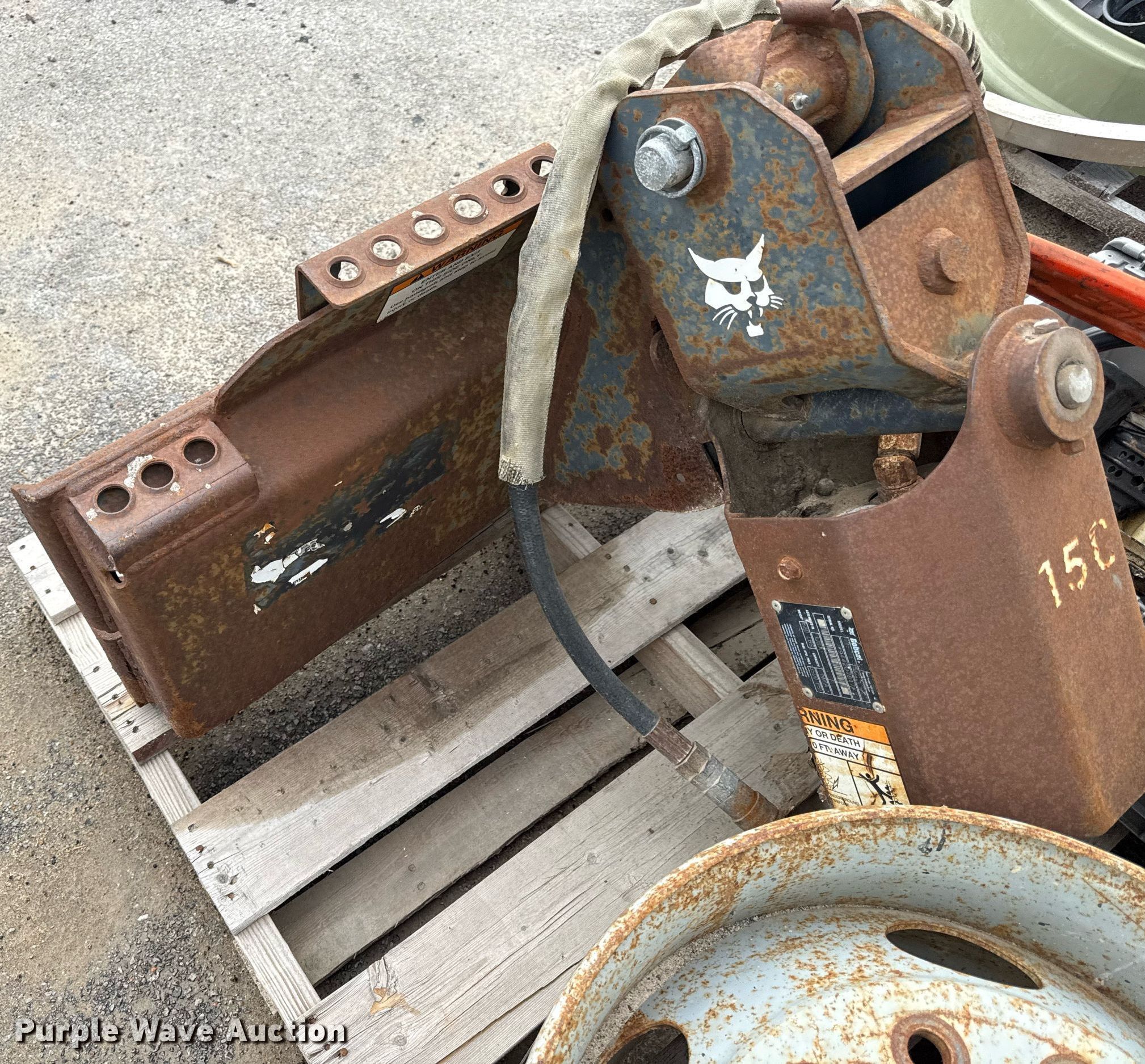 Purple Wave is selling a used Skid Steer Attach. in Kansas. This item is a Bobcat 15C skid steer auger with the following: Hardware, (3) Stihl chain saws, Unknown operating condition