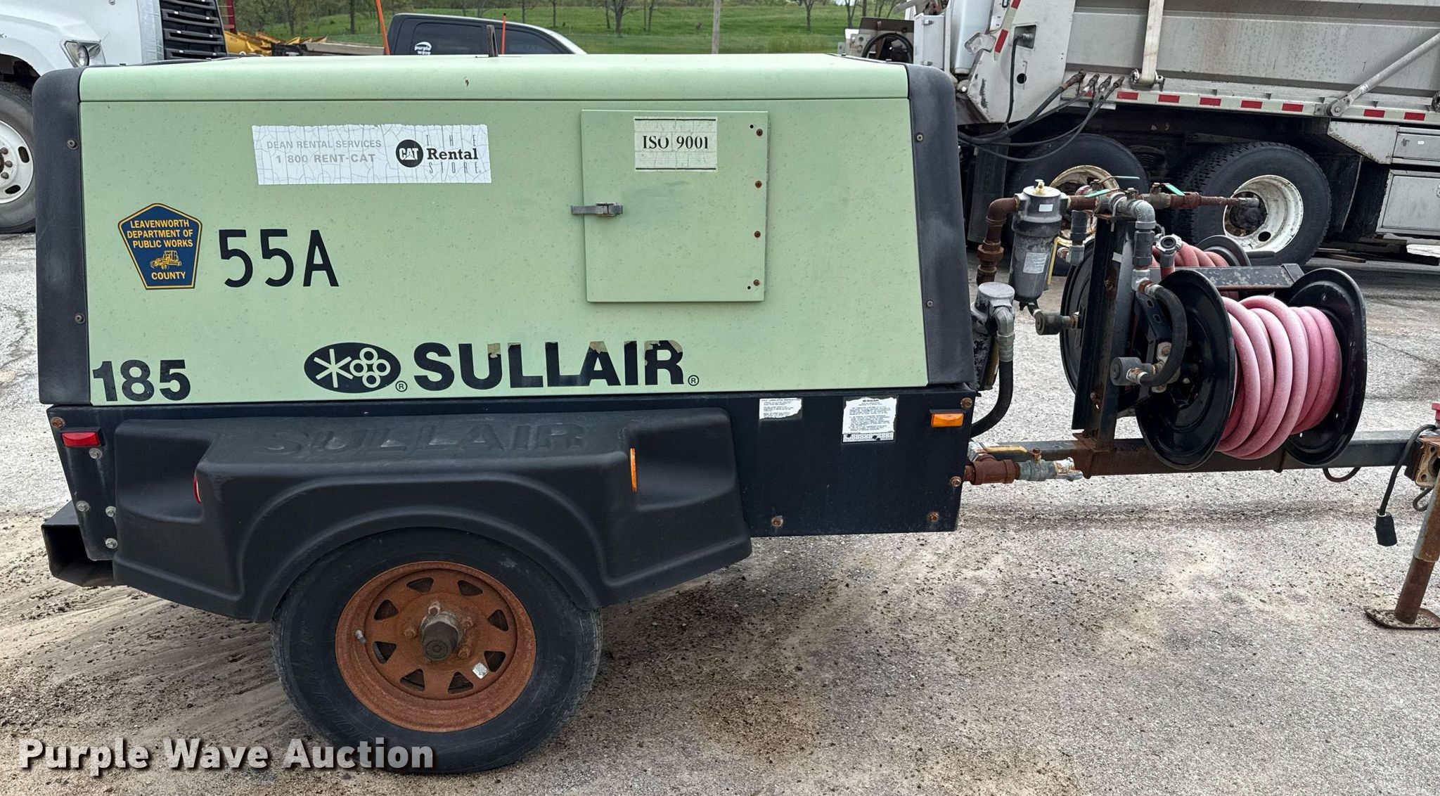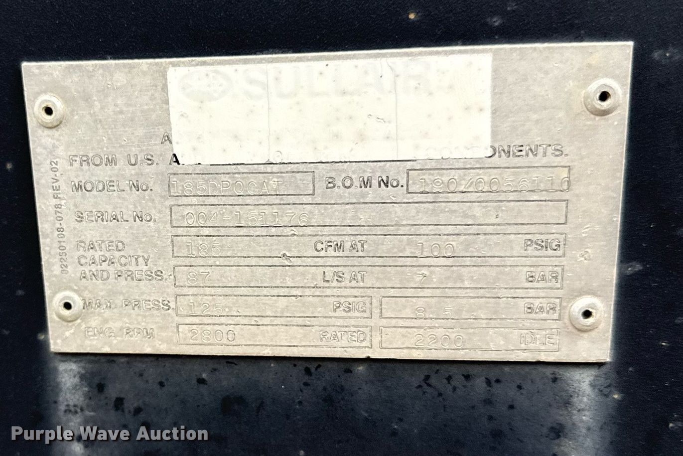 Sullair 185 air compressor. Hours: 546 on meter, VIN: 004151176. Engine Caterpillar, Cylinders: 4, Fuel type: Diesel. Features Air compressor Sullair, CFM: 185, PSI: 125. Trailer Suspension: Spring, Axles: Single, Tire size: 175/80R13. Notes Non-operational unit. This is worksite support equipment and will not come with a title. Transfer of ownership documentation will be a bill of sale. Leavenworth County. Leavenworth, KS 66048