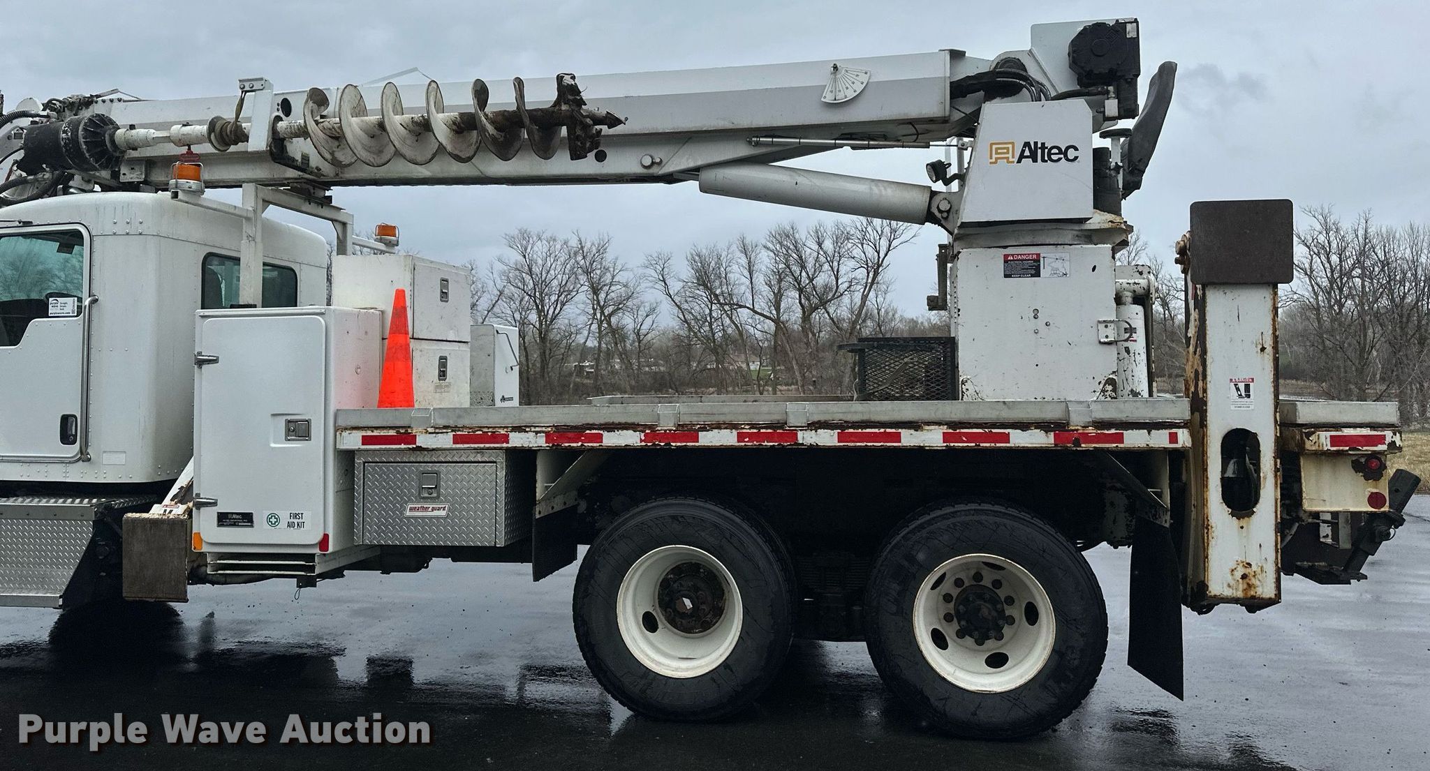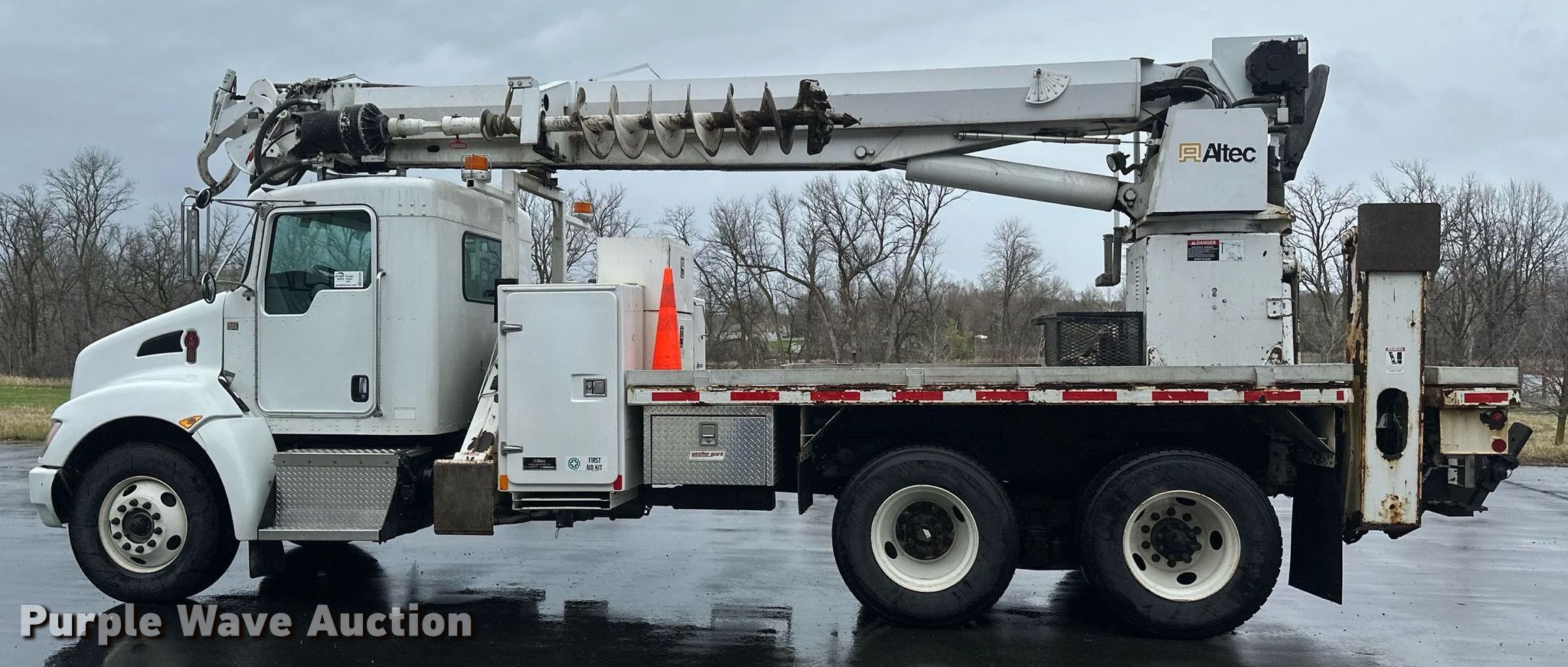 2009 Kenworth T370 digger derrick truck. Miles: 114,201 on odometer, VIN: 2NKHLN9X09M249775. Engine Paccar PX-8, Displacement: 8.3L, Cylinders: 6, Fuel type: Diesel. Transmission Allison 3500RDS, Automatic. Chassis Axles: Tandem, Suspension: Spring over walking beam, Brakes: Air, PTO, GVWR: 54,600 lbs. Interior AC, Heat, Power windows, Power locks, Cruise control, Auxiliary controls, Brake controller. Features Bed 18' L x 8' W, Boom Altec D4050A, Serial: 0708DF0278, Mast height: 40', Boom type: Articulating, Telescopic, Boom controls Platform/ basket, Material handler, Pole guide, Auger Diameter: 16".. Tires Front: 395/80R22.5, Rear: 11R22.5. Minnesota title. Title distribution may be delayed up to 14 days from verification of funds. Lake Region Electric Cooperative. Pelican Rapids, MN 56572