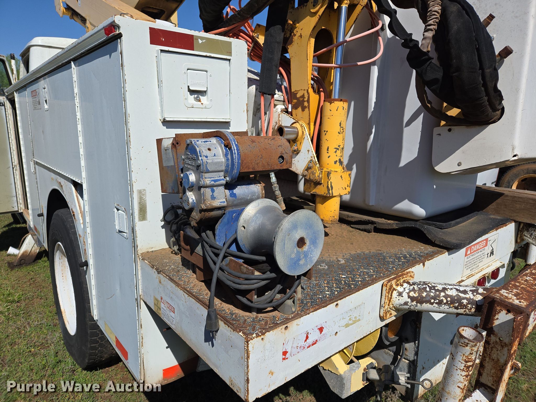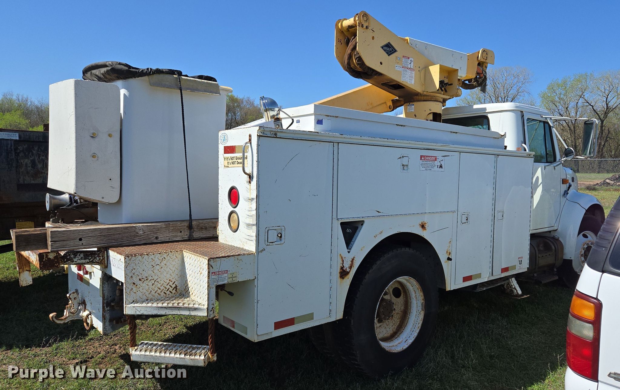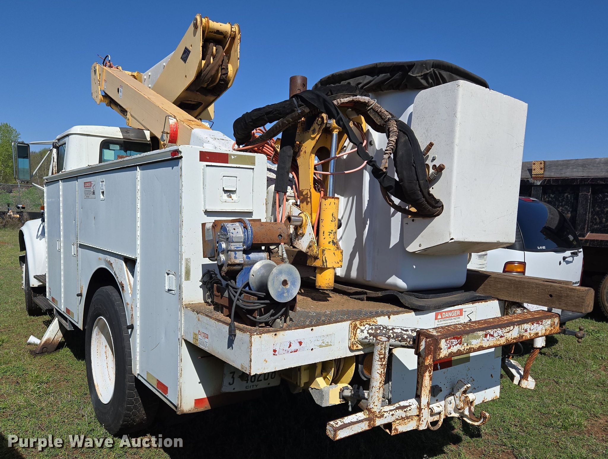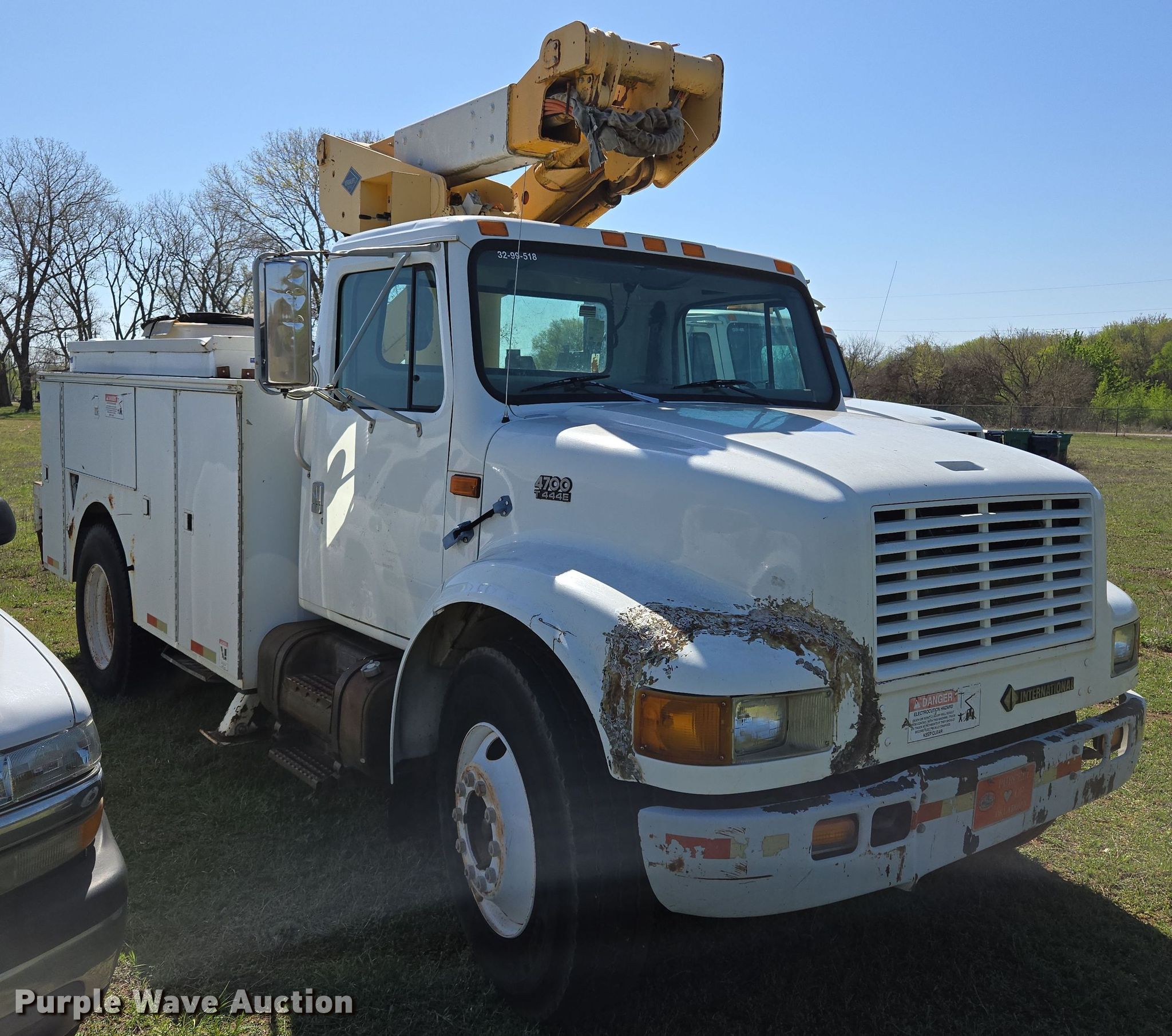 Purple Wave is selling a used Bucket Truck in Oklahoma. This item is a 2000 International 4700 bucket truck with the following: Miles: 79,806 on odometer, Hours: 11,132 on meter, VIN: 1HTSCABL1YH220518