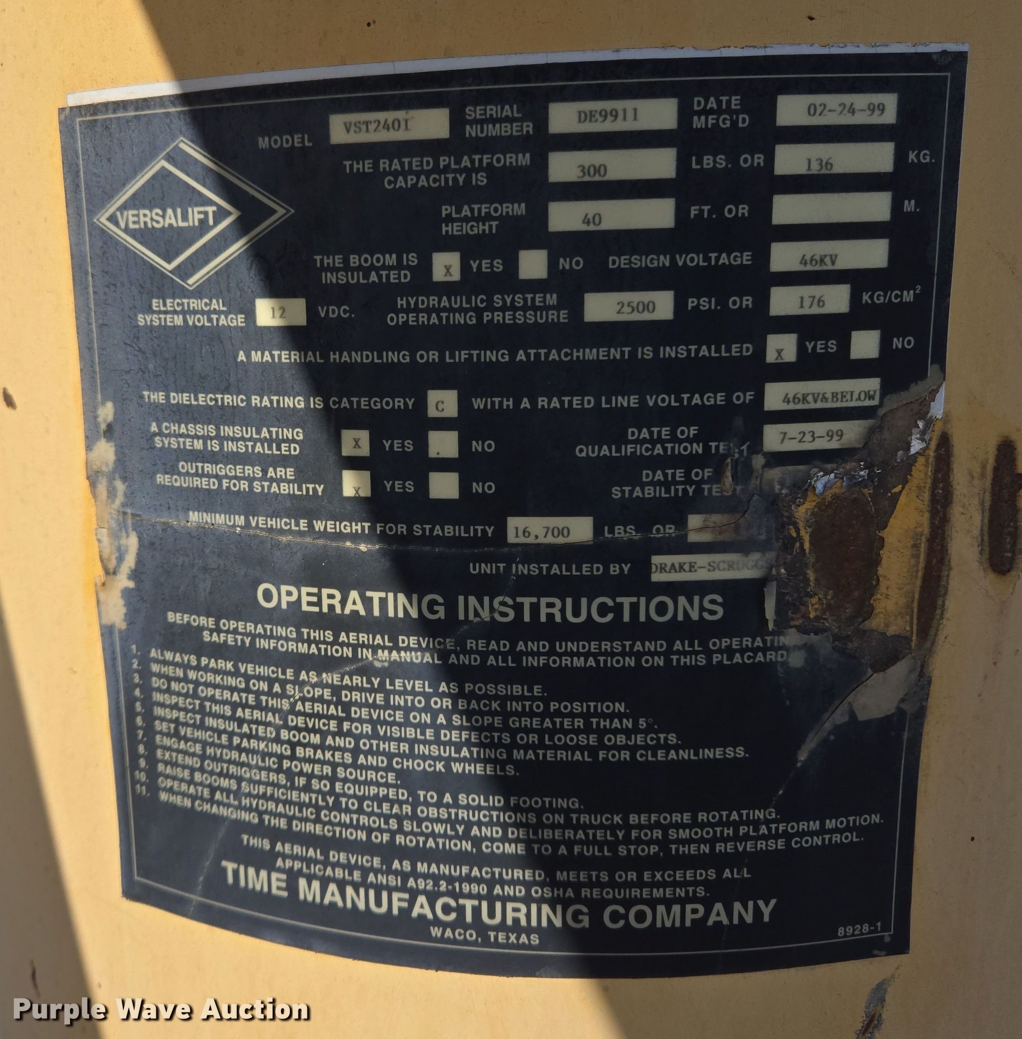 2000 International 4700 bucket truck. Miles: 79,806 on odometer, Hours: 11,132 on meter, VIN: 1HTSCABL1YH220518. Engine International, Displacement: 7.2L, Cylinders: 8, Fuel type: Diesel. Transmission Automatic. Chassis Axles: Single, Suspension: Spring, Brakes: Air, PTO, Wheelbase: 152". Interior AC, Heat, Cruise control, Auxiliary controls. Features Bed Knapheide, 13' L x 8' W, Boom 1999 Versalift VAT240I, Serial: DE9911, Boom length: 14', Mast height: 7', Maximum lift capacity: 300 lbs, Maximum lift height: 40', Boom type: Articulating, Telescopic, Man basket, Boom controls Ground, Platform/ basket.. Tires Size: 11R22.5. Notes Passenger door issues, does not shut, Windshield chipped or cracked, Dead battery, Batteries need replaced, Unknown operating condition of bucket, Unknown operating condition. Oklahoma classic title. Seller is a government entity who will be assigning and distributing the title. Please contact the seller for distribution questions. Title distribution may be delayed up to 14 days from verification of funds. City of Purcell. Purcell, OK 73080