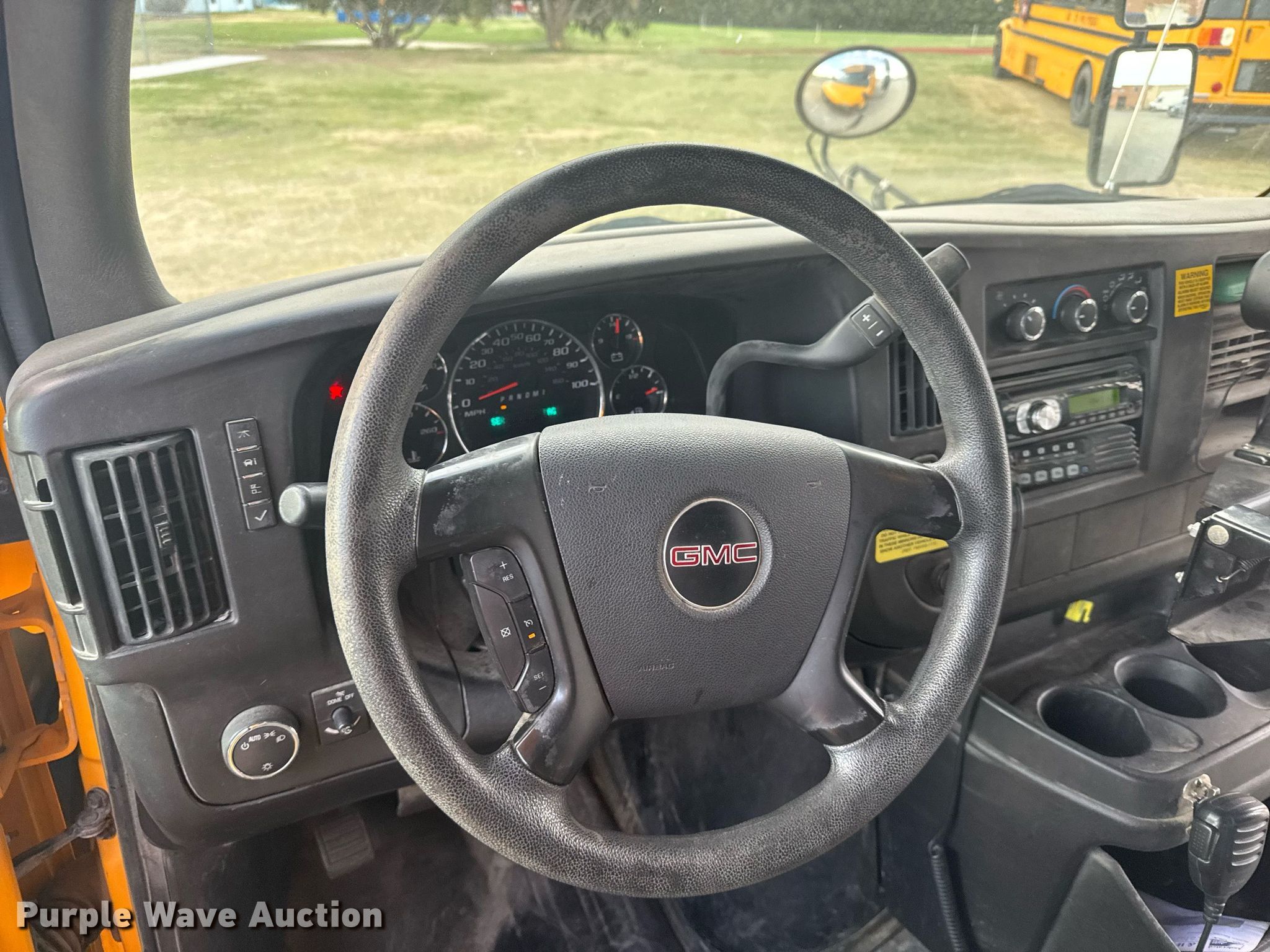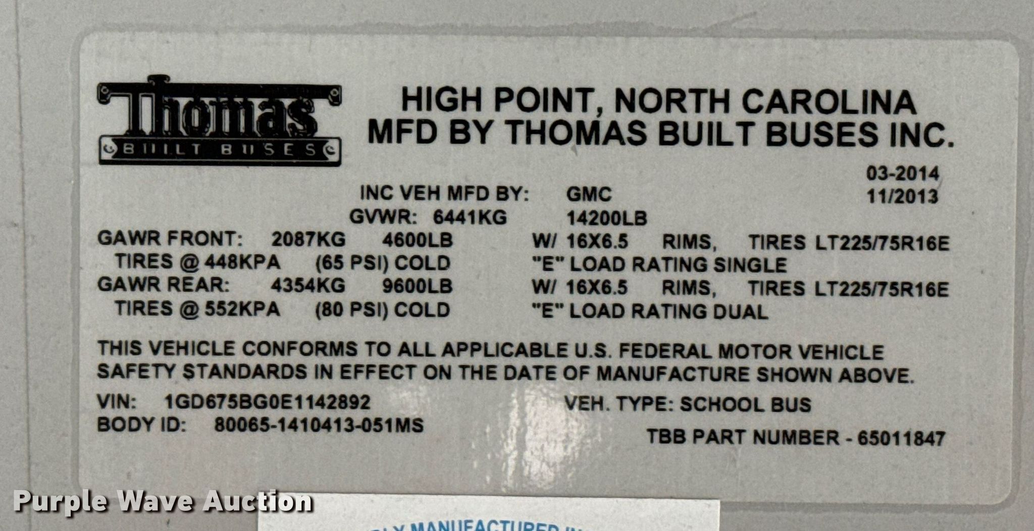 2015 Thomas Built Savana G4500 school bus. Miles: 114,016 on odometer, Hours: 4,825 on meter, VIN: 1GD675BG0E1142892. Engine Displacement: 6.0L, Cylinders: 8, Fuel type: Gas. Transmission Automatic. Chassis Axles: Single, Suspension: Spring, Brakes: Hydraulic, GVWR: 14,200 lbs. Interior AC, Heat, Heated mirrors, Cruise control, Passengers: 29. Tires Size: LT225/75R16. Notes Dash warning indicator: Airbag, Hail damage. Kansas title. Title distribution may be delayed up to 14 days from verification of funds. Phillipsburg, KS 67661