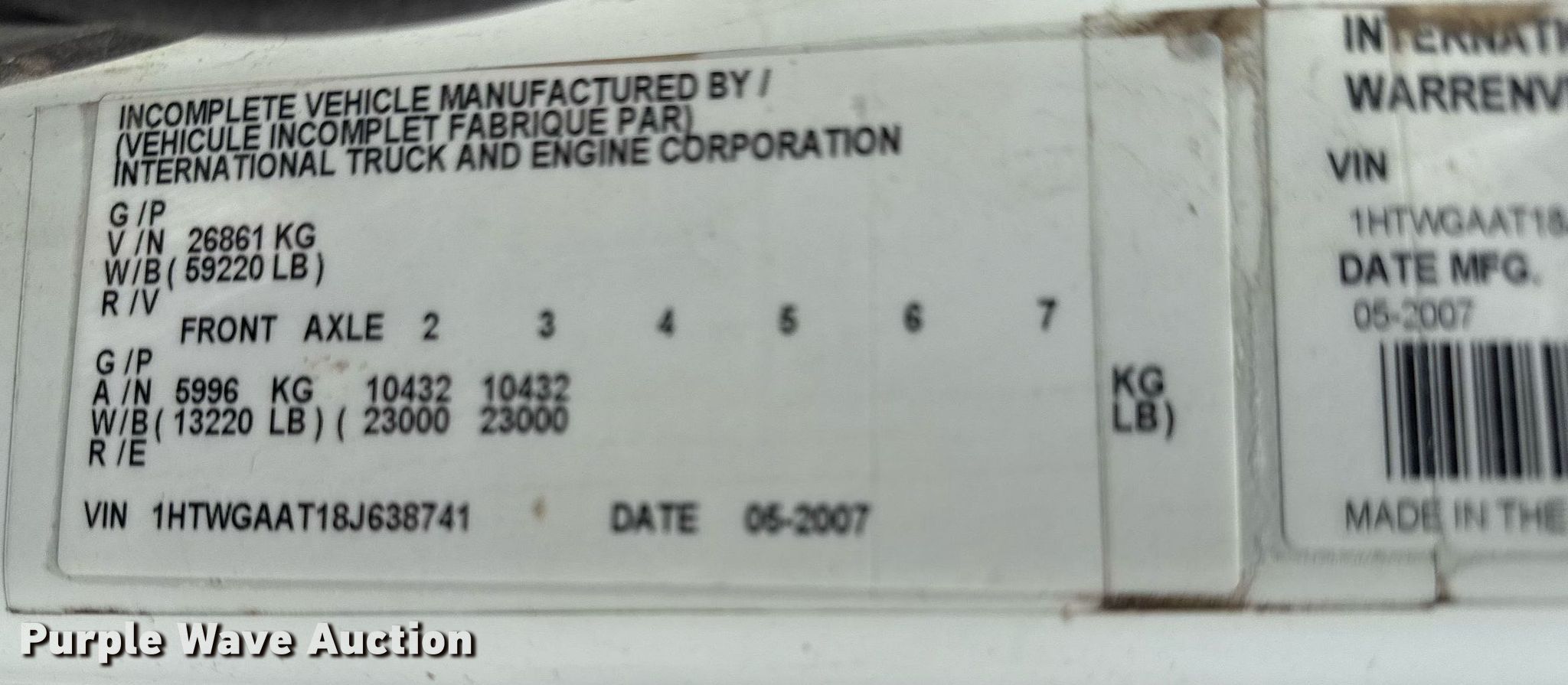 - VIN: 1HTWGAAT18J638741