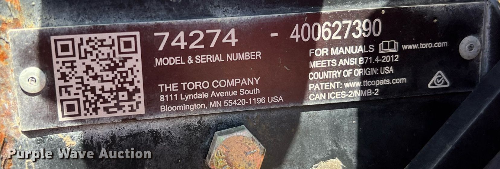 Purple Wave is selling a used Commercial Turf Mower in Oklahoma. This item is a 2017 Toro 74274 ZTR lawn mower with the following: Hours: 1,213 on meter, Cutting width: 72", Serial: 400627390, Unit #: 724