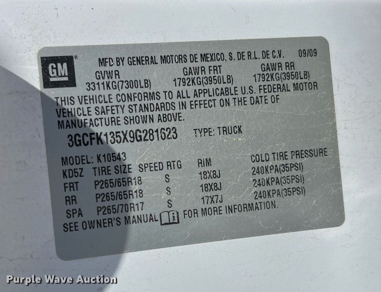• VIN: 3GCFK135X9G281623