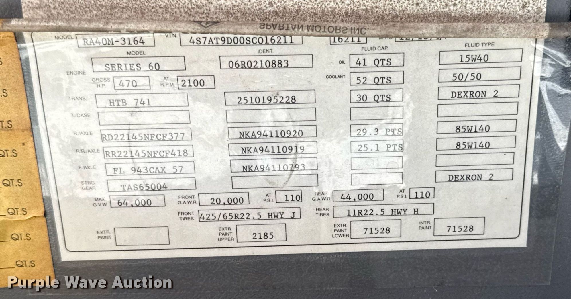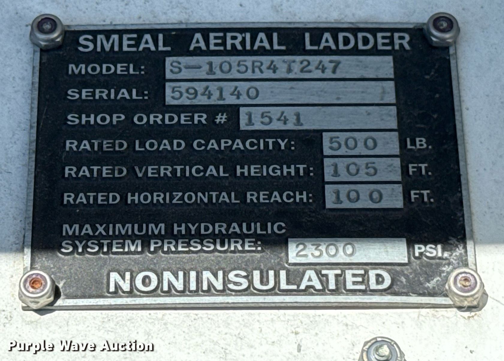 1995 Spartan Gladiator ladder fire truck. Miles: 47,002 on odometer, Hours 6106 on meter, VIN: 4S7AT9D00SC016211, Unit #: 760. Engine Detroit Diesel Series 60, Cylinders: 6, Fuel type: Diesel. Transmission Allison, Automatic. Chassis Differential lock: Inter-axle, Axles: Tandem, Suspension: Spring, Brakes: Air, GVWR: 64,000 lbs. Interior AC, Heat, Backup camera, Auxiliary controls. Features Fire truck body Aerial Smeal S-105R4T247, Hours: 1,104 on meter, Maximum height: 105', Maximum lift capacity: 500 lbs, Stabilizers Quantity: 4, Elevated deck gun 1,000 gpm, Tank, Pump 750 gpm, PA/ siren controls. Tires Front: 425/65R22.5, Rear: 11R22.5. Notes Hydraulic leak, Unknown operating condition of backup camera. Oklahoma classic title. Title distribution may be delayed up to 14 days from verification of funds. City of Broken Arrow. Broken Arrow, OK 74012