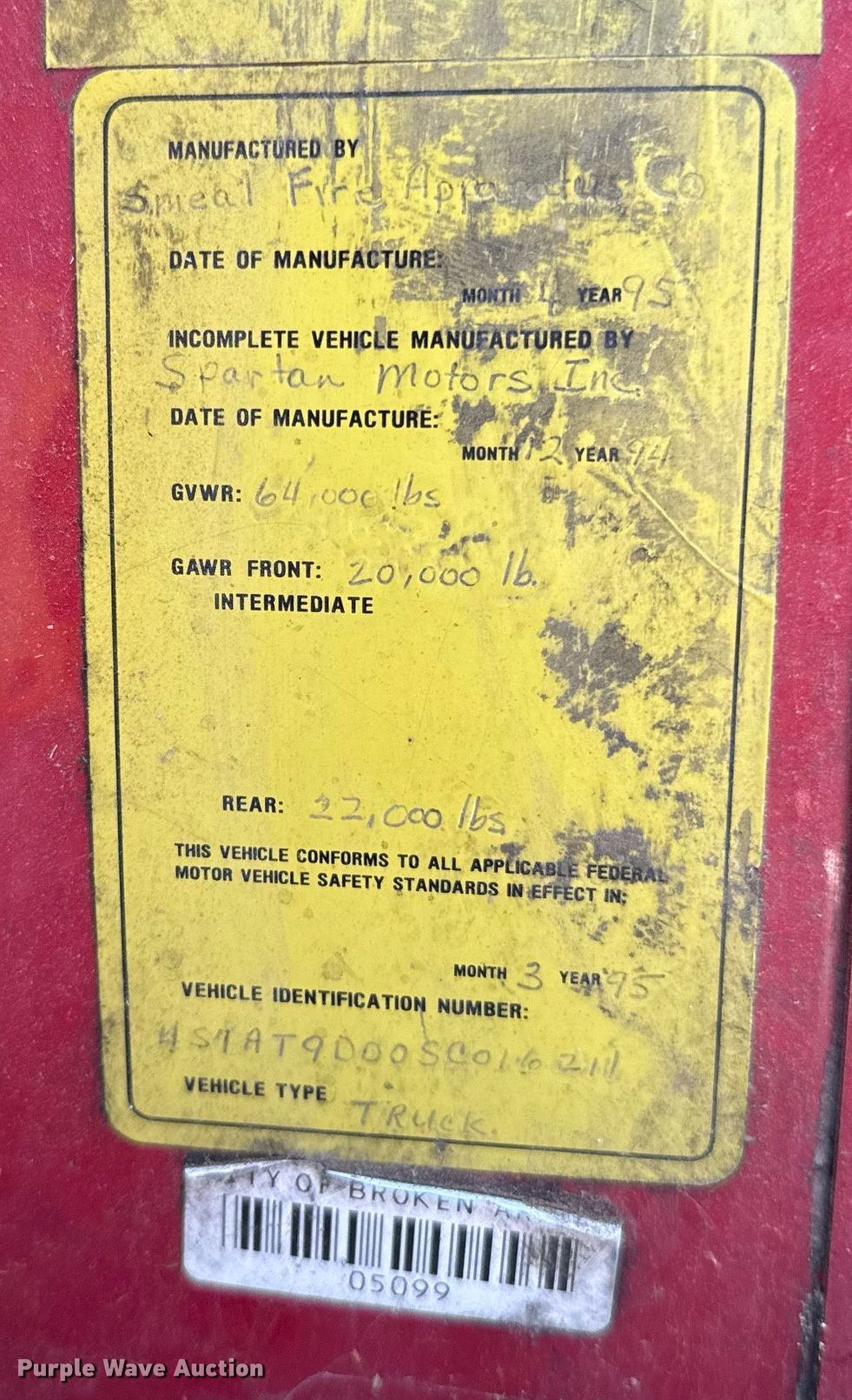 Purple Wave is selling a used Fire Truck or Emergency Vehicle in Oklahoma. This item is a 1995 Spartan Gladiator ladder fire truck with the following: Miles: 47,002 on odometer, Hours 6106 on meter, VIN: 4S7AT9D00SC016211, Unit #: 760