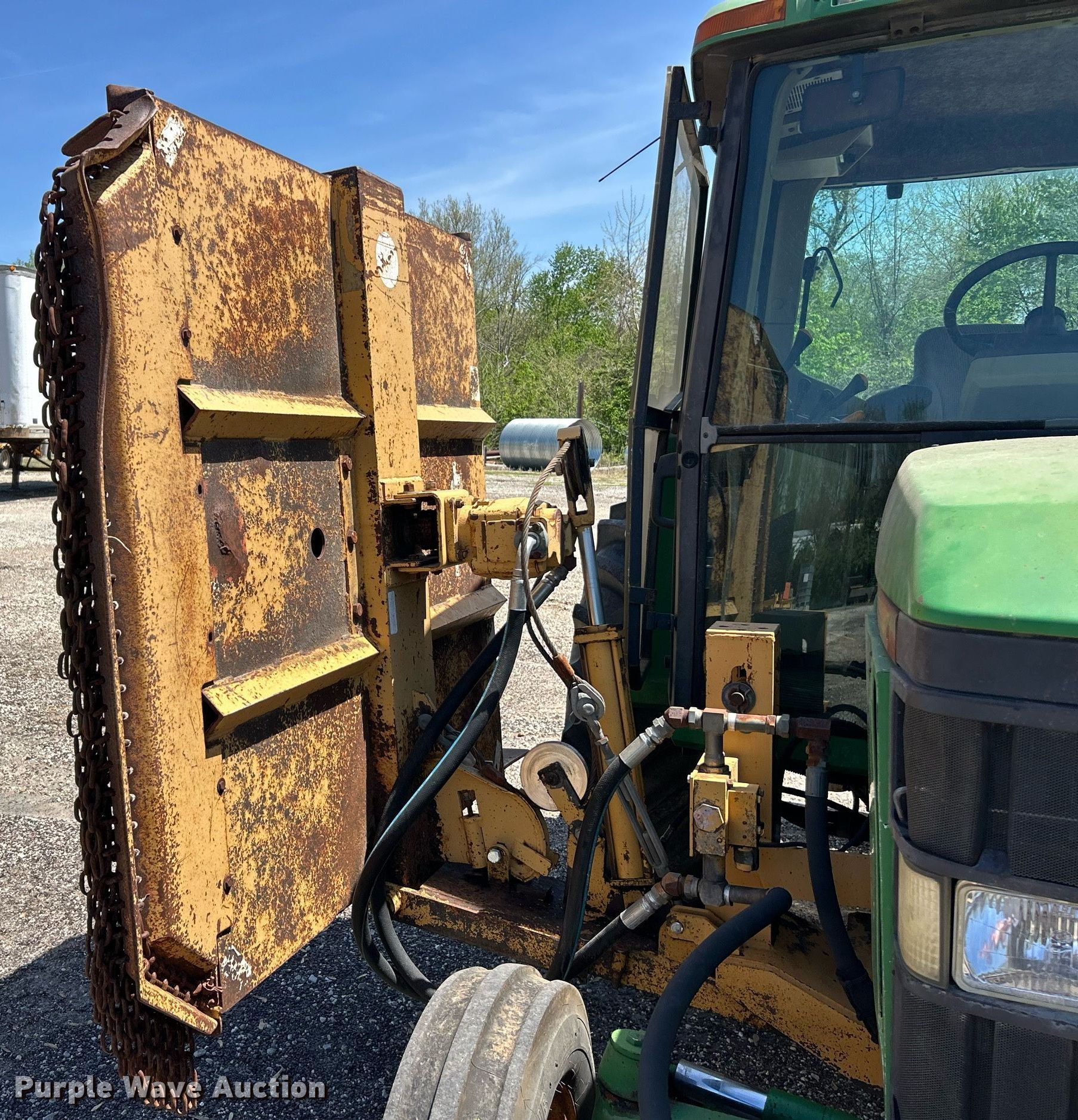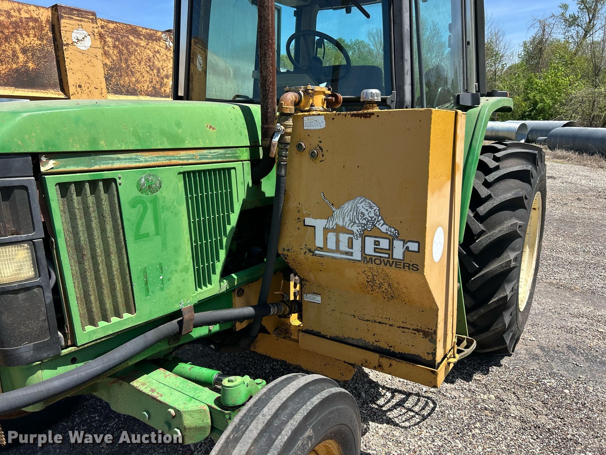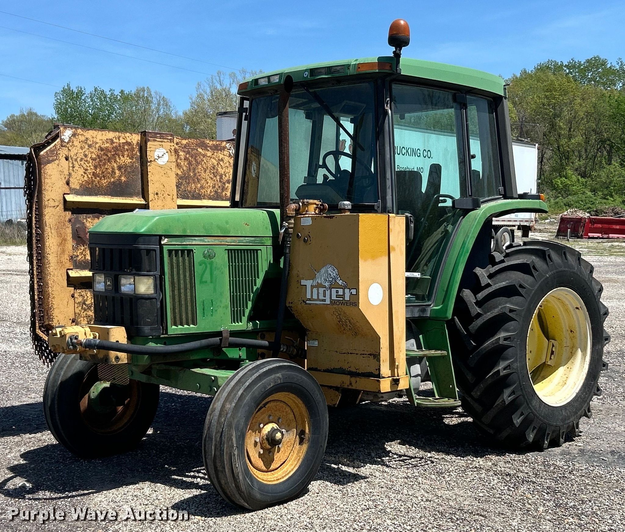 John Deere 6210 tractor. Hours: Unknown, Serial: L06210H306225. Engine John Deere, Cylinders: 4, Fuel type: Diesel. Transmission Powershift, 12F - 4R, Differential lock. Operators station AC, Heat. Features PTO: 540, Three point Top link, Hydraulic remote sets Rear: 2, Tiger side boom mower Cutting width: 62". Tires Front: 7.50-18, Rear: 16.9-30. Notes Lift cylinder for mower need replaced, Three point hydraulic lever linkage issues, need replaced, Non-operational AC. Franklin County, MO. Union, MO 63084
