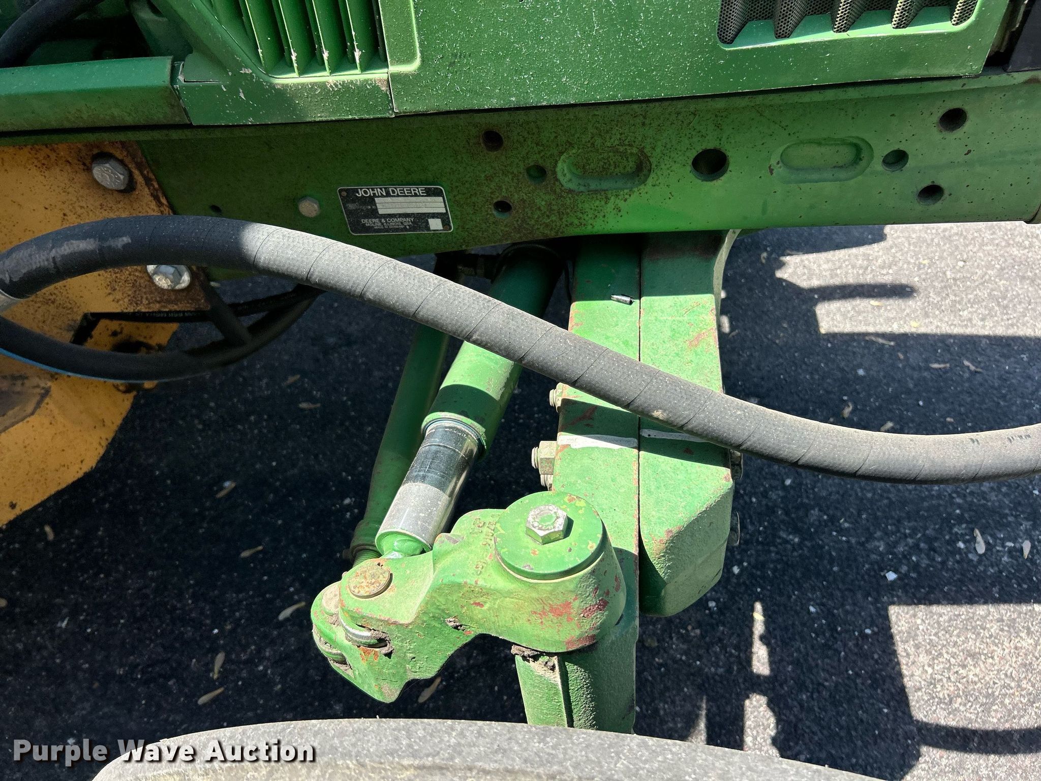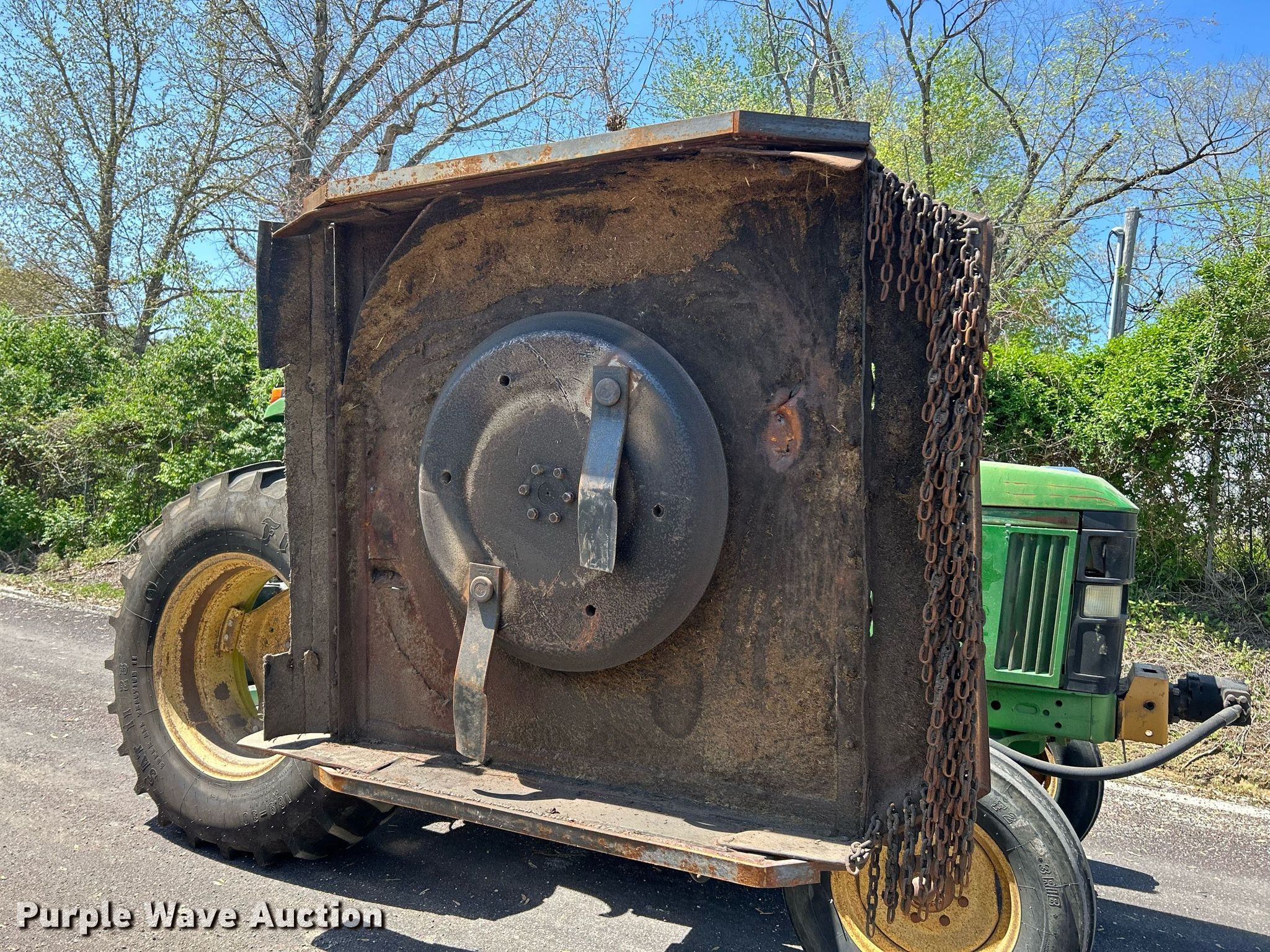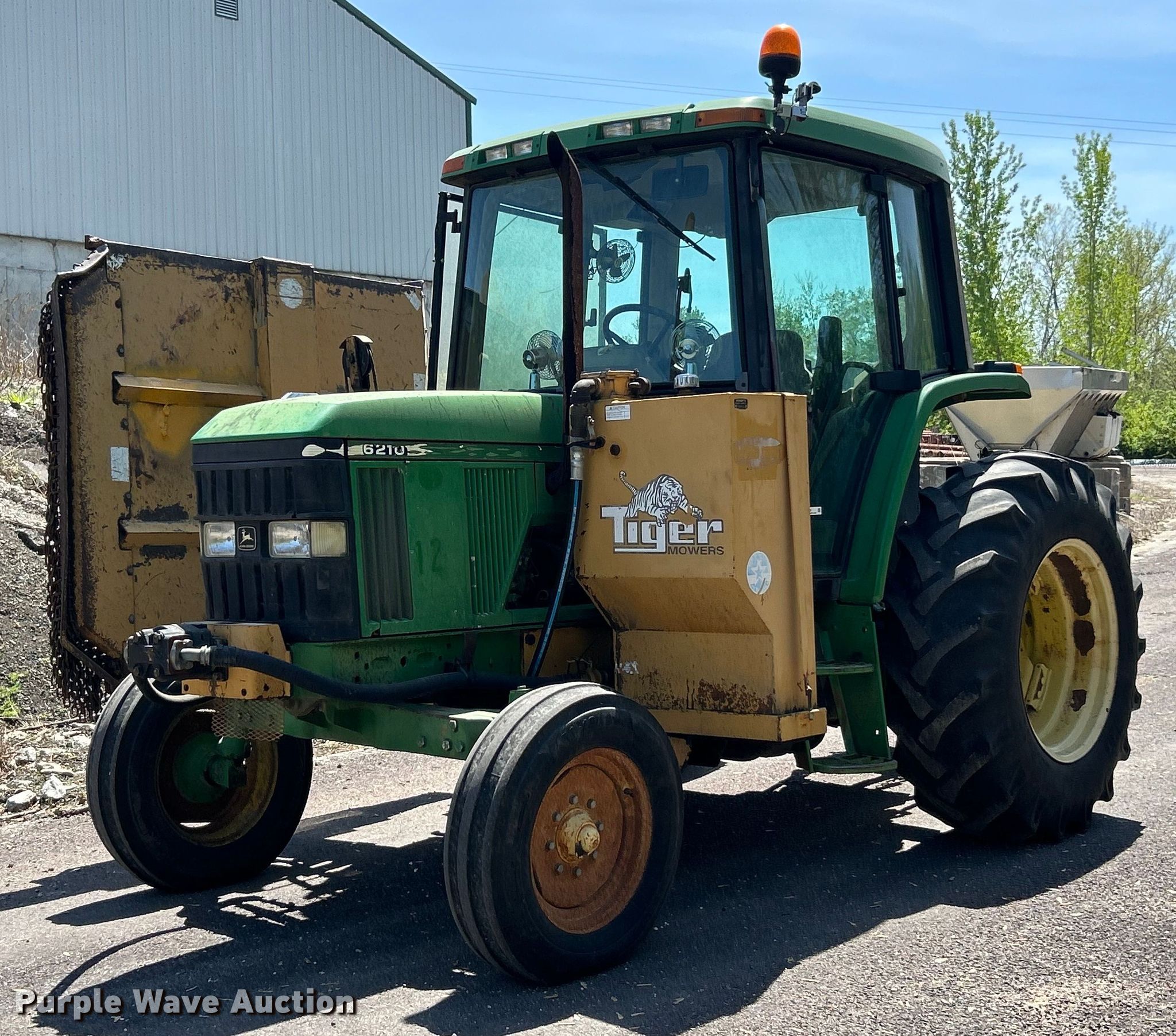 John Deere 6210 tractor. Hours: Unknown, Serial: L06210H305527. Engine John Deere, Cylinders: 4, Fuel type: Diesel. Transmission Powershift, 12F - 4R, Differential lock. Operators station AC, Heat. Features PTO: 540, Three point Top link, Seven pin outlet, Hydraulic remote sets Rear: 2, Tiger mower Width: 62". Tires Front: 7.50-18, Rear: 16.9-30. Notes Hour meter illumination issues, Non-operational parking brake, Non-operational AC, Hood hinge issues, broken. Franklin County, MO. Union, MO 63084