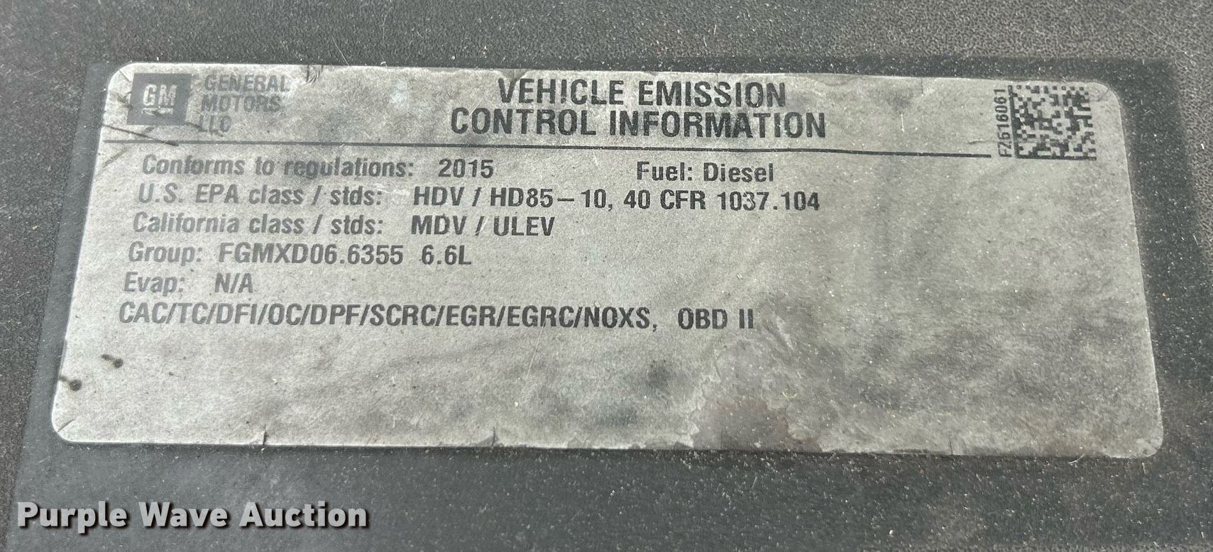 2015 Chevrolet Silverado 2500 Double Cab utility bed pickup truck. Miles: 227,496 on odometer, VIN: 1GC2CUE89FZ516061, Unit #: 9181. Engine Displacement: 6.6L V8 OHV, Cylinders: 8, Fuel type: Diesel. Transmission Automatic. Interior AC, Heat, Heated mirrors, Power windows, Power locks, Cruise control. Features Utility bed Knapheide, 8' L x 78" W. Tires Size: 245/75R17. Notes Dash warning indicator: TPMS, Windshield chipped or cracked. Missouri title. Title distribution may be delayed up to 14 days from verification of funds. Missouri Dept. of Transportation - District 6. Ballwin, MO 63021