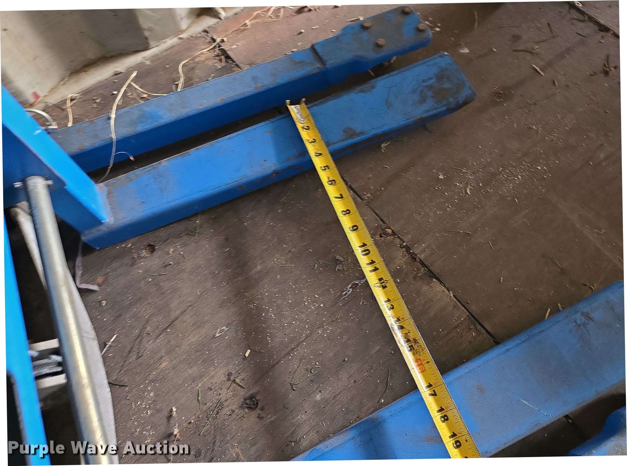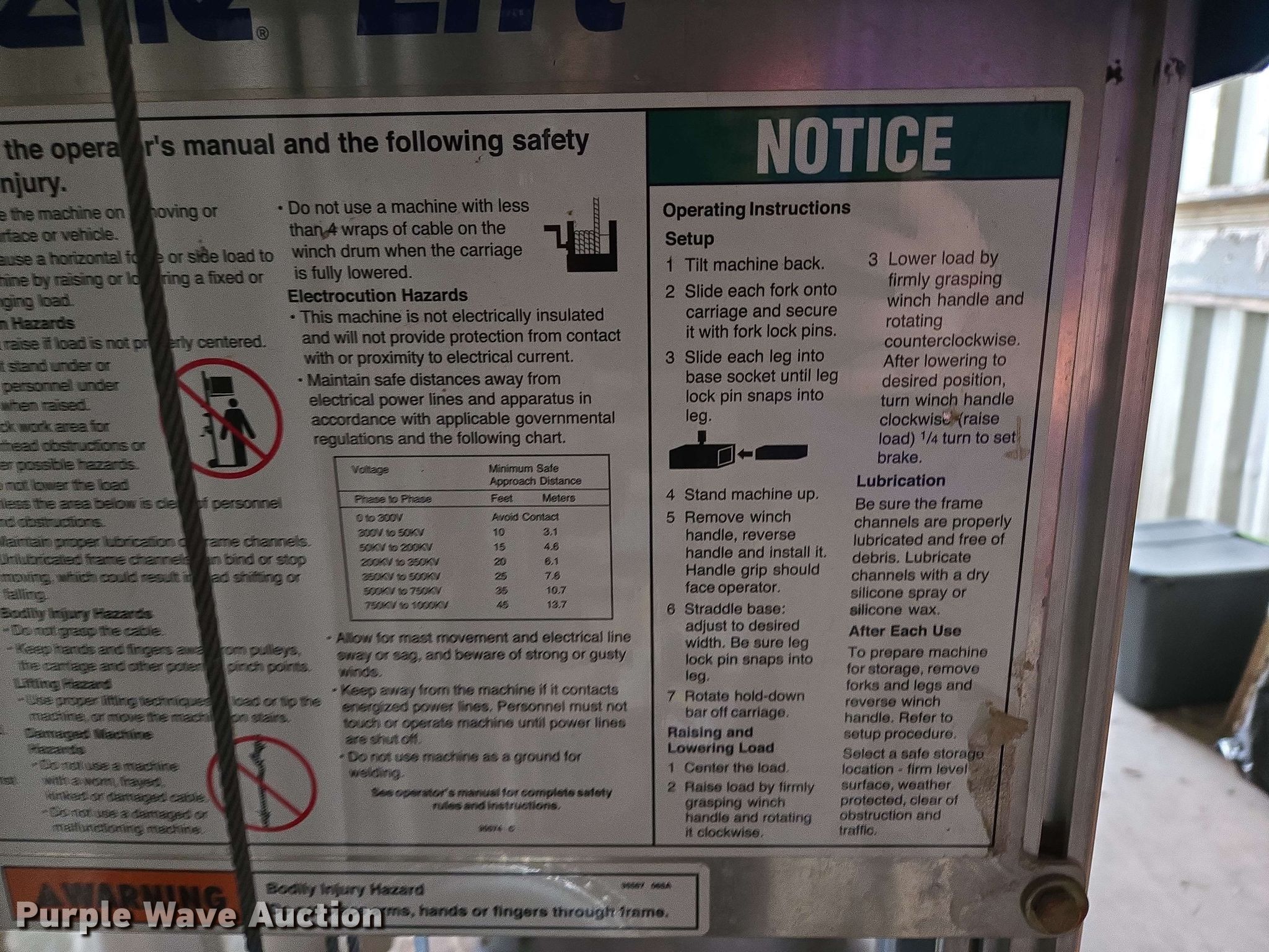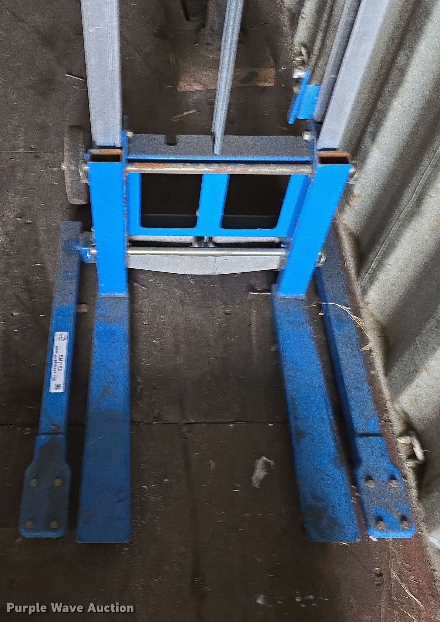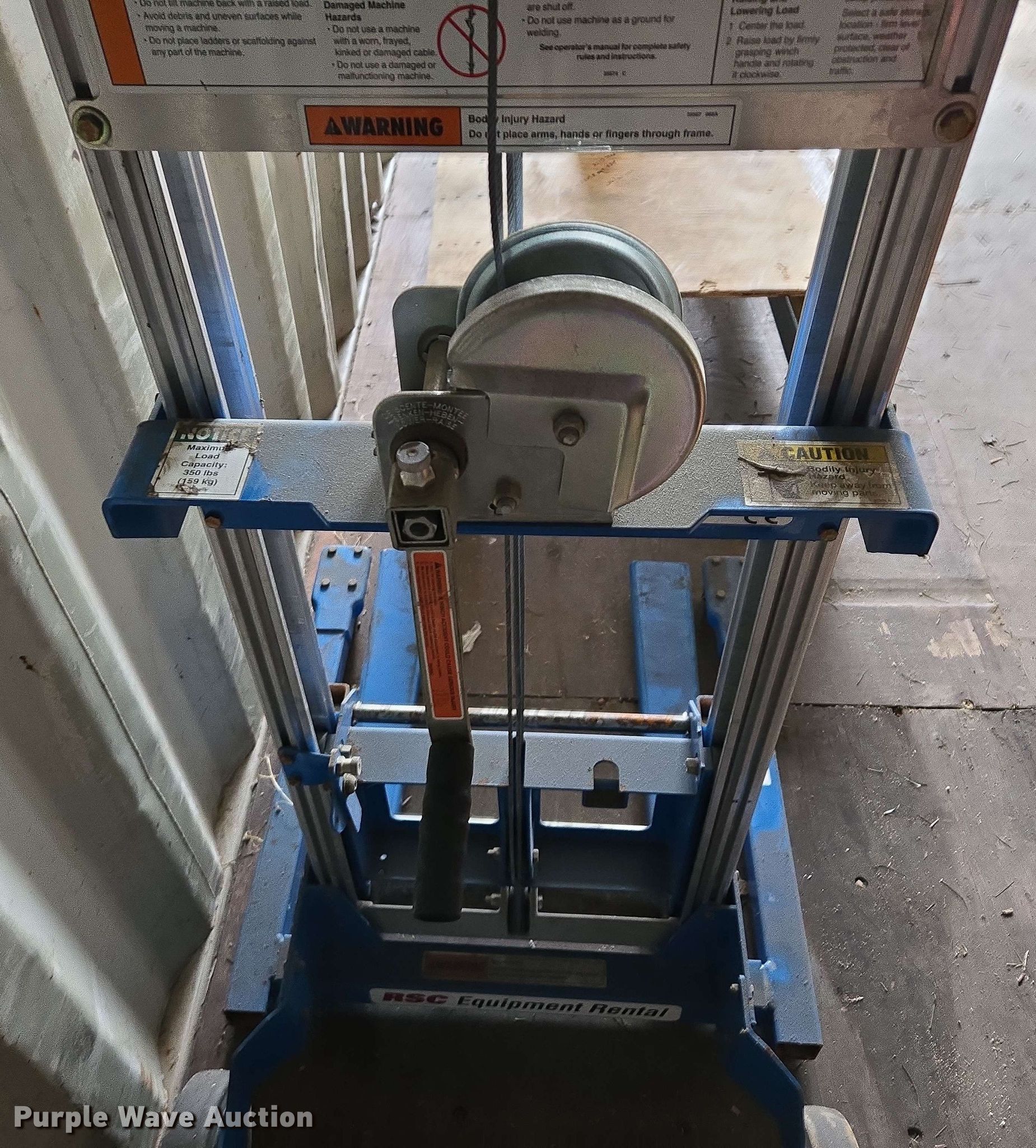 2007 Genie GL-12 material lift. Serial: GL07-52019. Features Maximum lift capacity: 350 lbs, Maximum lift height: 13' 9.5", Forks 22.5" L x 20" W. City of Independence, MO. Independence, MO 64050