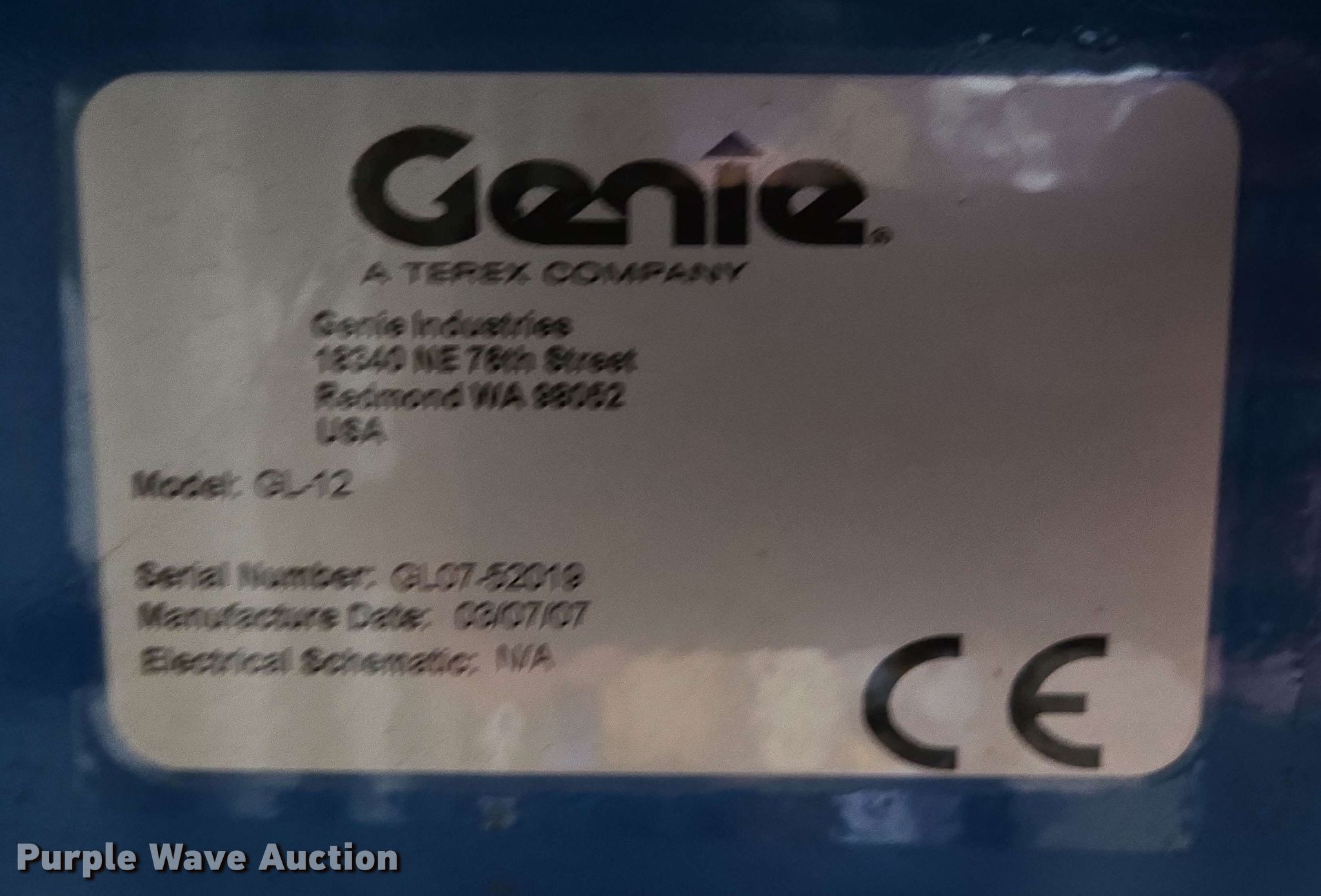 Purple Wave is selling a used Scissor or Vertical Lift in Missouri. This item is a 2007 Genie GL-12 material lift with the following: Serial: GL07-52019