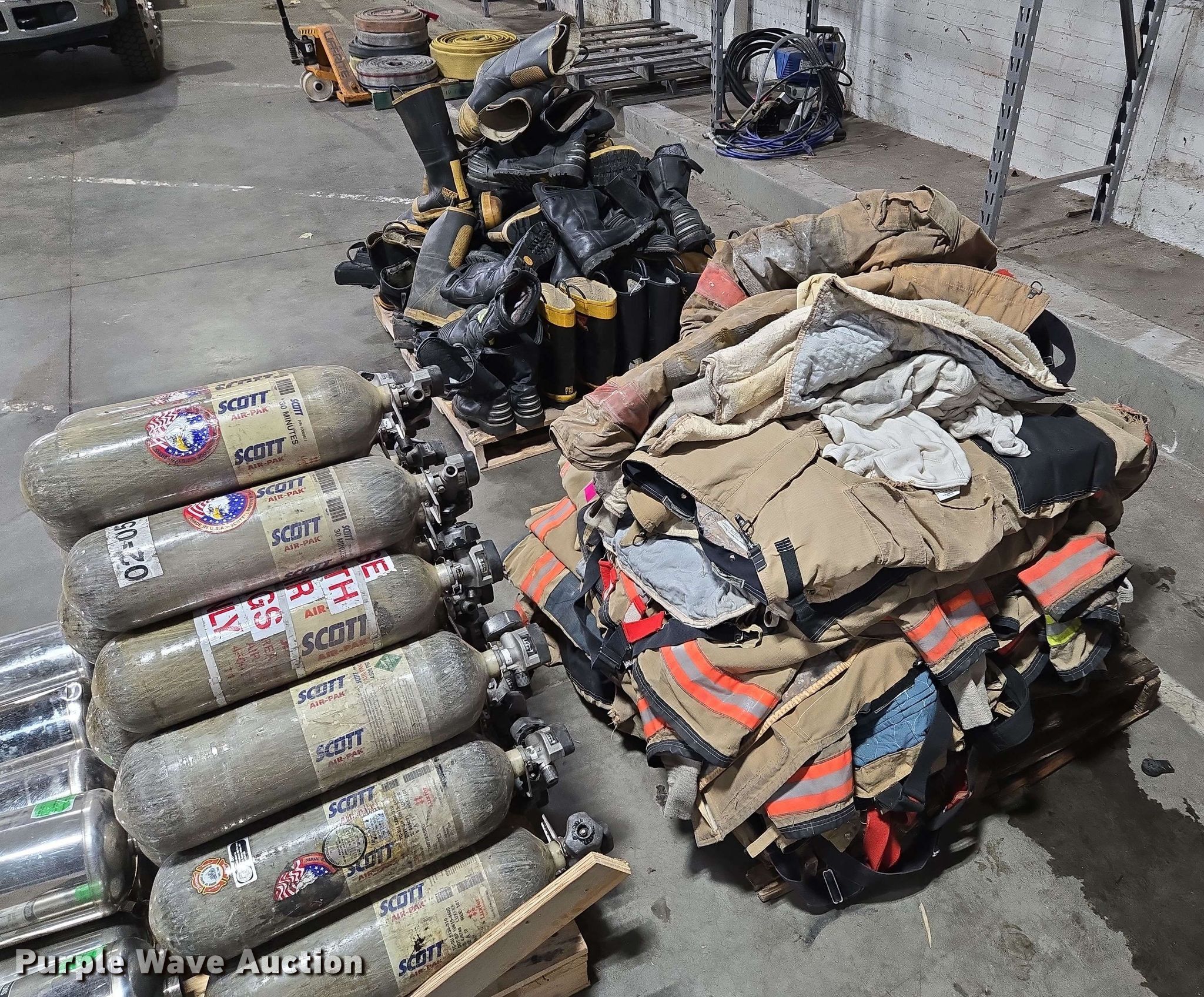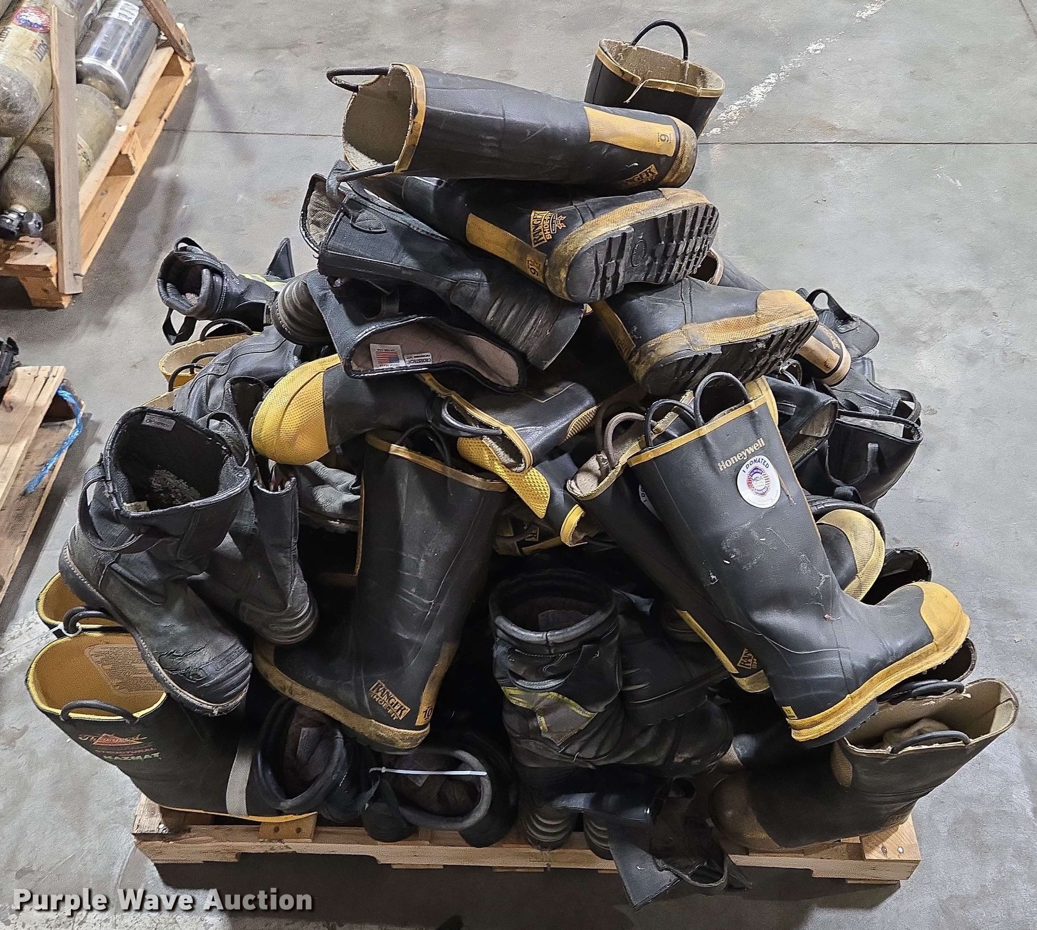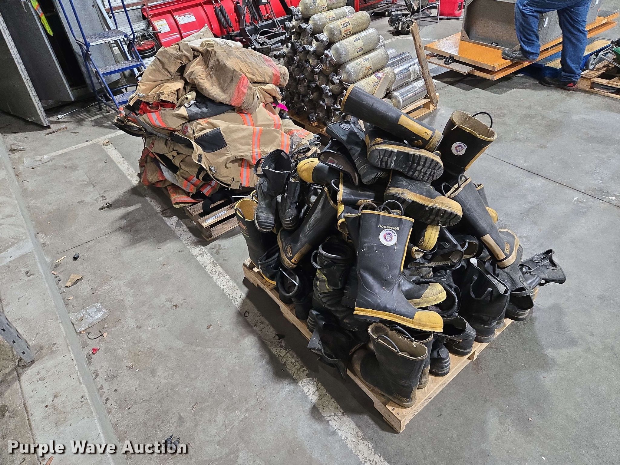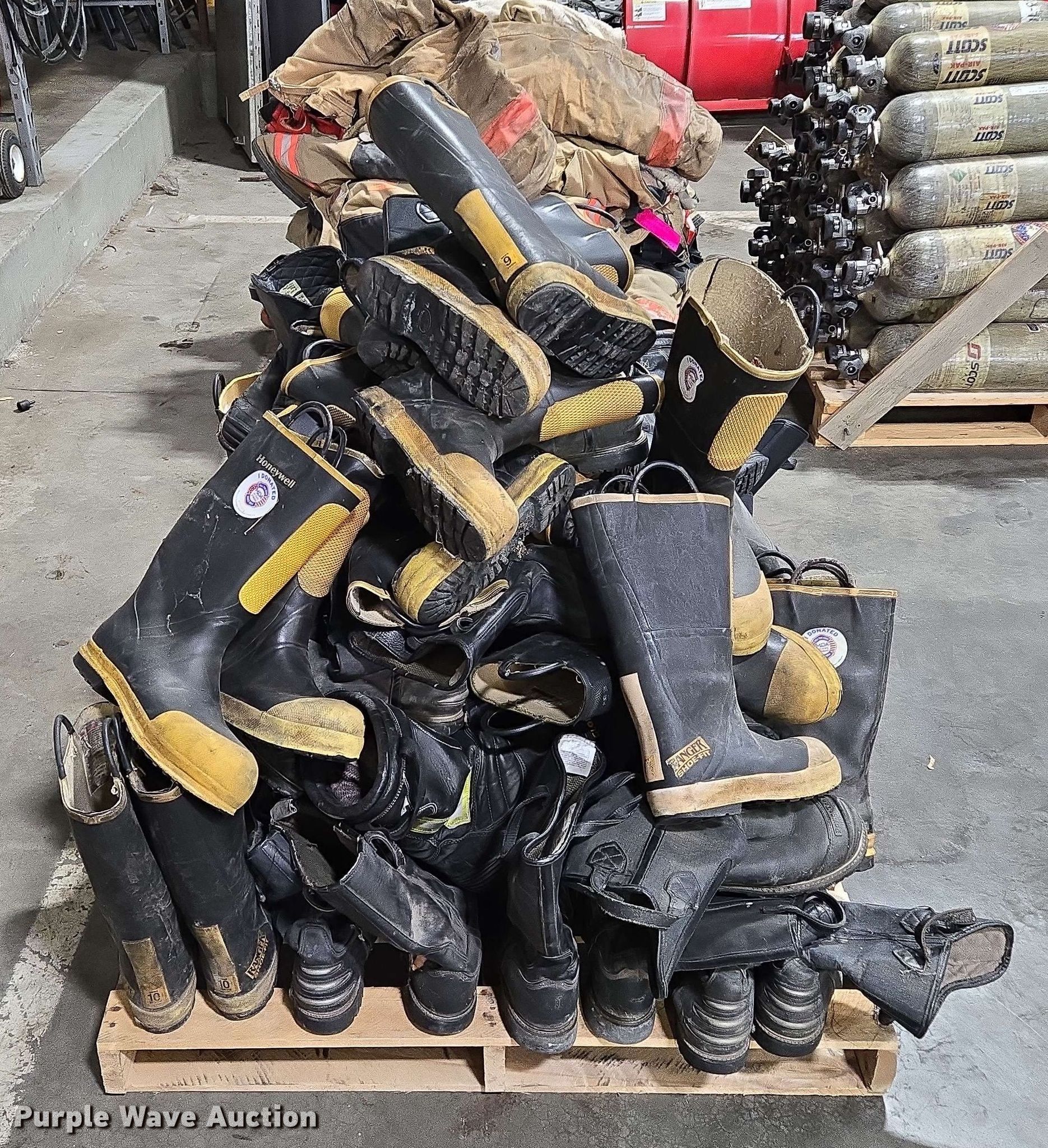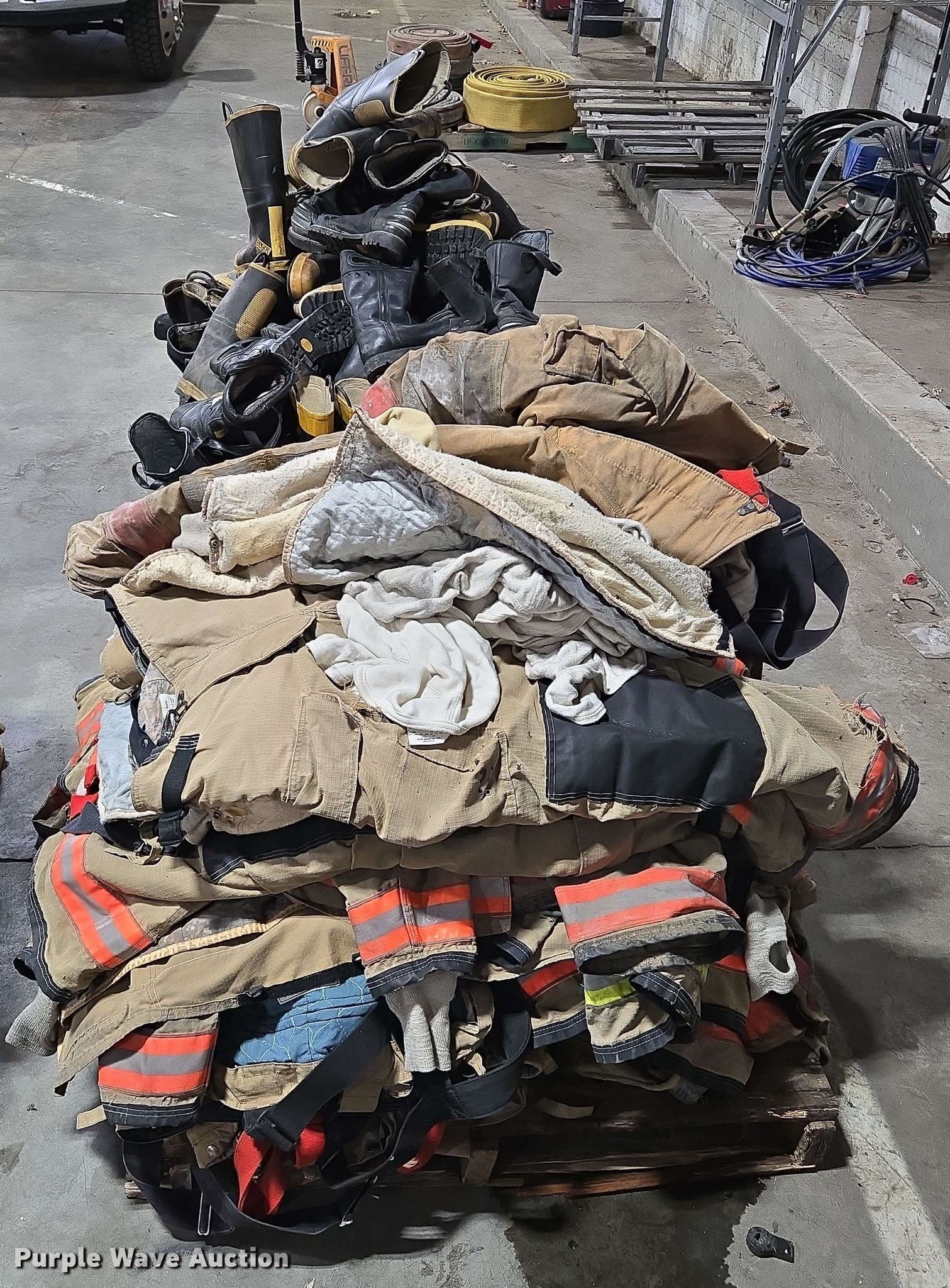 Purple Wave is selling a used Tools in Missouri. This item is a Fire fighting equipment with the following: (20) pants, (8) jackets, Approximately 20 pairs of boots