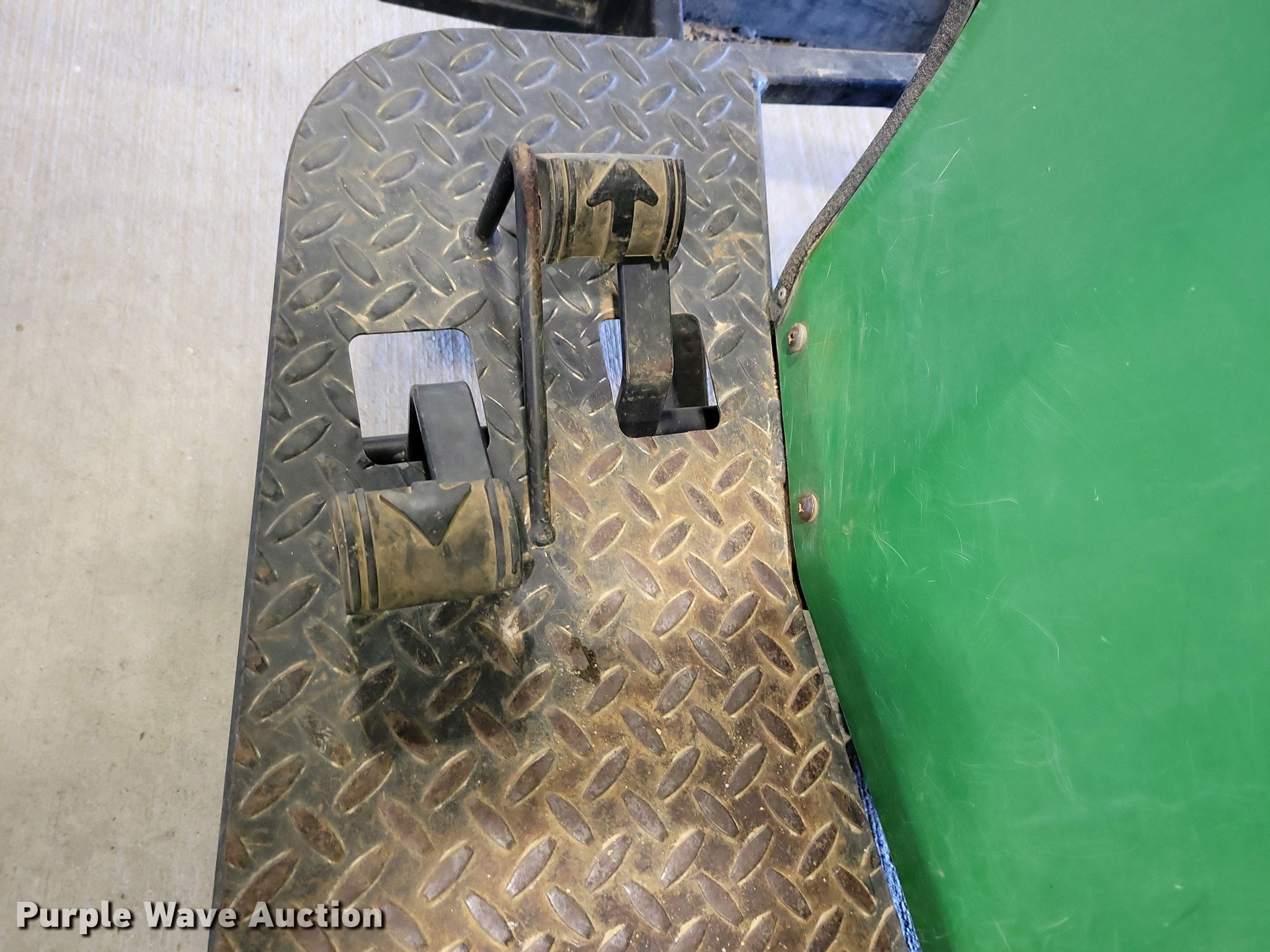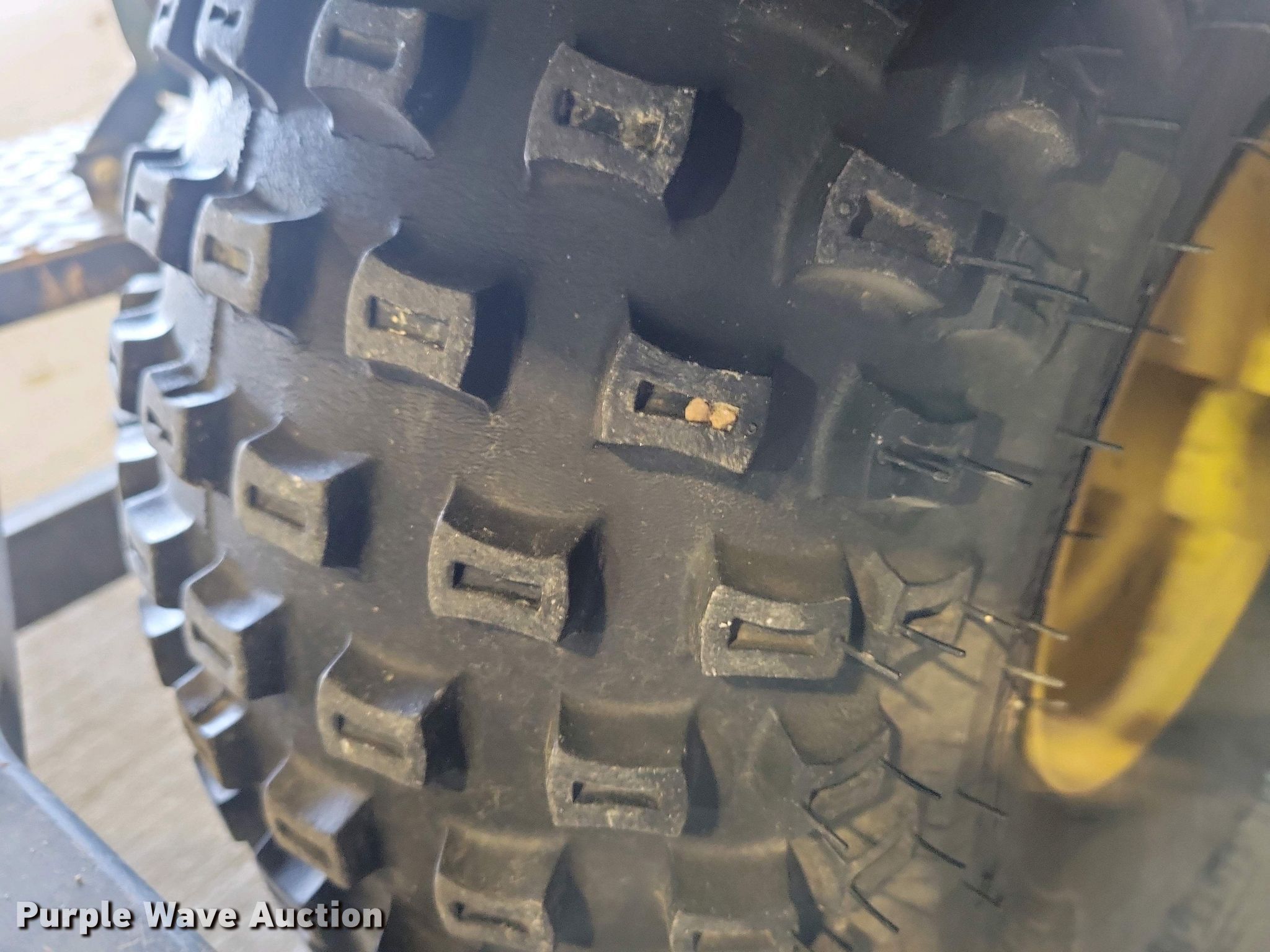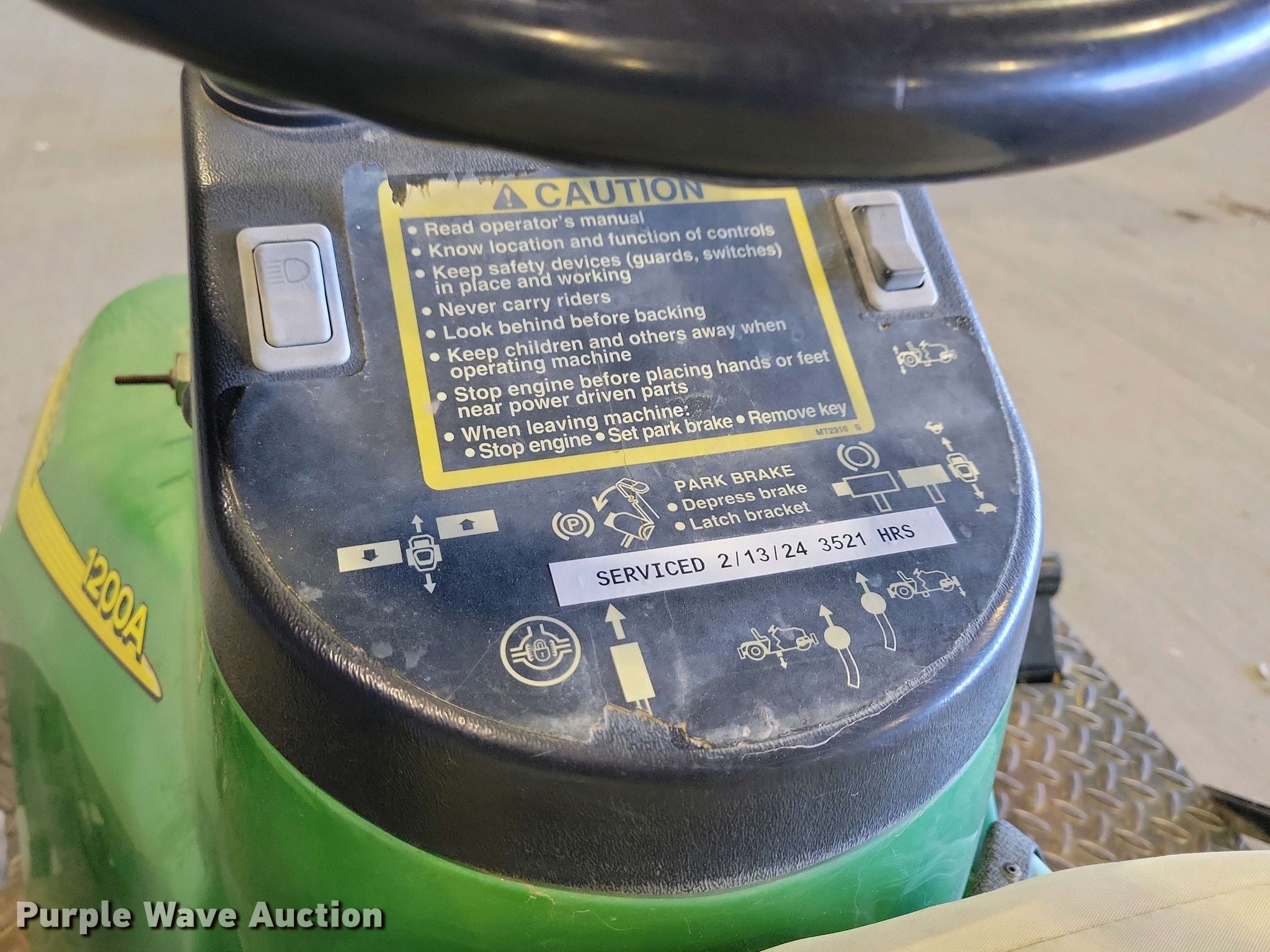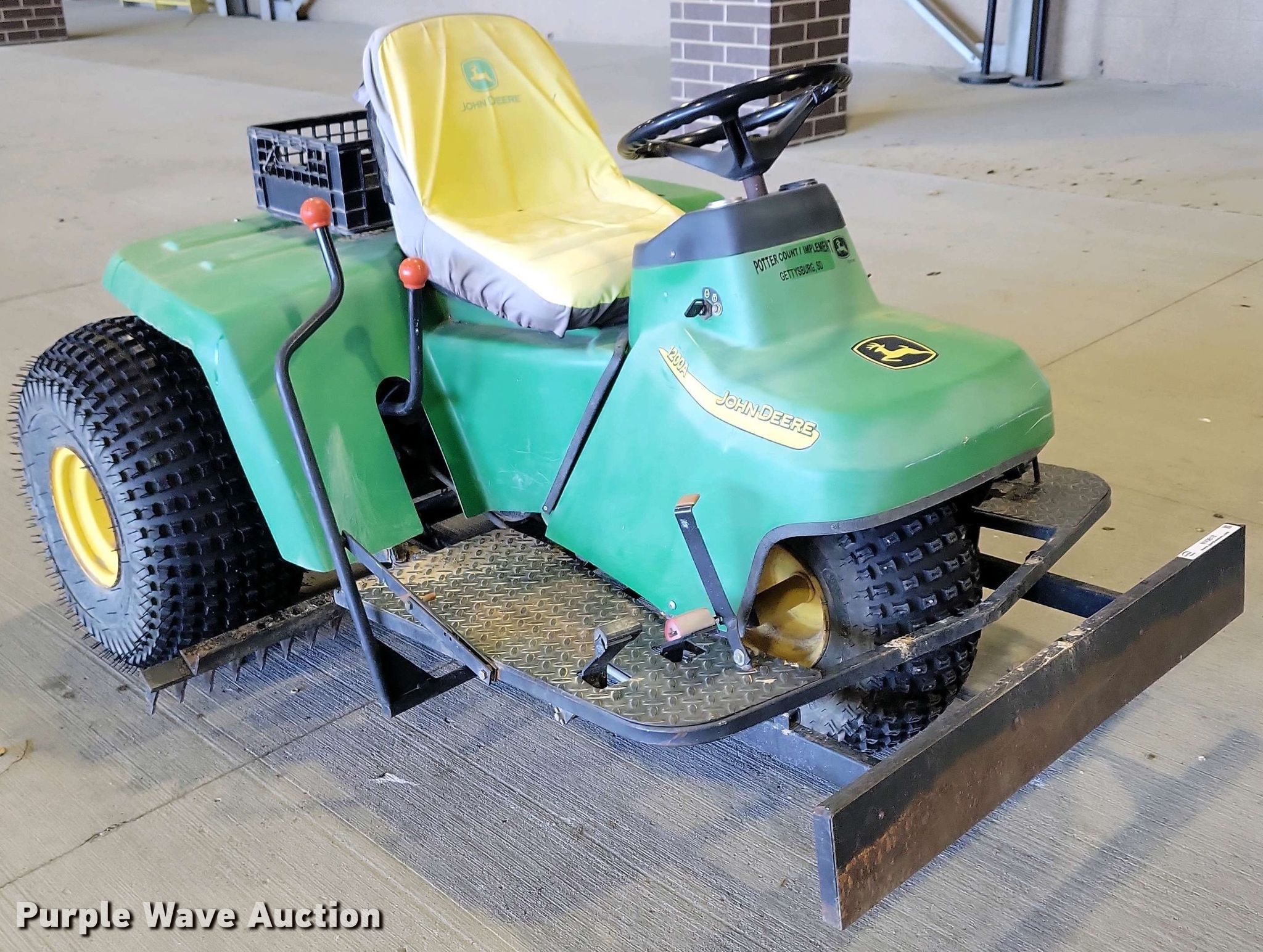 John Deere 1200A bunker rake. Hours: Unknown, Serial: 1C1200A135633. Engine Kawasaki, Cylinders: 1, Fuel type: Gas. Transmission Hydrostatic. Features Rake width: 64", Blade width: 40". Tires Front: 22.5x10.00-8NHS, Rear: AT25x12-9. Notes Hour meter damaged. State of South Dakota Bureau of Administration. Brookings, SD 57006