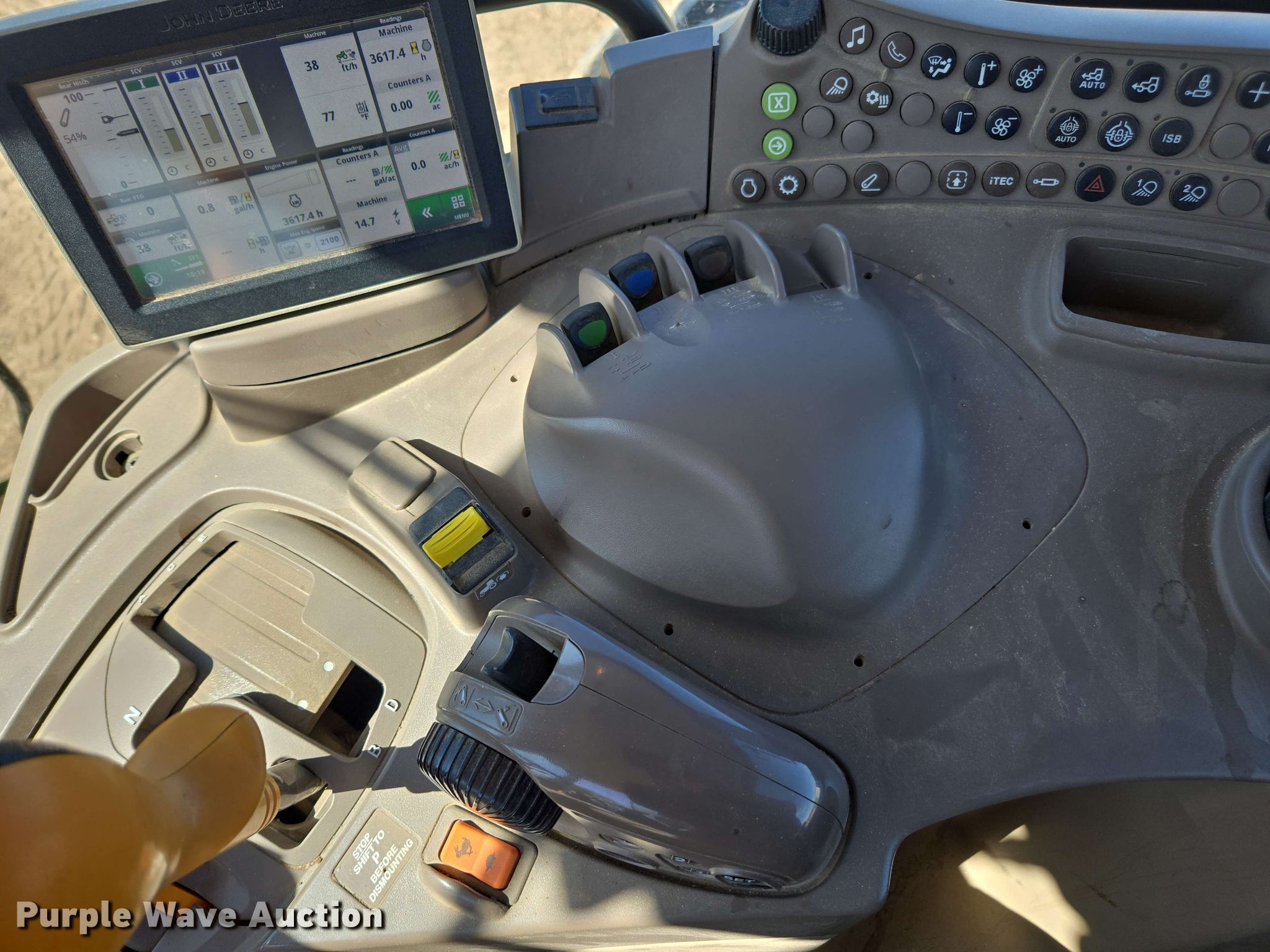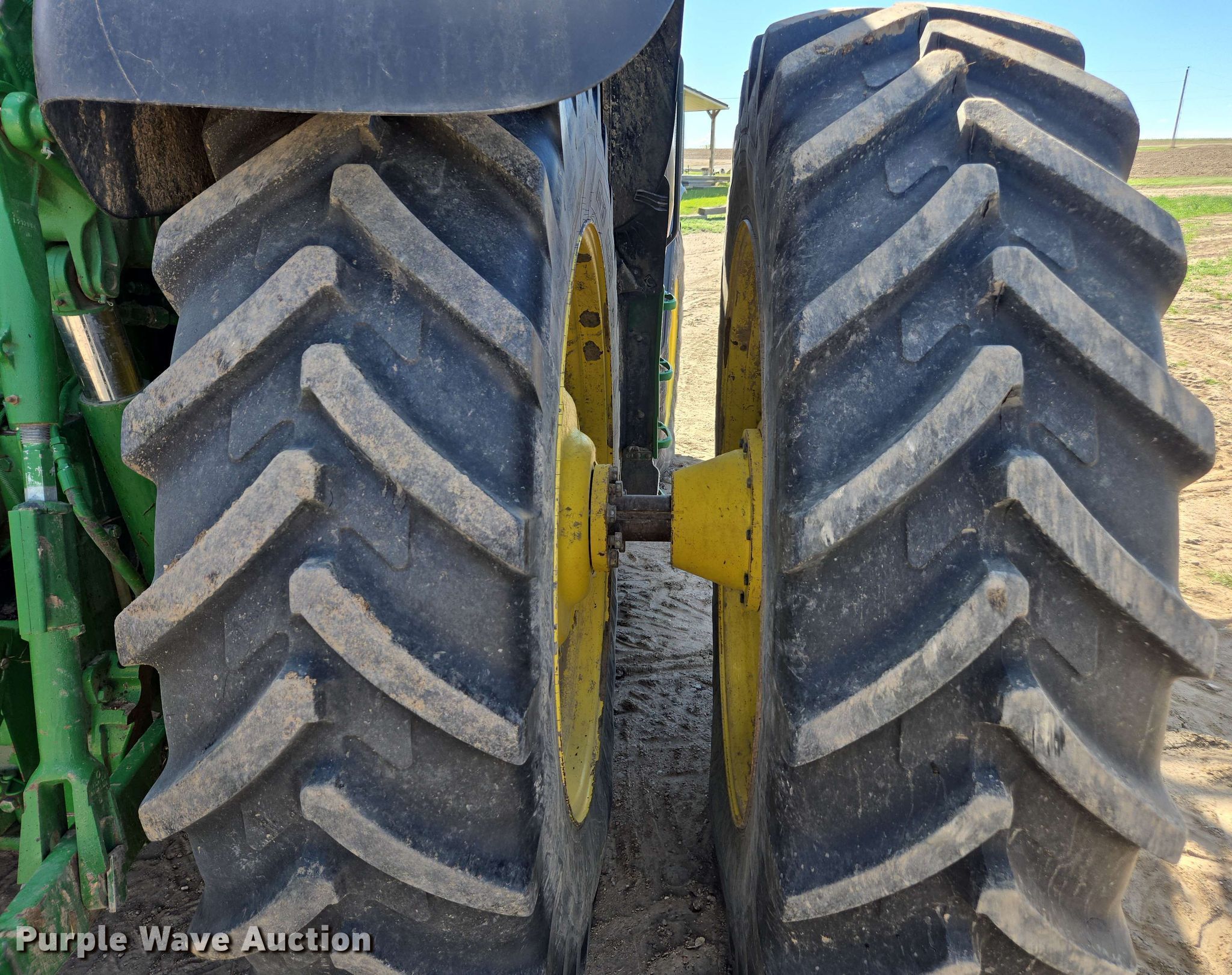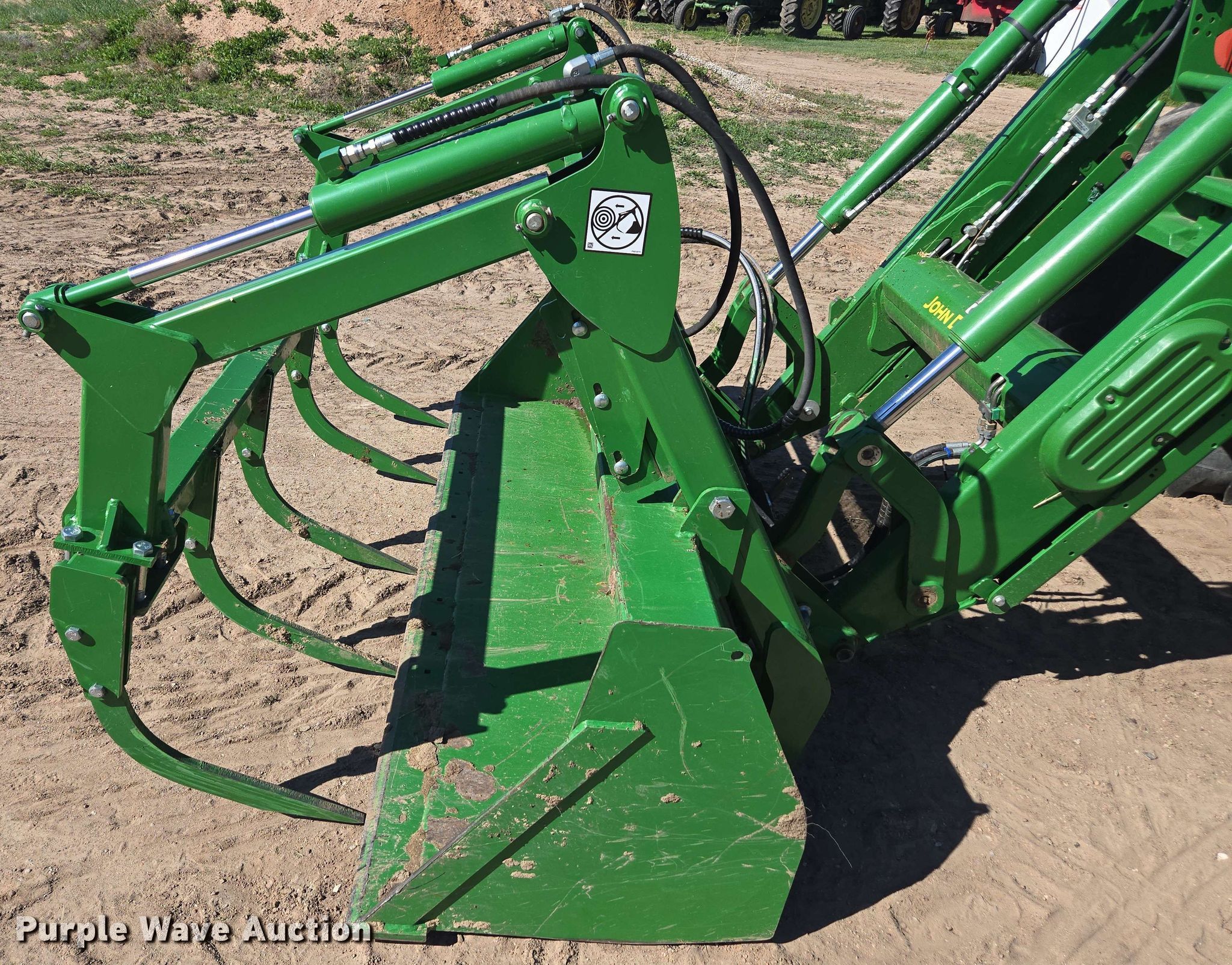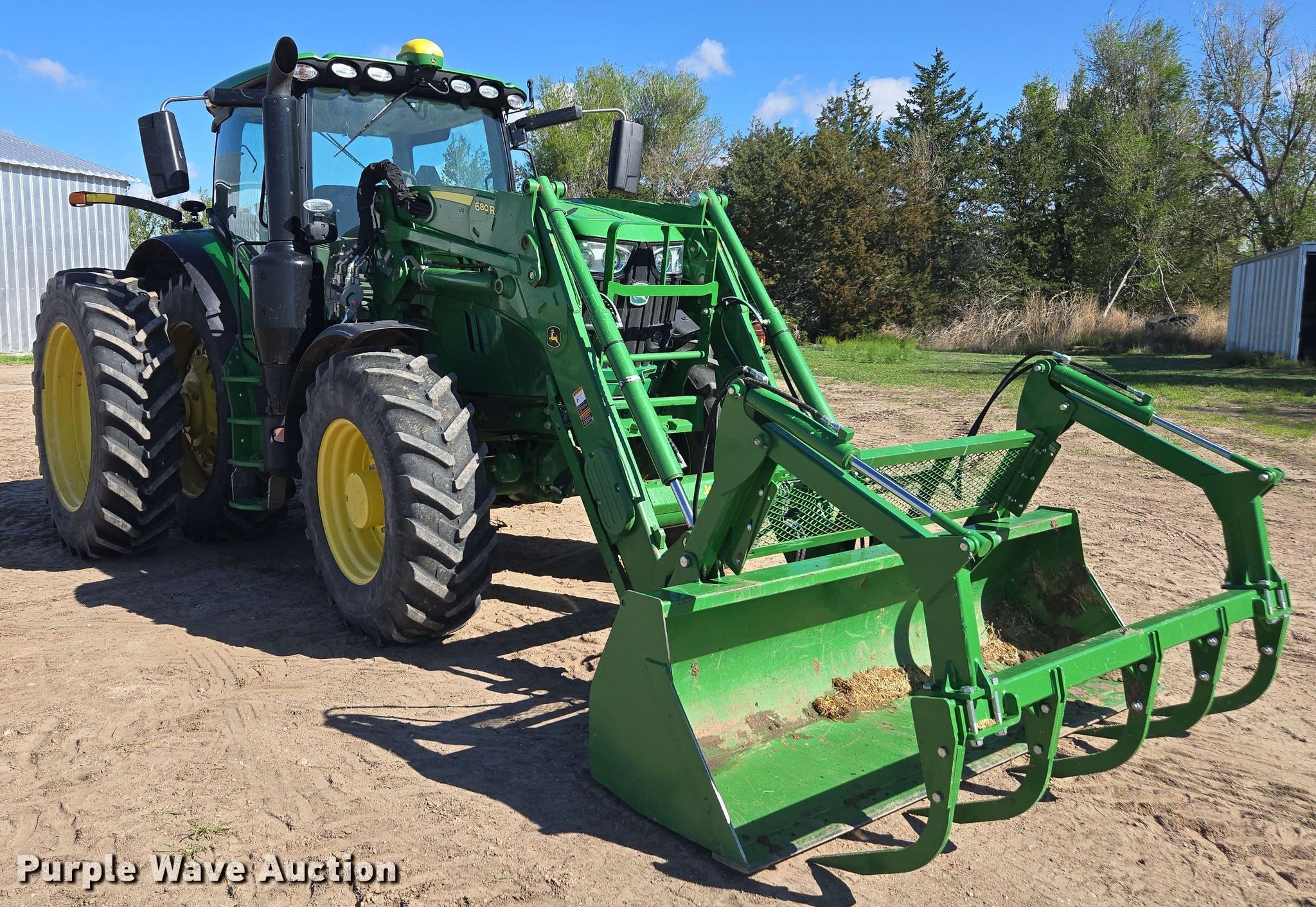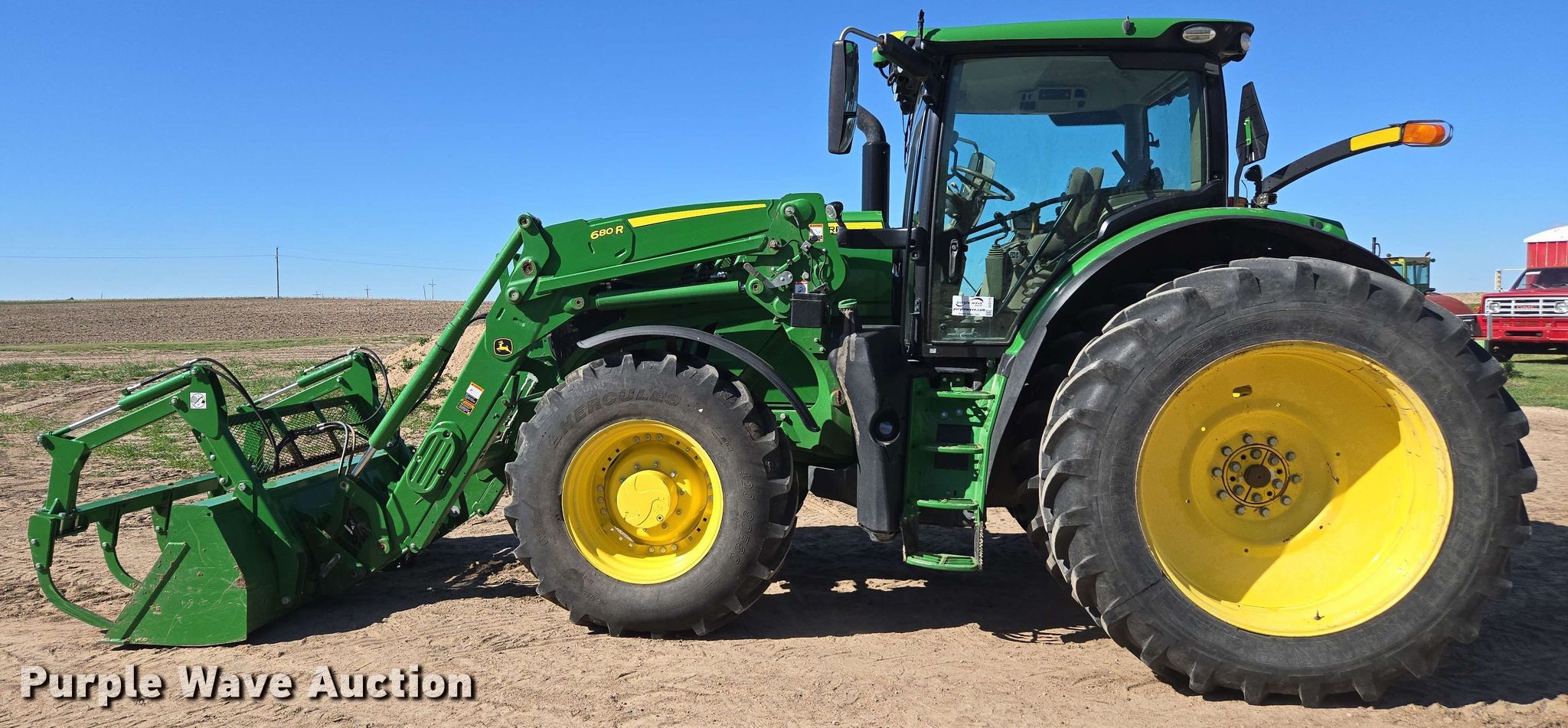 2017 John Deere 6175R MFWD tractor. Hours: 3,617 on meter, Serial: 1RW6175RKHA027783. Engine John Deere 6068RW440, Displacement: 6.8L, Cylinders: 6, Fuel type: Diesel. Transmission Powershift, 20F - 20R, Left-hand reverser, Differential lock. Operators station AC, Heat, GPS receiver John Deere StarFire 6000, Display John Deere, Auto steer. Features PTO: 540, 1000, Three point Top link, Quick attach, Seven pin outlet, ISOBUS outlet, Hydraulic remote sets Rear: 3, Power beyond (hydraulics), Loader John Deere 680R, Quick attach, Self-leveling, Controls: Joystick, Grapple bucket Width: 98".. Tires Front: 420/90R30, Rear: 480/80R46, Wheel weights: 4, Duals. Flipse Hay Service. Oakley, KS 67748