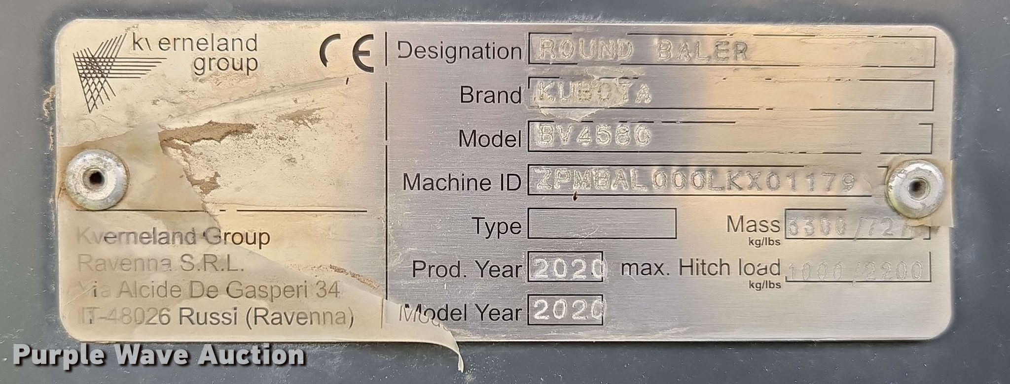 Purple Wave is selling a used Round Baler in Kansas. This item is a 2020 Kubota BV4580 round baler with the following: Bale count: 7,254, Serial: ZPMBAL000LKX01179
