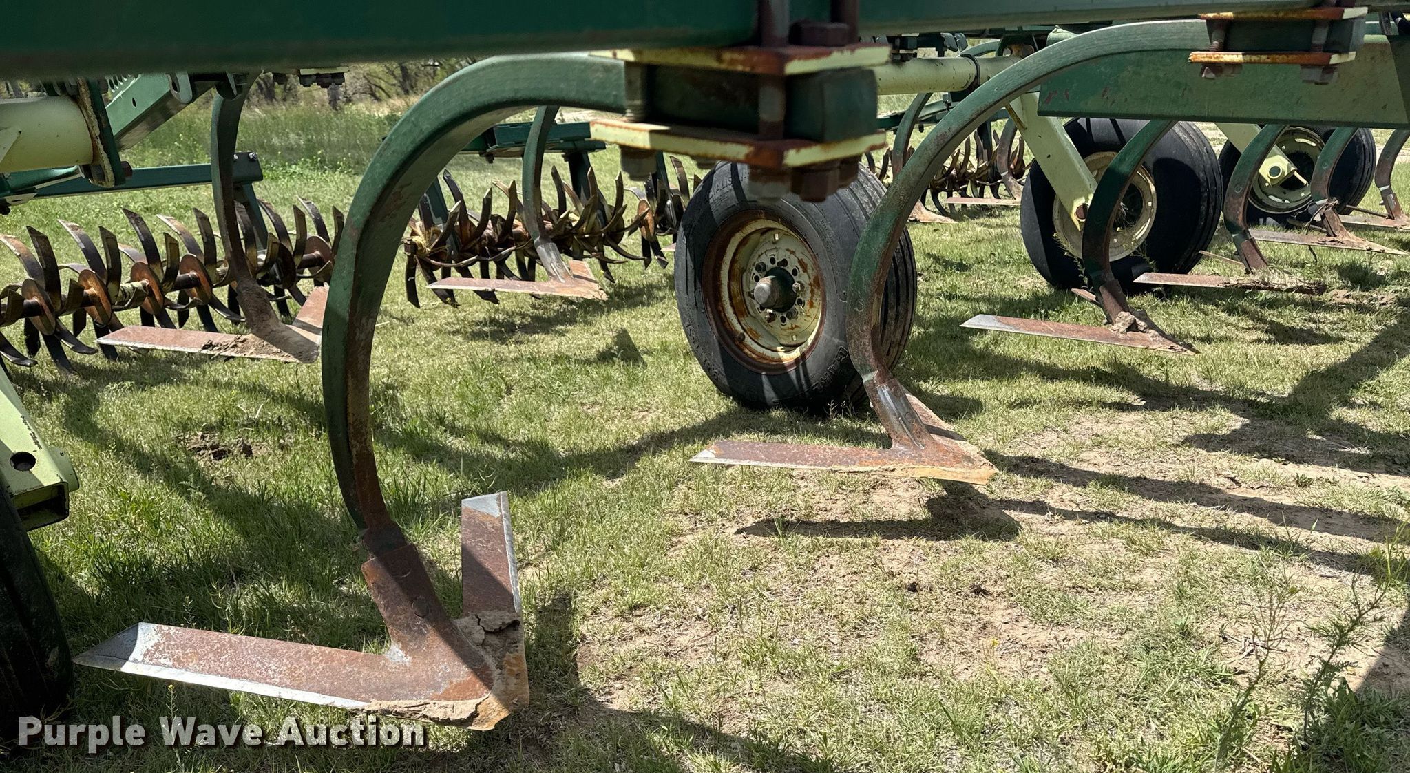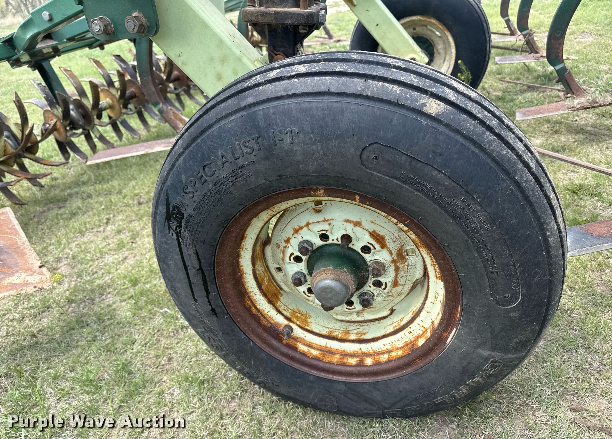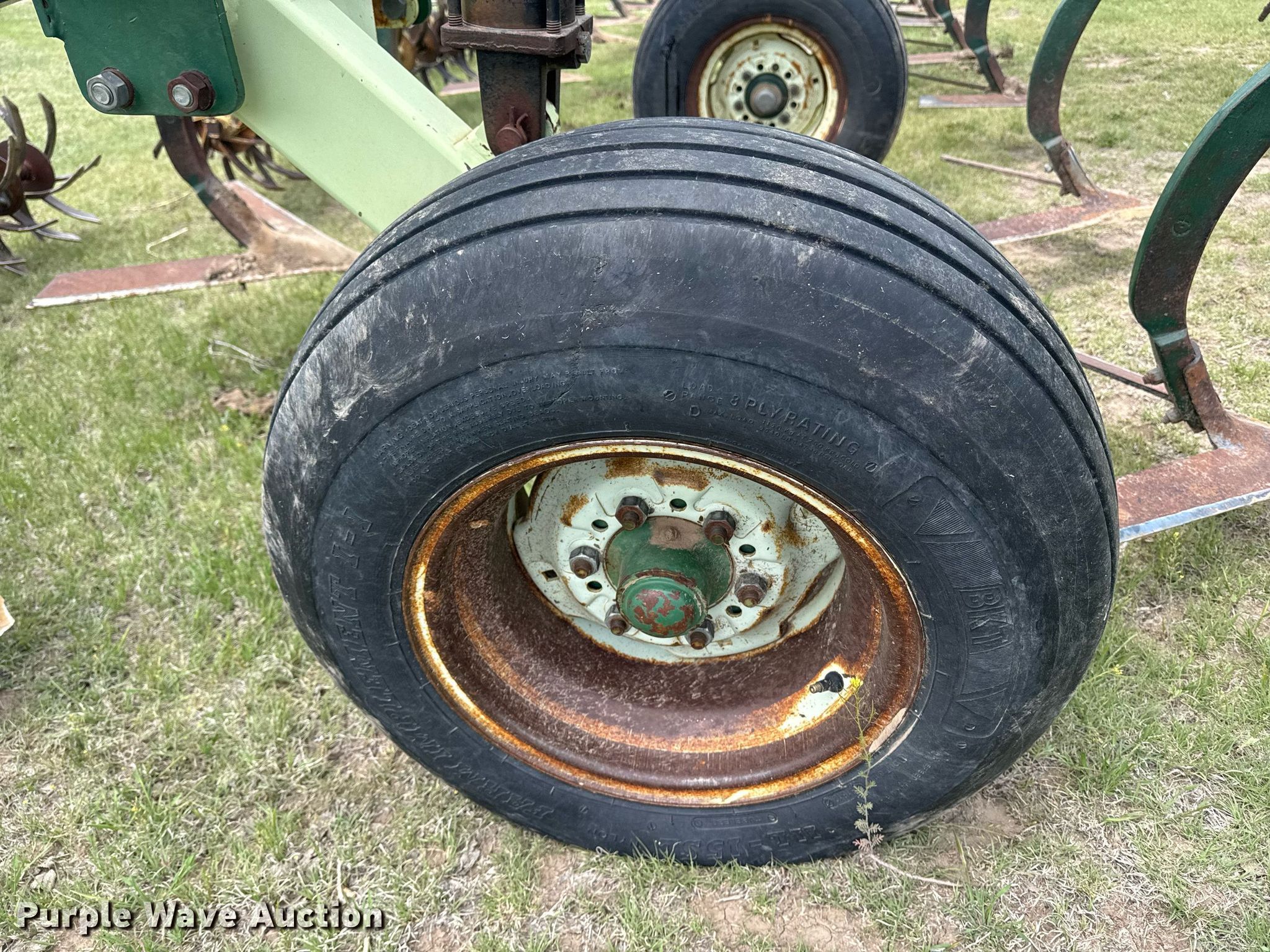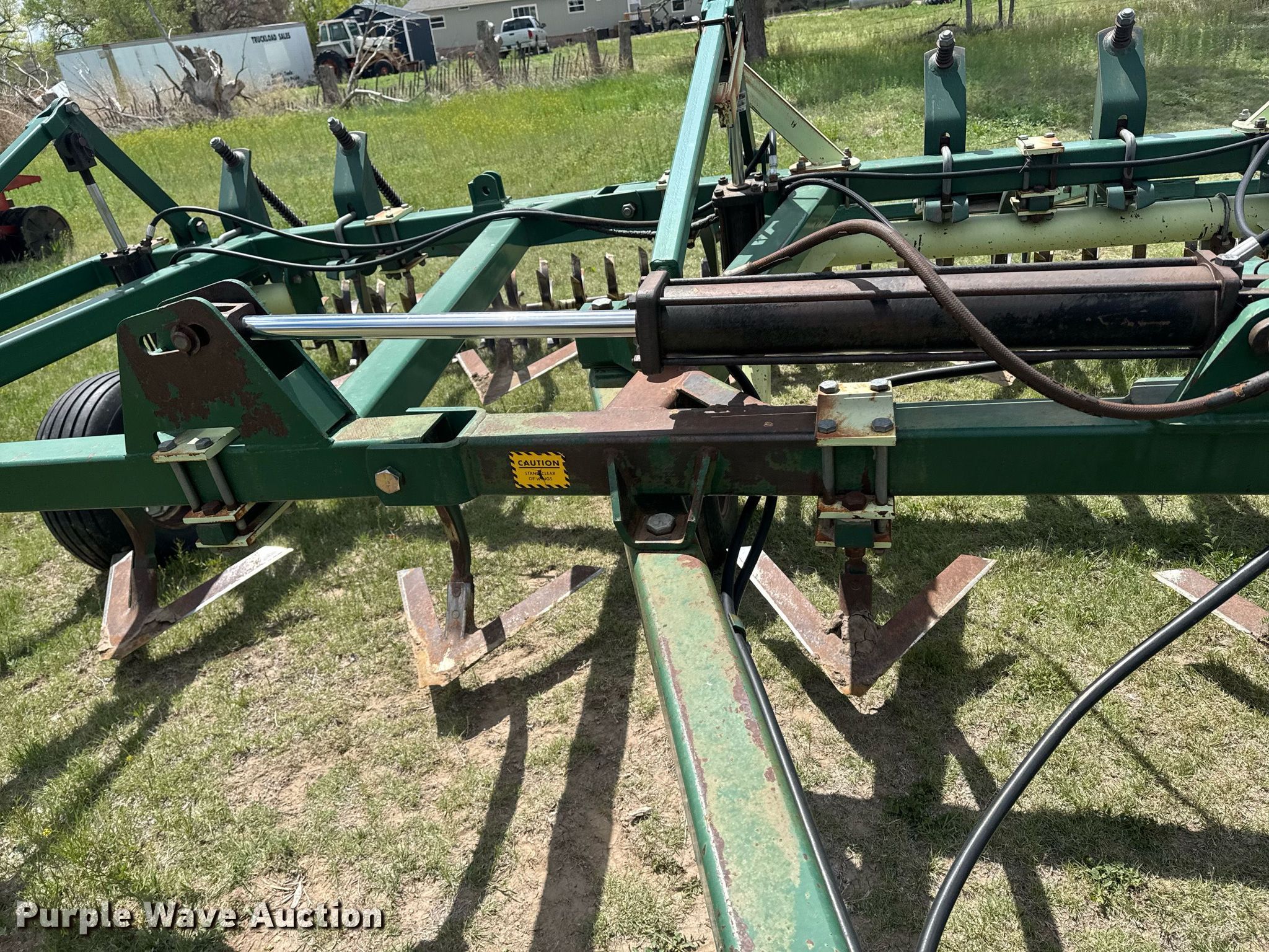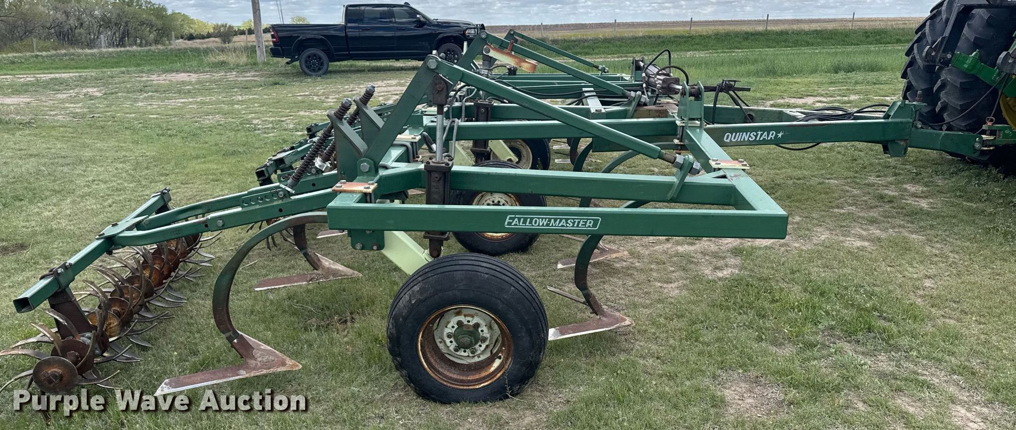 Quinstar Fallow-Master field cultivator. Overall width: 21' 6", Serial: FM9004549. Features Shanks: 13, Sweep width: 26", Operation Hydraulic lift, Hydraulic fold, Attachments Rolling pickers/ treader. Tires Tire size: 11L-15. Notes Tractor not included. Flipse Hay Service. Oakley, KS 67748
