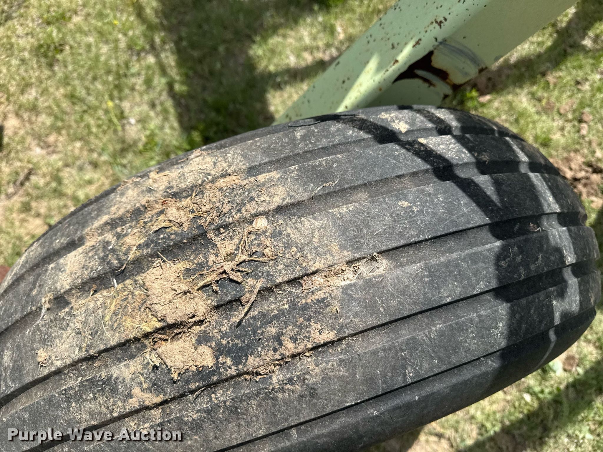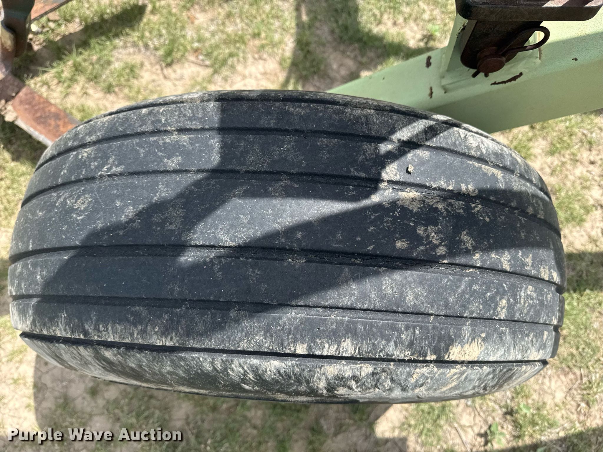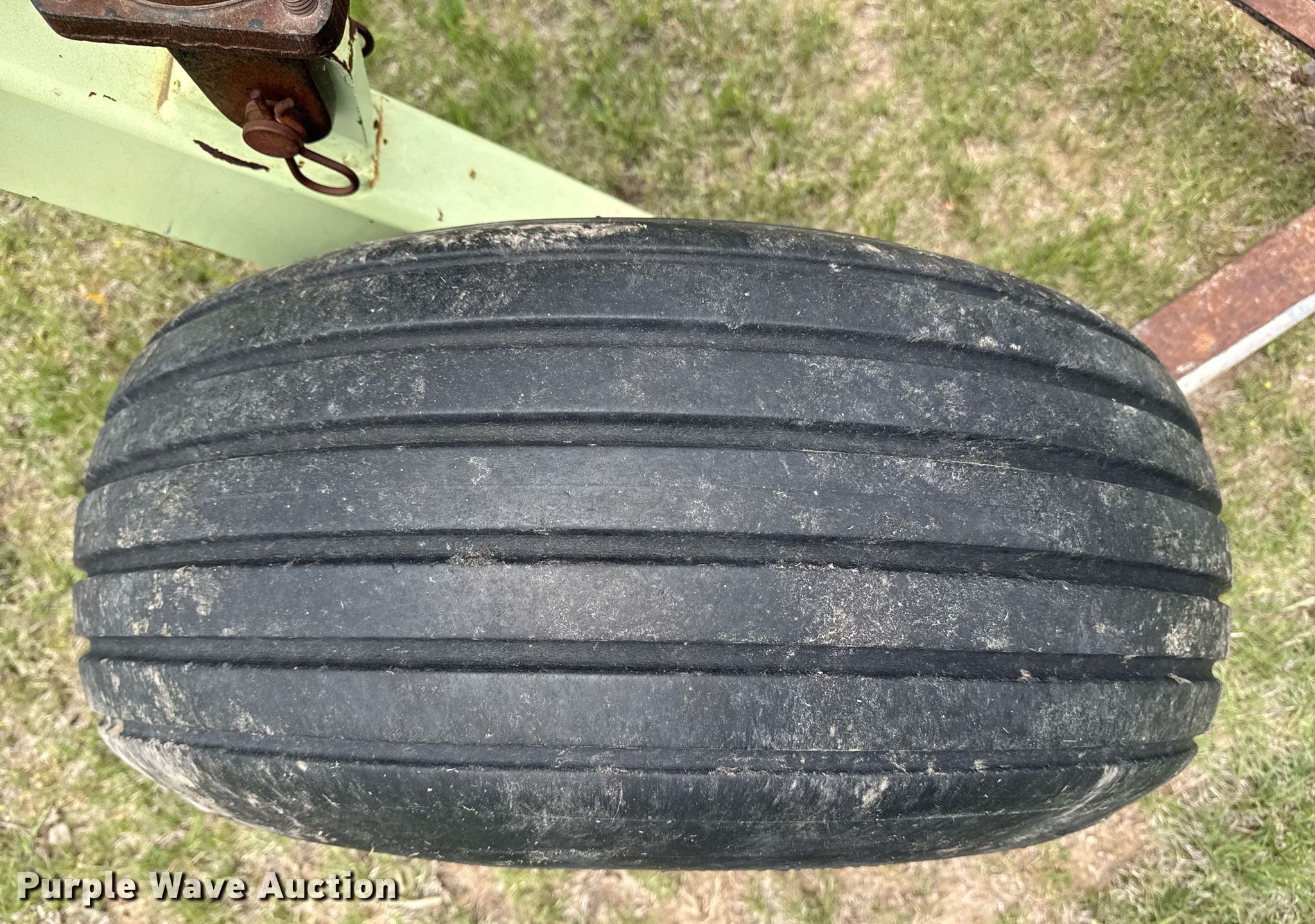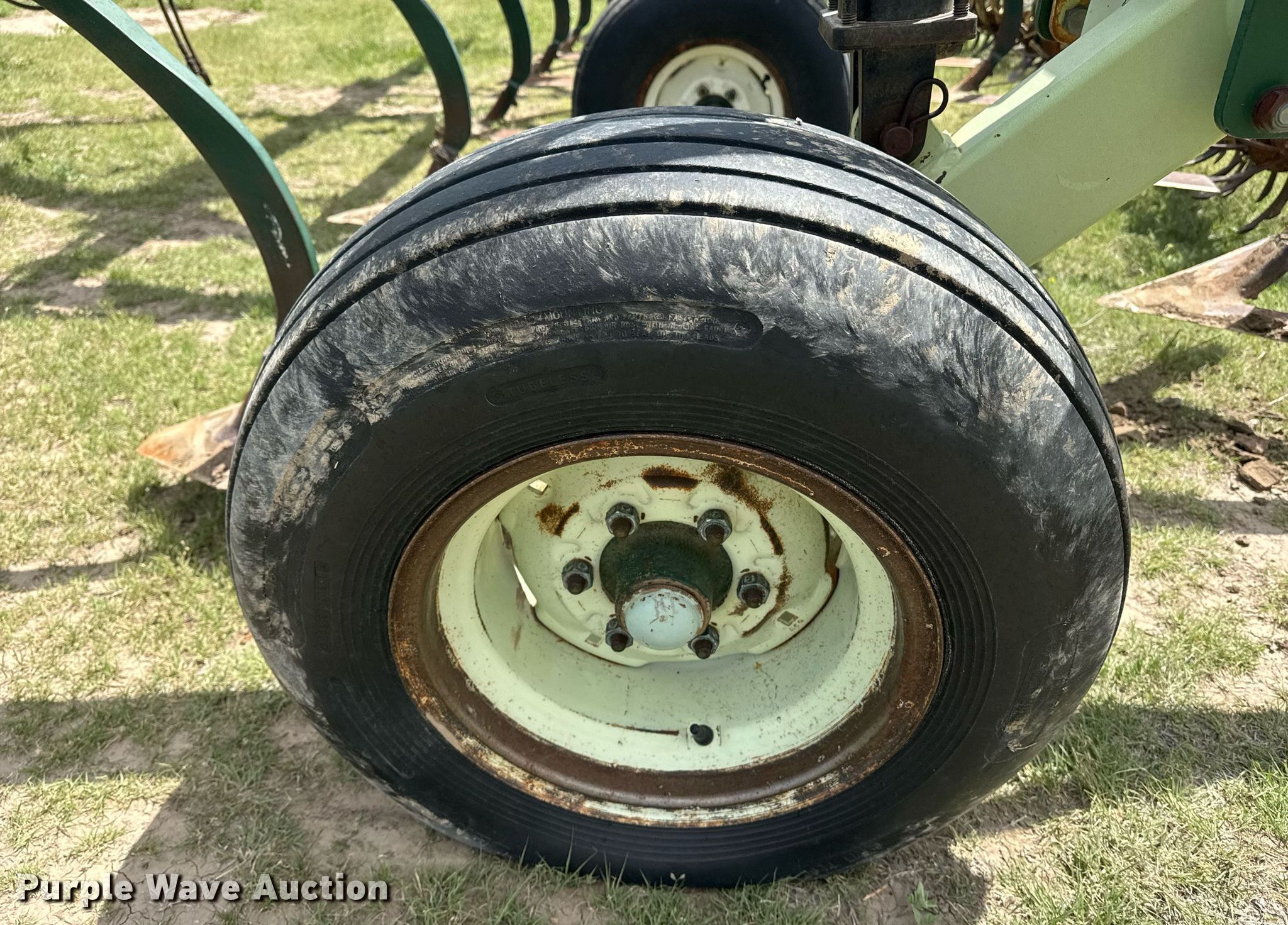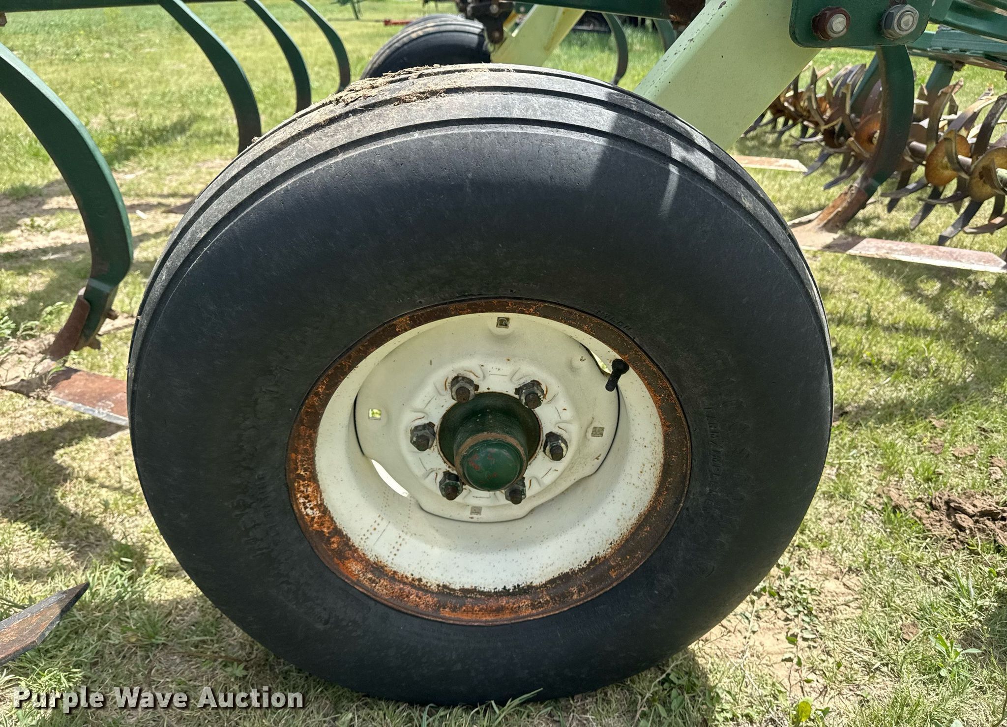 Quinstar Fallow-Master field cultivator. Overall width: 21' 6", Serial: FM9004549. Features Shanks: 13, Sweep width: 26", Operation Hydraulic lift, Hydraulic fold, Attachments Rolling pickers/ treader. Tires Tire size: 11L-15. Notes Tractor not included. Flipse Hay Service. Oakley, KS 67748