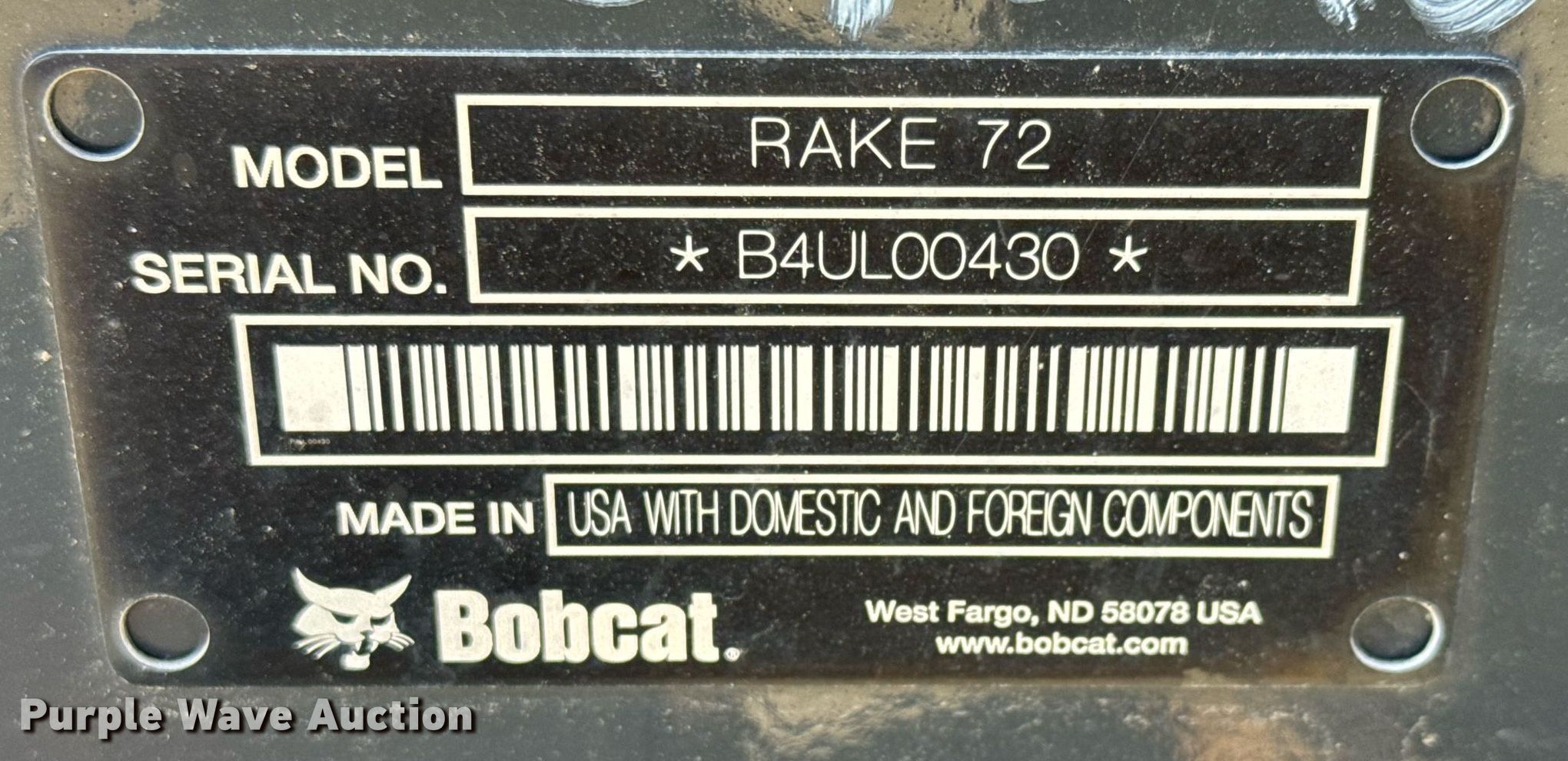 Purple Wave is selling a used Ag Equip. Other in Kansas. This item is a Bobcat Rake 72 landscape rake with the following: Serial: B4UL00430