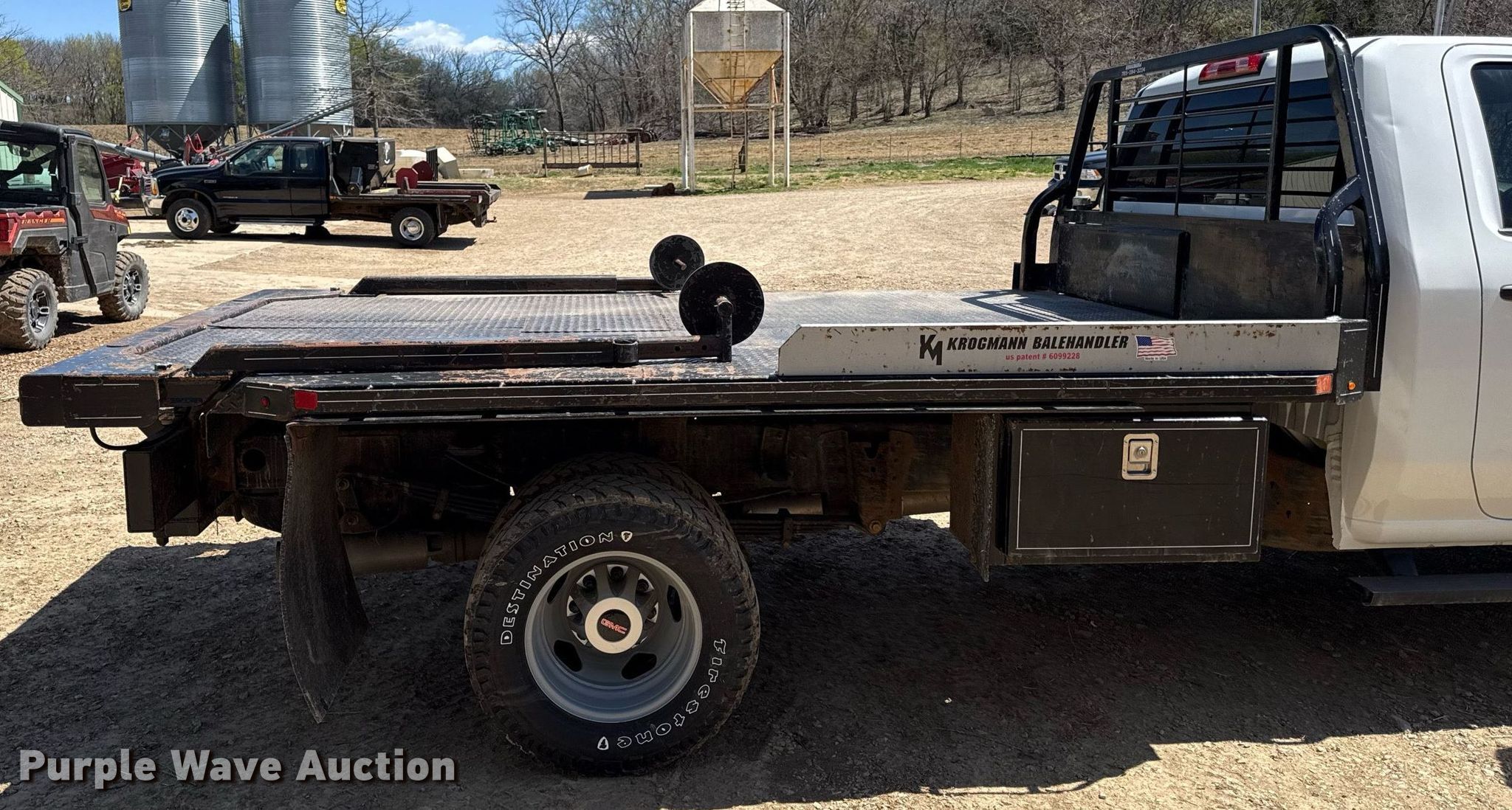 2020 GMC Sierra 3500HD bale bed pickup truck. Miles: 65,940 on odometer, Hours: 2,961 on meter, VIN: 1GD39SEY8LF289882. Engine Displacement: 6.6L V8 OHV, Cylinders: 8, Fuel type: Diesel. Transmission Automatic, Four wheel drive. Interior AC, Heat, Power windows, Power locks, Cruise control. Features Hydraulic bale bed Krogman, 11' x 94" W, Bale arm, Hitch: Gooseneck. Tires Size: 245/75R17. Kansas title. Title distribution may be delayed up to 30 days from verification of funds. Mike Petrie & Sons, LLC. Oskaloosa, KS 66066