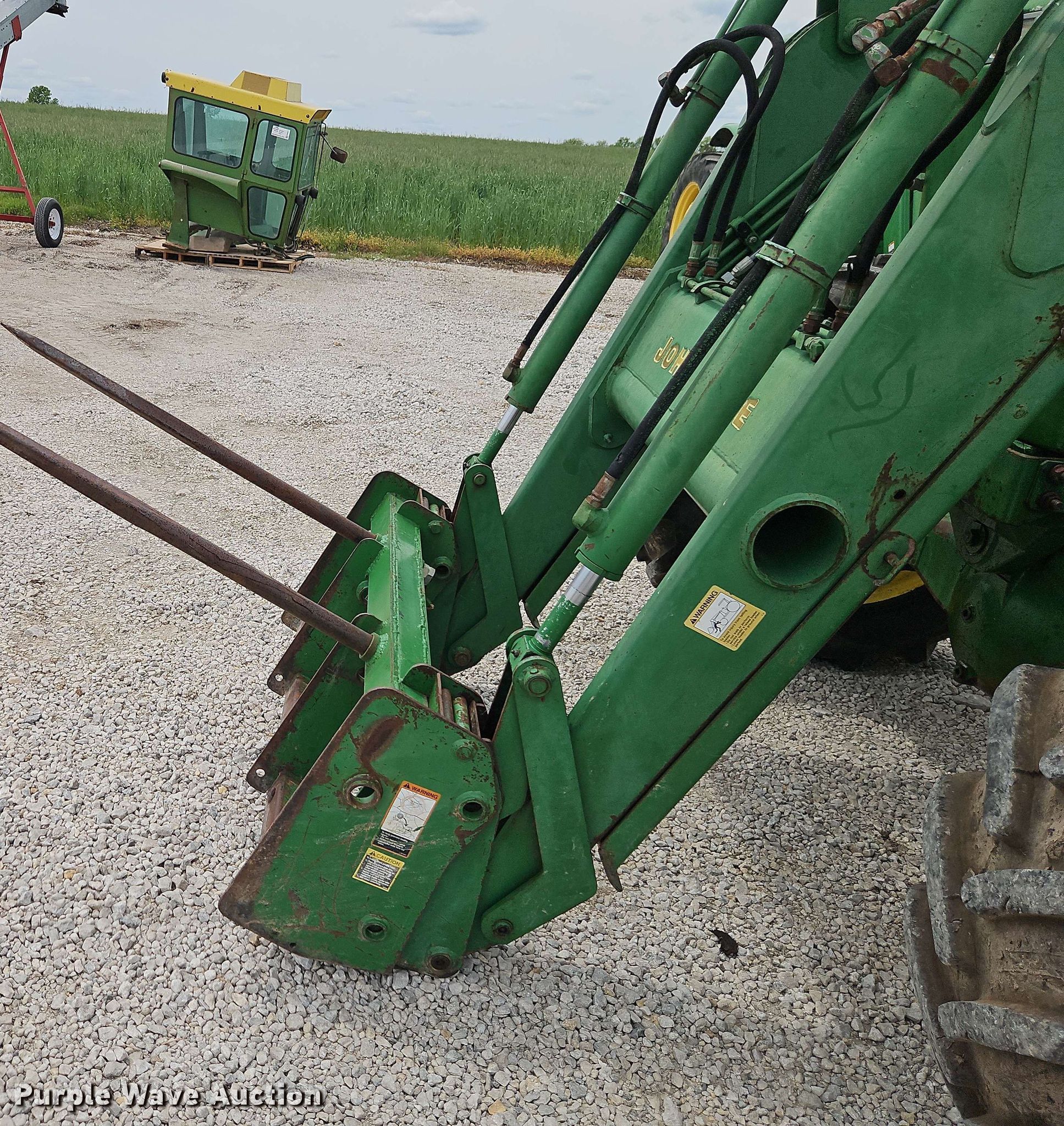1992 John Deere 4455 MFWD tractor. Hours: 8,564 on meter, Serial: RW4455P012656. Engine John Deere 6076, Cylinders: 6, Fuel type: Diesel. Transmission Powershift, 15F - 4R, Differential lock. Operators station AC, Heat. Features PTO: 540, 1000, Three point Top link, Seven pin outlet, Hydraulic remote sets Rear: 3, Loader John Deere 740, Quick attach, Bale spear, Controls: Joystick. Tires Front: 380/85R28, Rear: 480/80R42. Notes PTO issues, does not fully stop. Foote Cattle Company. Bucyrus, KS 66013