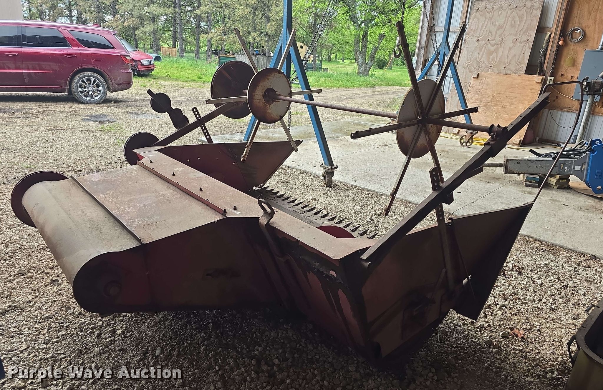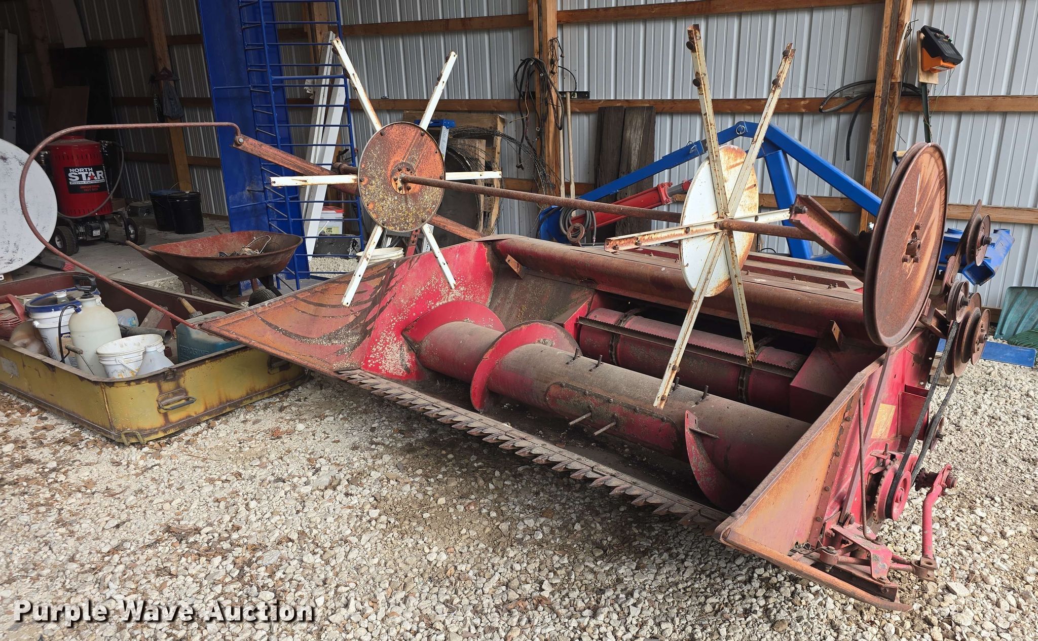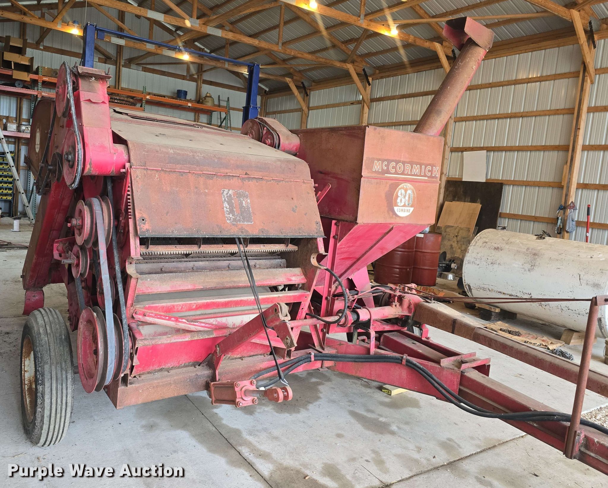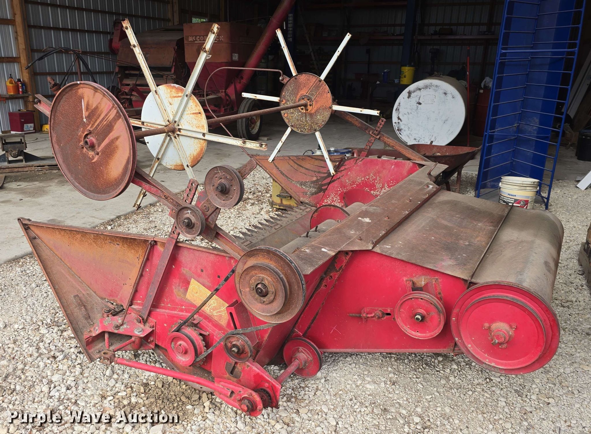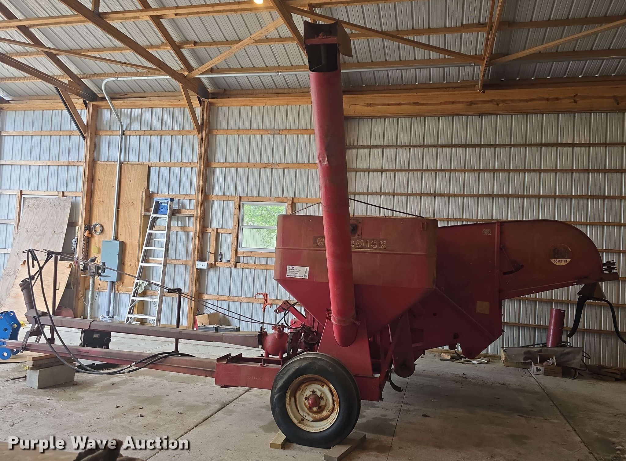 Purple Wave is selling a used Combine in Kansas. This item is a International Harvester McCormick No. 80 combine with the following: Cutting width: Approx. 6' to 7', Grain tank capacity: 26 bushels, Chaff spreader, Unloading auger length: 7', PTO: 540, Header, International Harvester McCormick, Platform head, Width: 80", Rigid, Reel: Bat, Hydraulic fore/aft, Skid plates: Steel