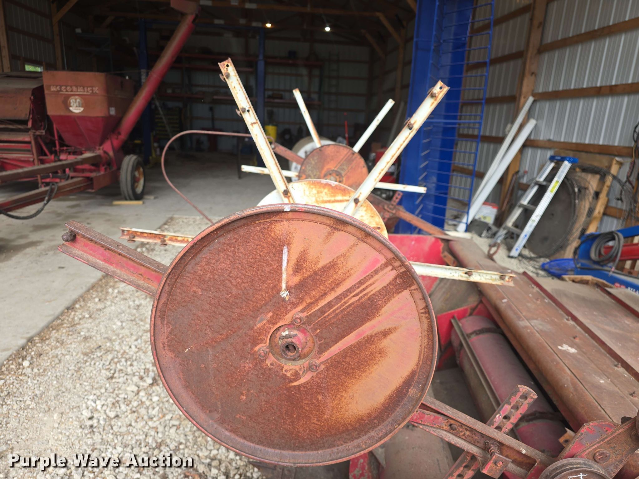 International Harvester McCormick No. 80 combine. Features. Cutting width: Approx. 6' to 7', Grain tank capacity: 26 bushels, Chaff spreader, Unloading auger length: 7', PTO: 540, Header International Harvester McCormick, Platform head Width: 80", Rigid, Reel: Bat Hydraulic fore/aft, Skid plates: Steel. Tires Size: 6.50-16, Brand: Firestone. Notes Belts may need replaced, Reel and bat planks missing, Unknown operating condition. Maple Hill, KS 66507