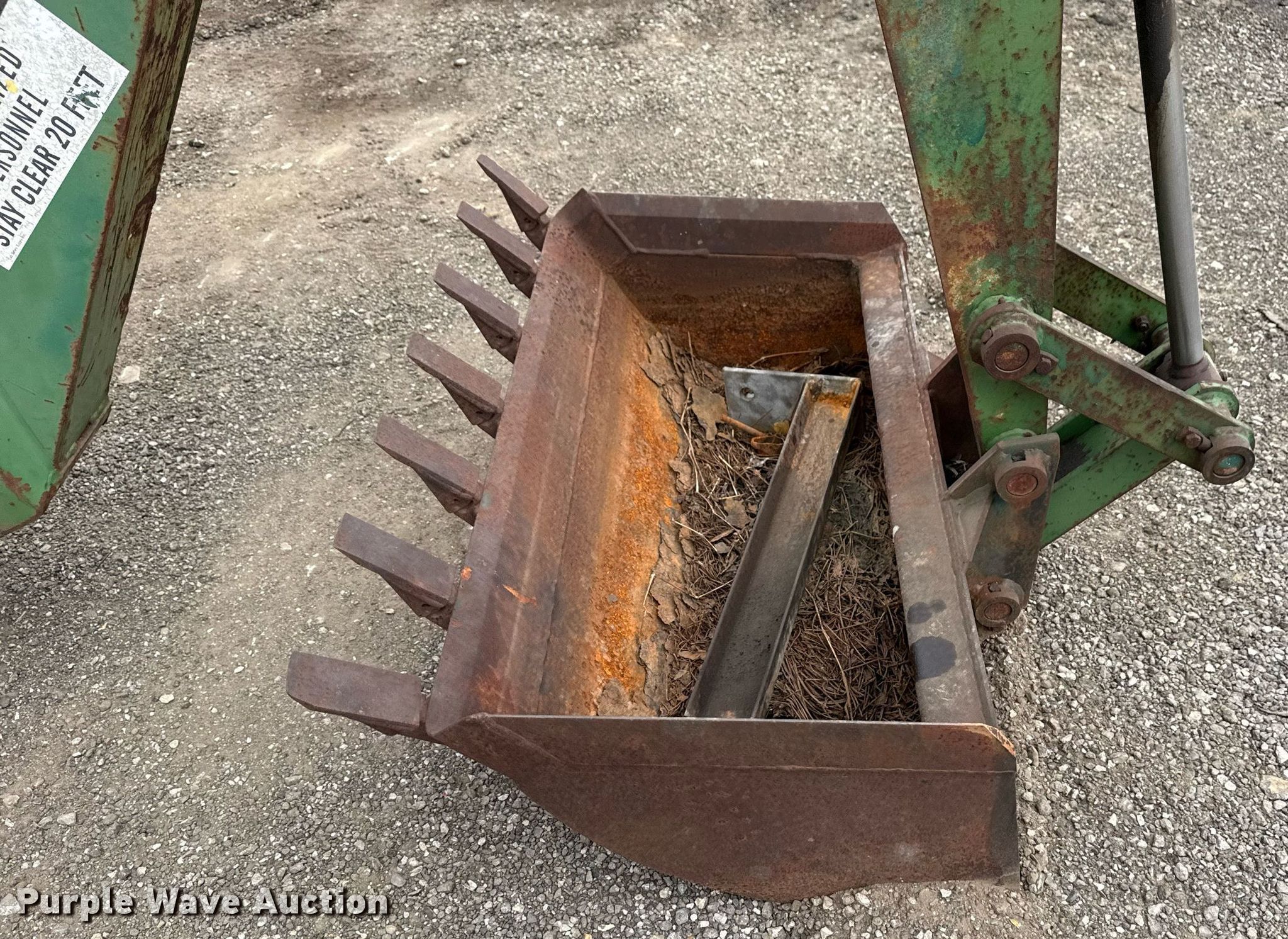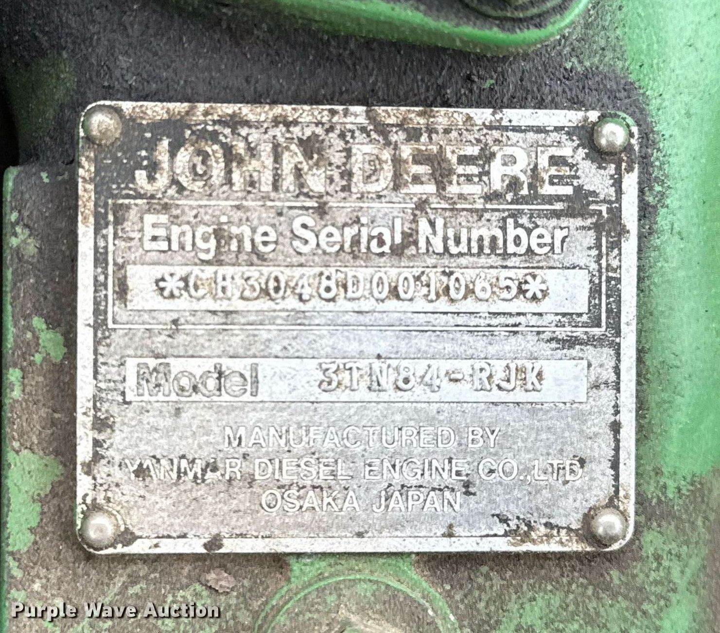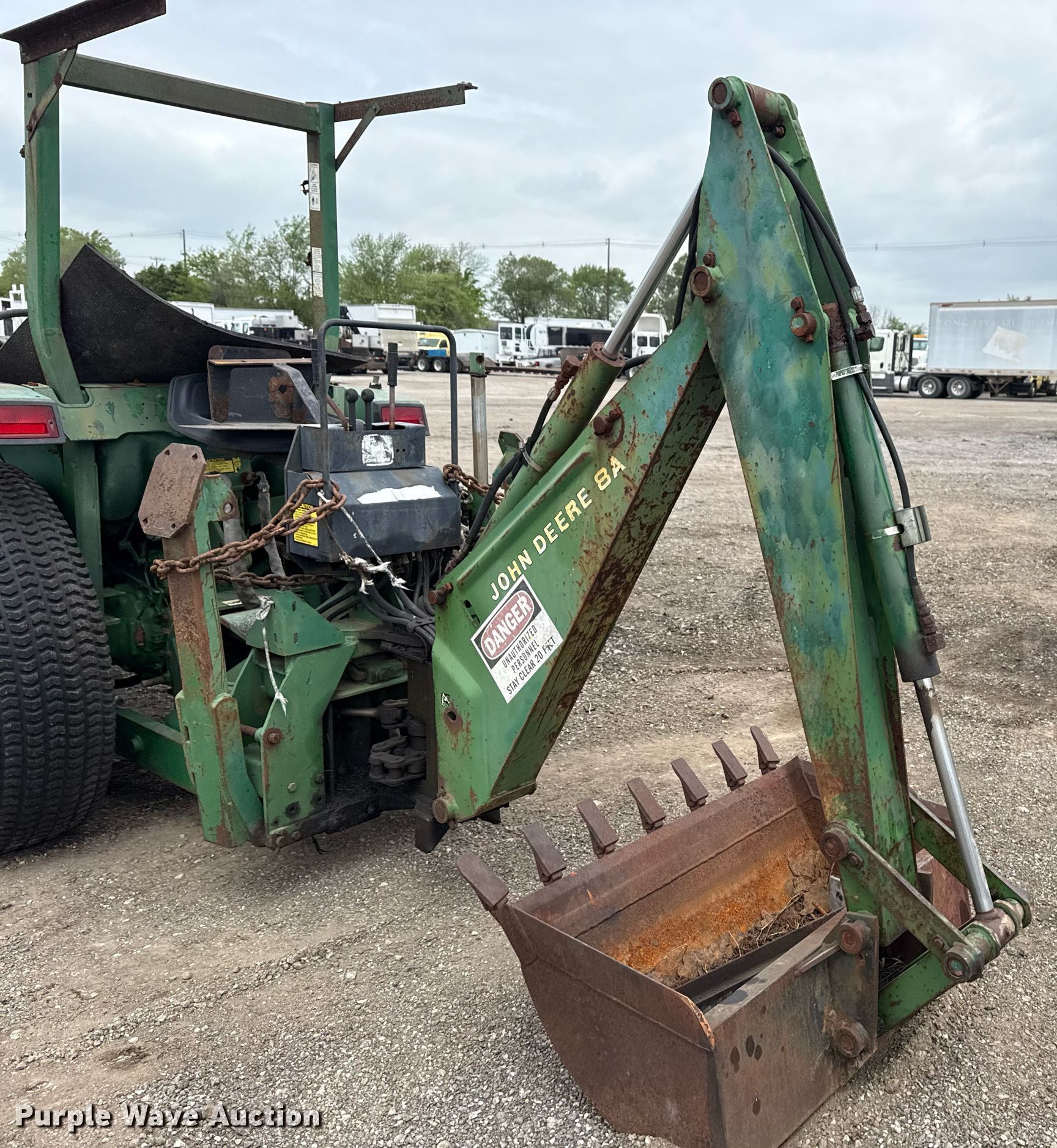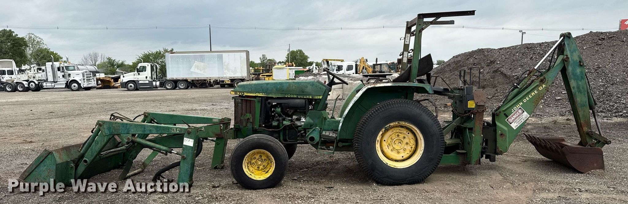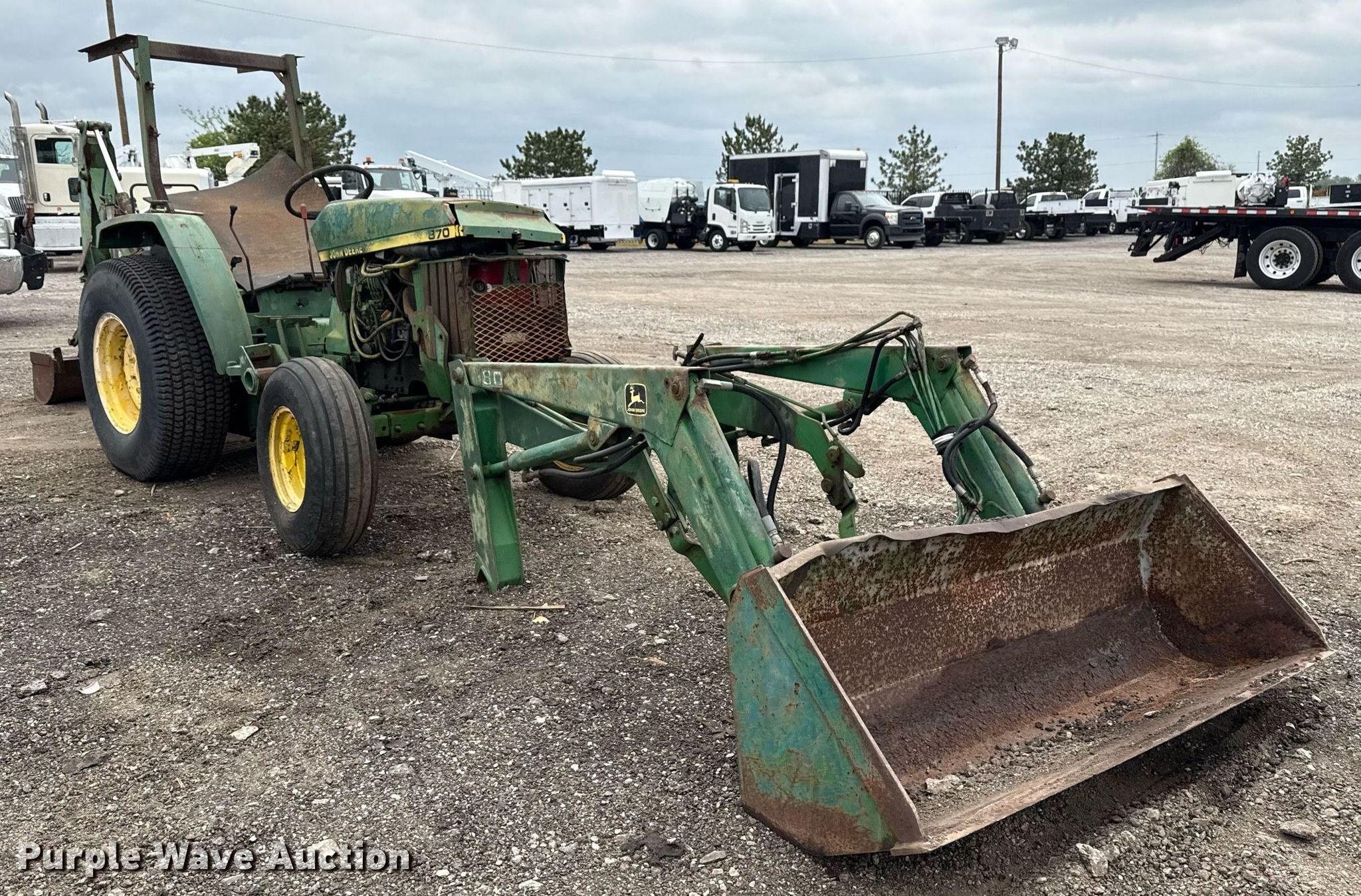John Deere 870 tractor. Hours: 3,117 on meter. Engine John Deere 3TN64-RJK, Serial: CH3048D001065, Cylinders: 3, Fuel type: Diesel. Transmission Manual, Differential lock. Features PTO: 540, Three point, Rear: 1, Loader John Deere 80, Controls: Joystick, Bucket Width: 63", John Deere 8A backhoe attachment Bucket Width: 35", Teeth: 7.. Tires Front: 9.5L-14SL, Rear: 355/80D20. Notes Hydraulic leak, Unknown operating condition. 15107 North 137th East Avenue. Collinsville, OK 74021