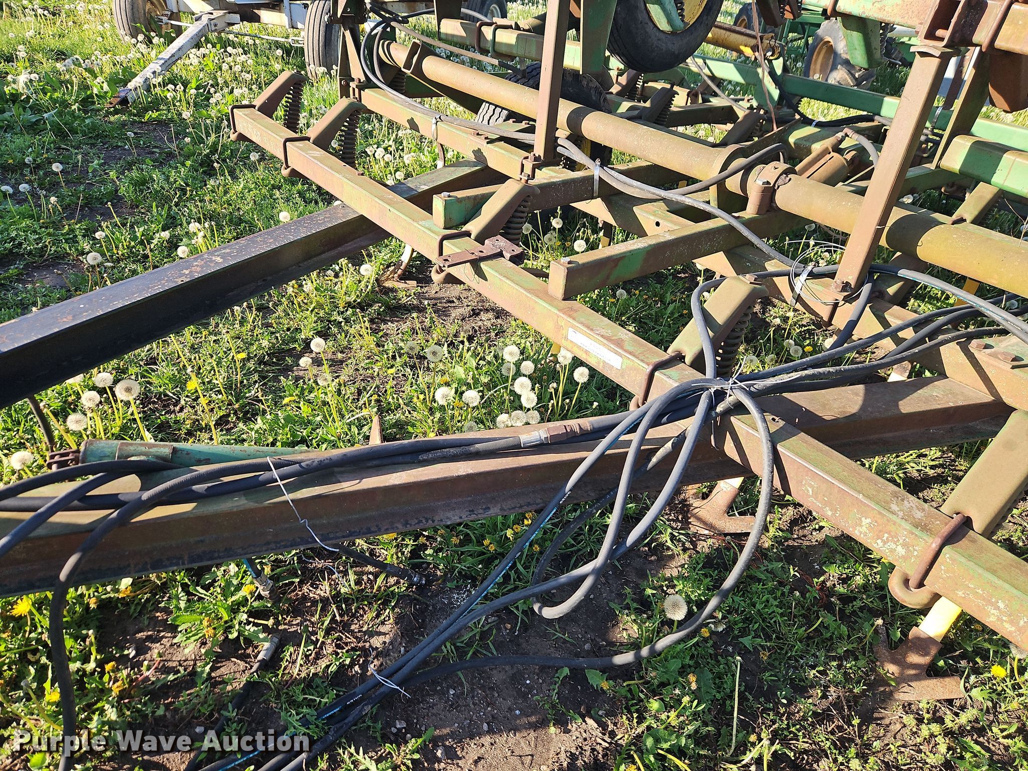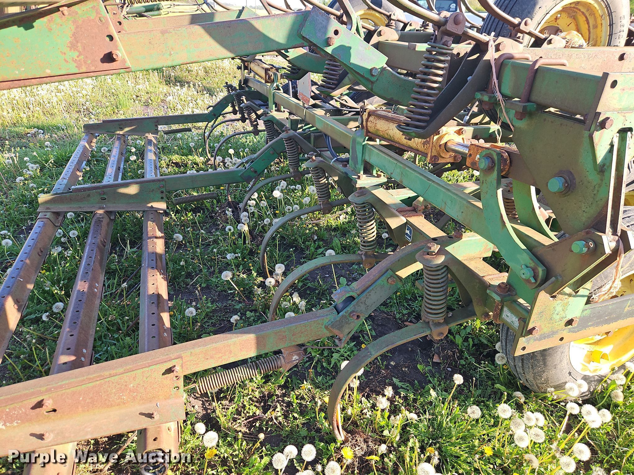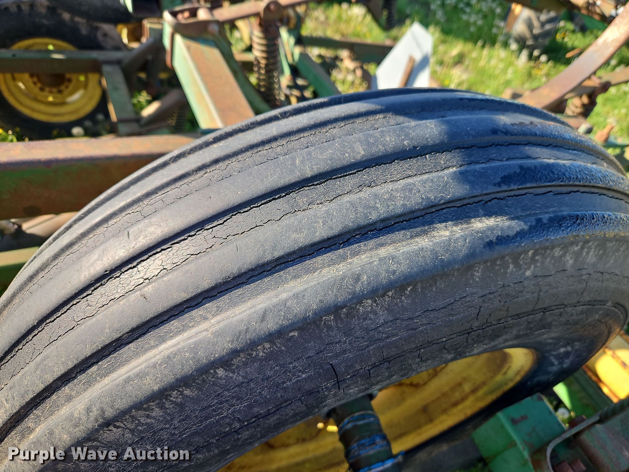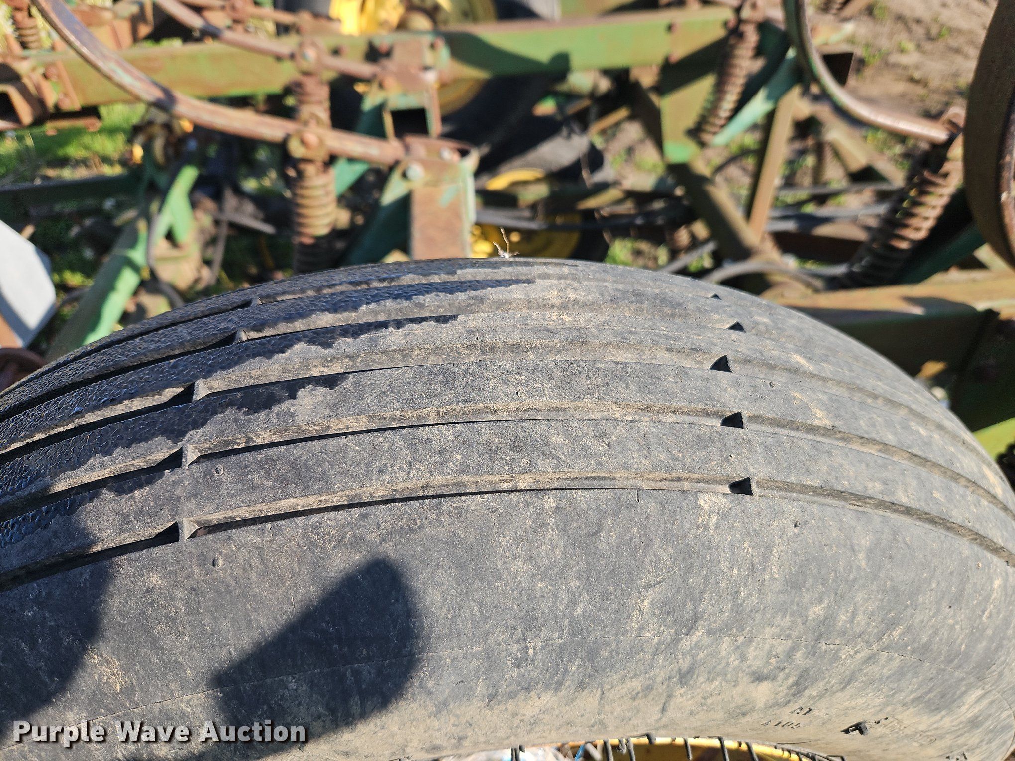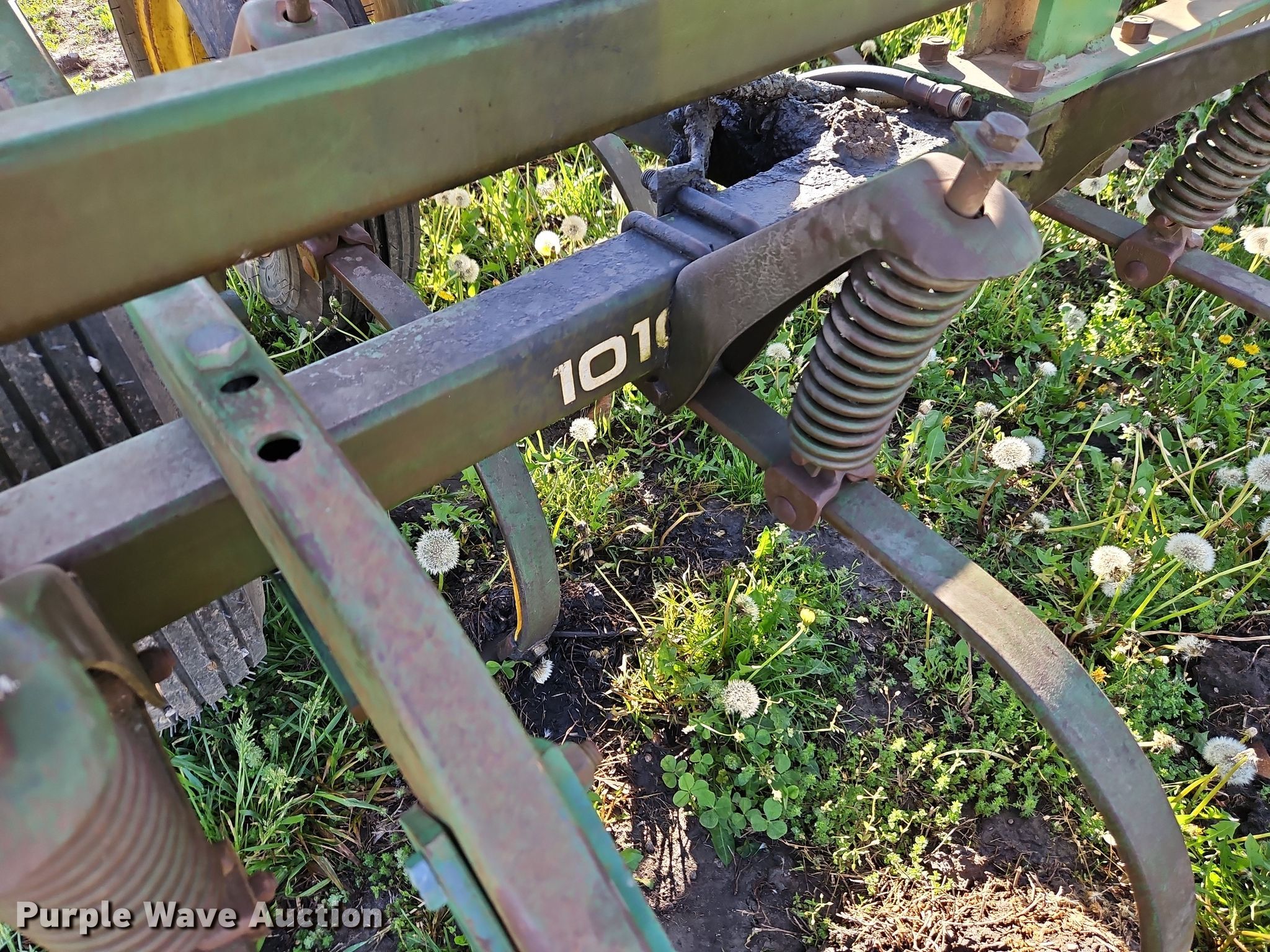John Deere 1010 field cultivator. Overall width: 24'. Features Shanks: 47, Sweep width: 9", Operation Hydraulic lift, Hydraulic fold, Attachments Tine harrow Harrow bars: 3.. Tires Tire size: 7.60L-15, Gauge wheels Size: 7.60L-15. Butler, MO 64730
