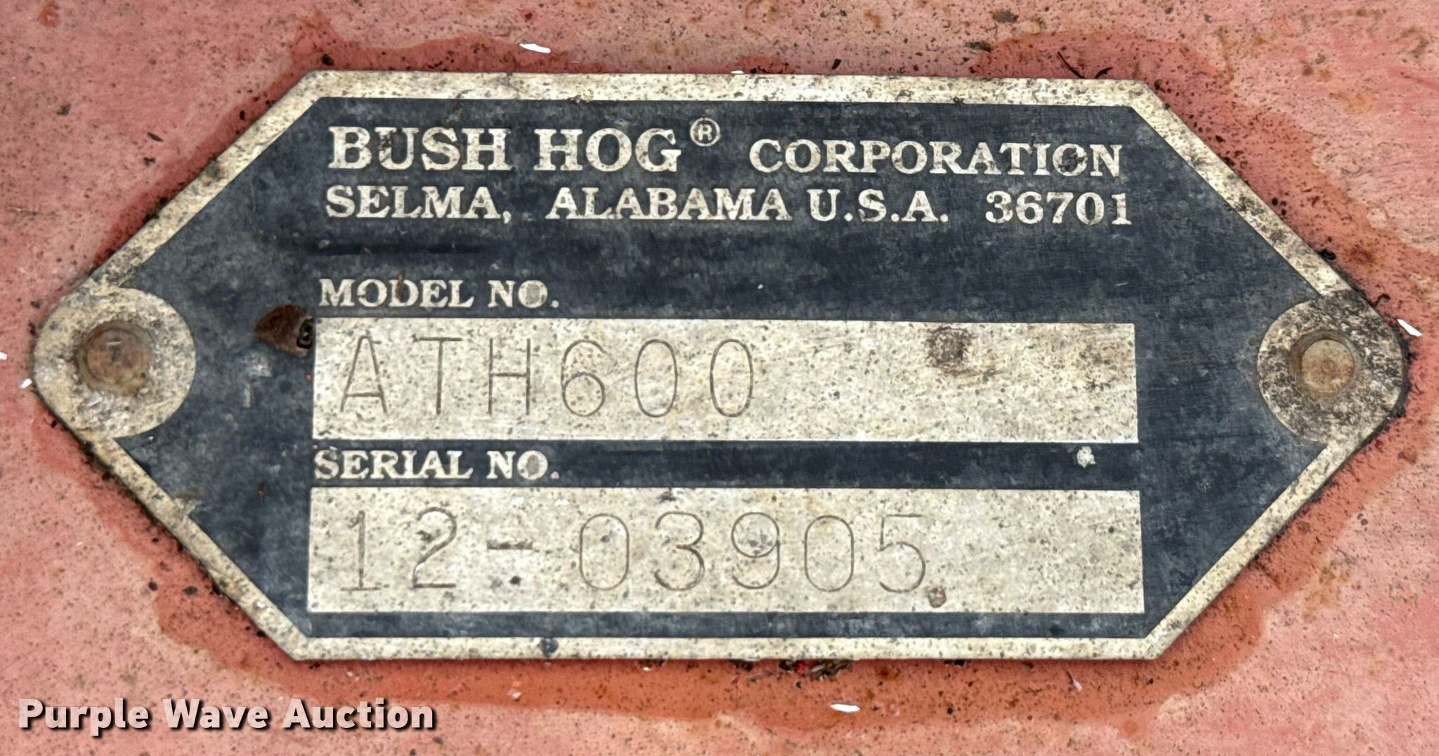 Bush Hog ATH600 finish mower. Serial: 12-03905. Features Width: 60", PTO: 540, Hitch: Three point. Notes Unknown operating condition. Bremond, TX 76629