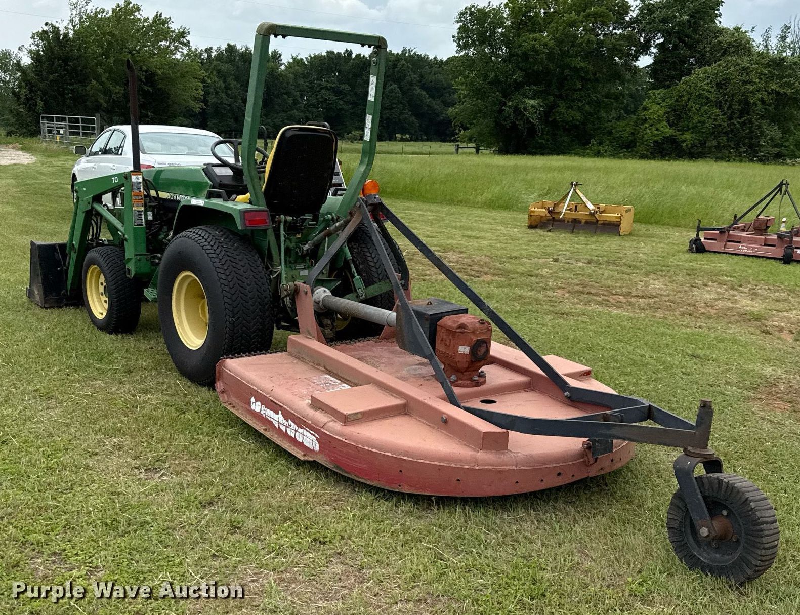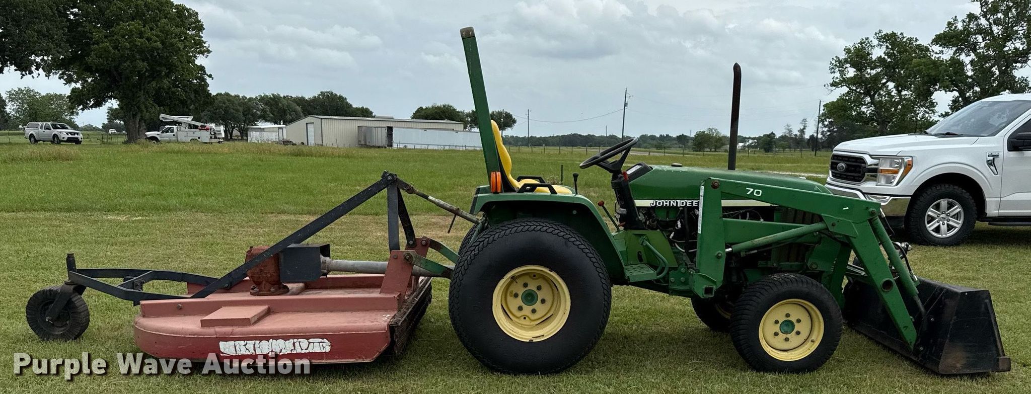 2007 John Deere 790 MFWD tractor. Hours: 840 on meter, Serial: LV0790G293601. Engine John Deere 3TNE84-JK, Cylinders: 3, Fuel type: Diesel. Transmission Manual, 8F - 2R. Operators station OROPS. Features PTO: 540, Three point Top link, Hydraulic remote sets Front: 2, Loader John Deere 70, Controls: Joystick, Bucket Width: 54", Bush Hog rotary mower Width: 60". Tires Front: 25x8.50-14, Rear: 13.6-16, Foam filled. Bremond, TX 76629