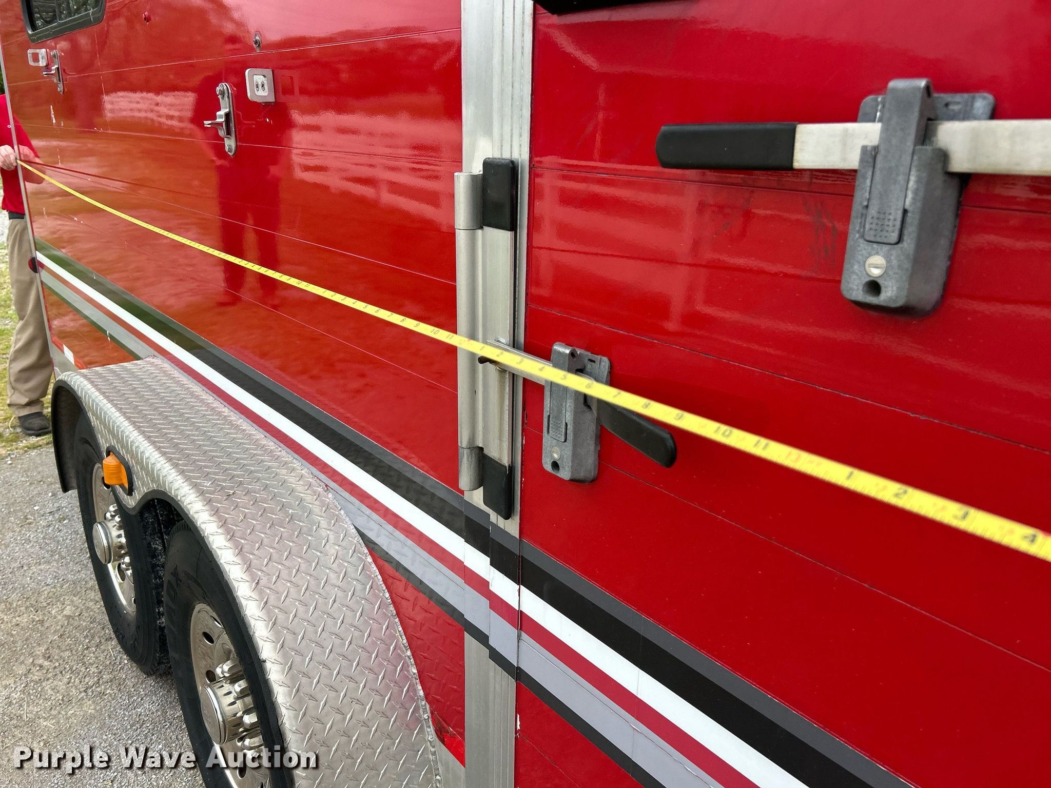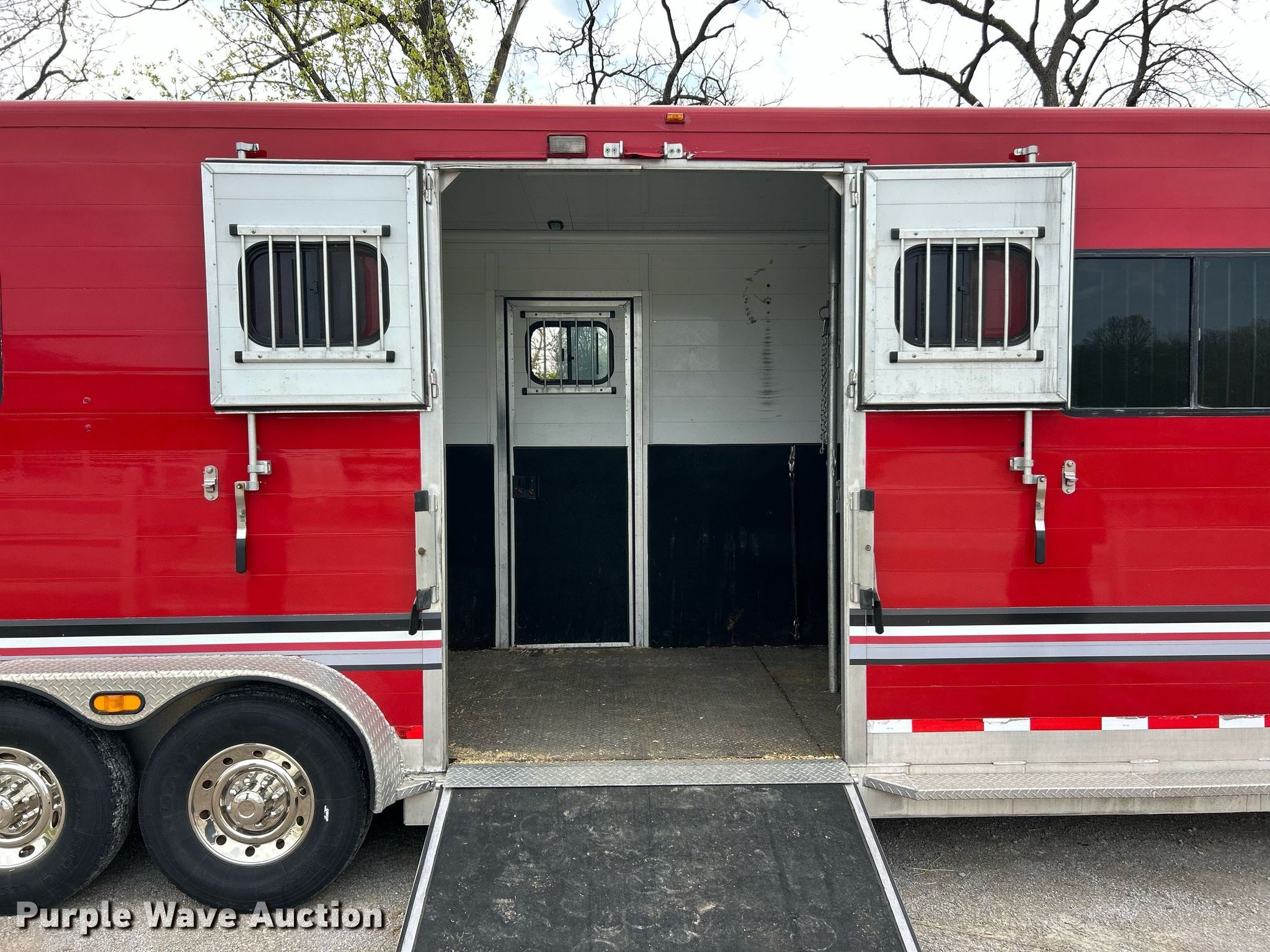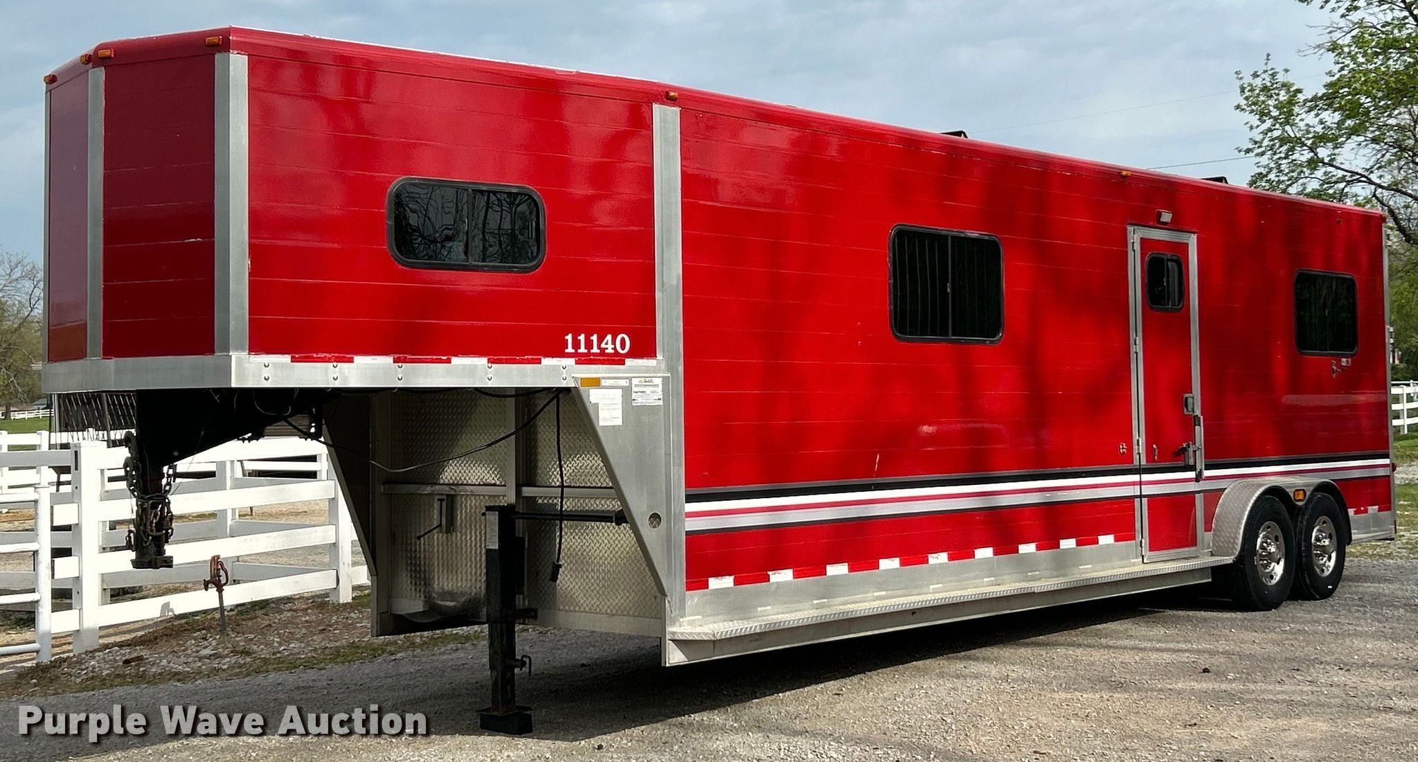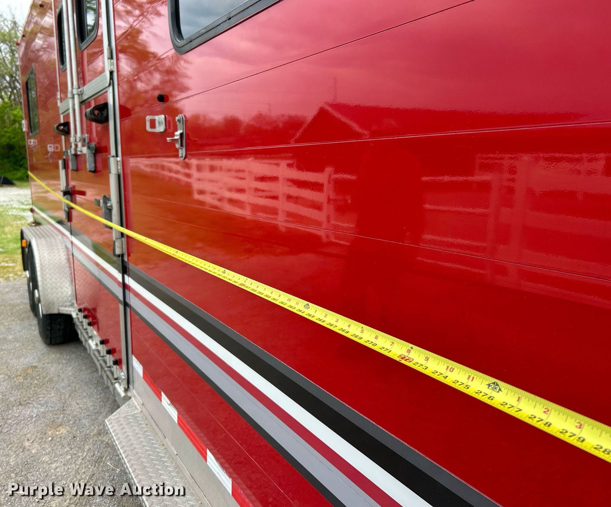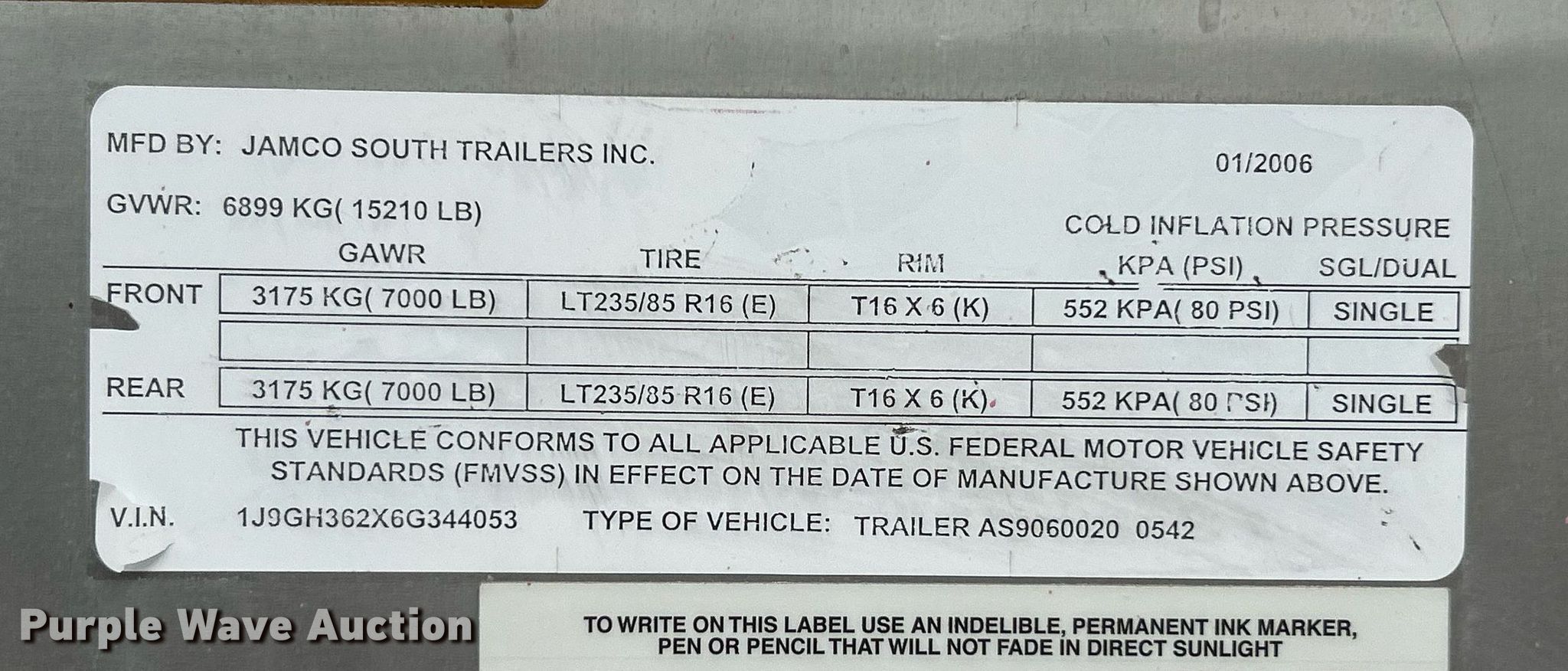 2006 Jamco South Trailers livestock trailer. VIN: 1J9GH362X6G344053. Dimensions Overall: 36' L x 102" W, Body: 24' L x 84" W, Side height: 102". Features Horse capacity: 4, Ground load, Rubber floor mat. Chassis Hitch: Gooseneck, Landing gear: Single, Brakes: Electric, Axles: Tandem, GVWR: 15,210 lbs, GAWR: 7,000 lbs. Tires Steel wheels, Size: 235/80R16. Missouri title. Title distribution may be delayed up to 30 days from verification of funds. St. Louis, MO 63123