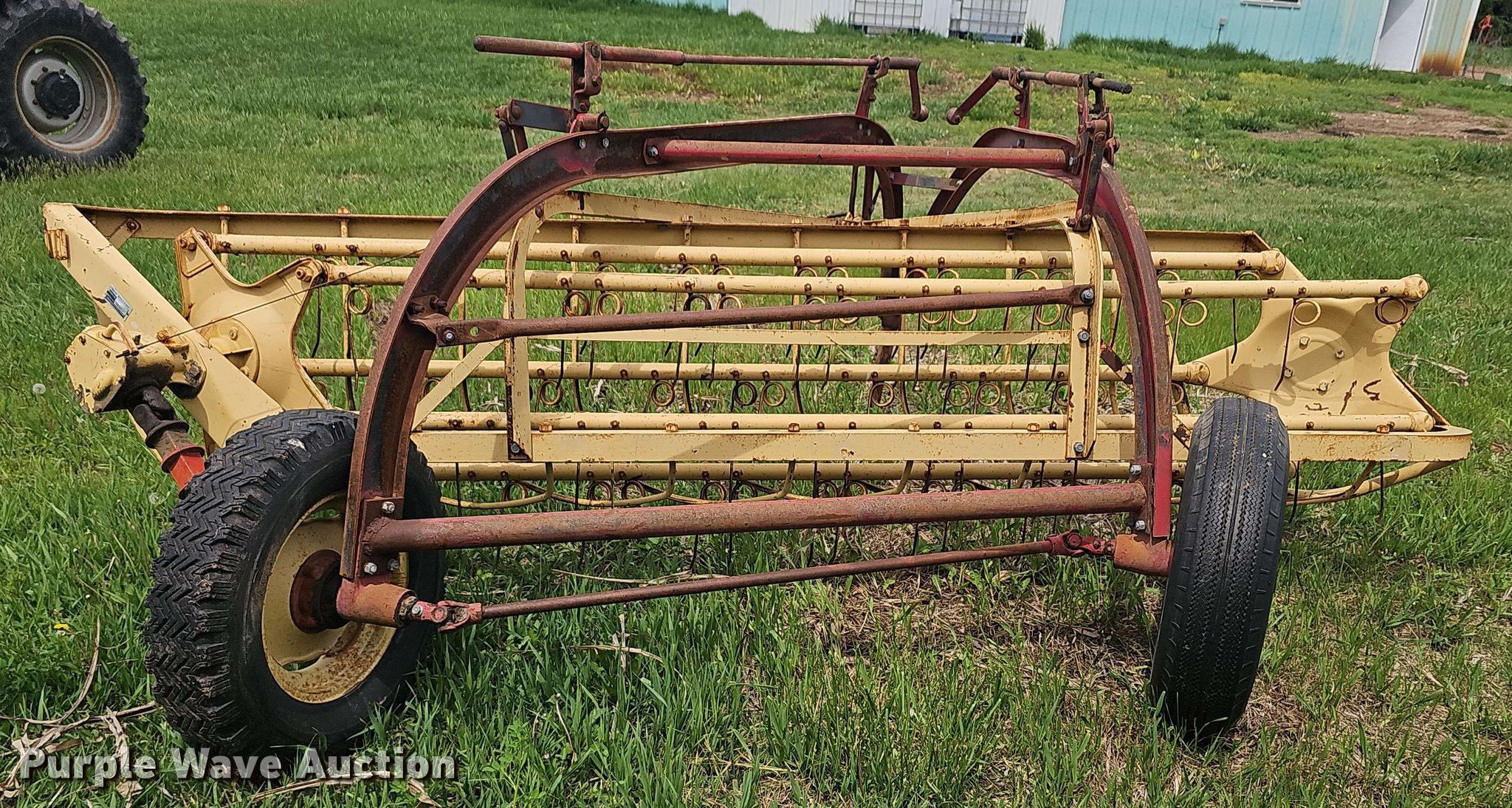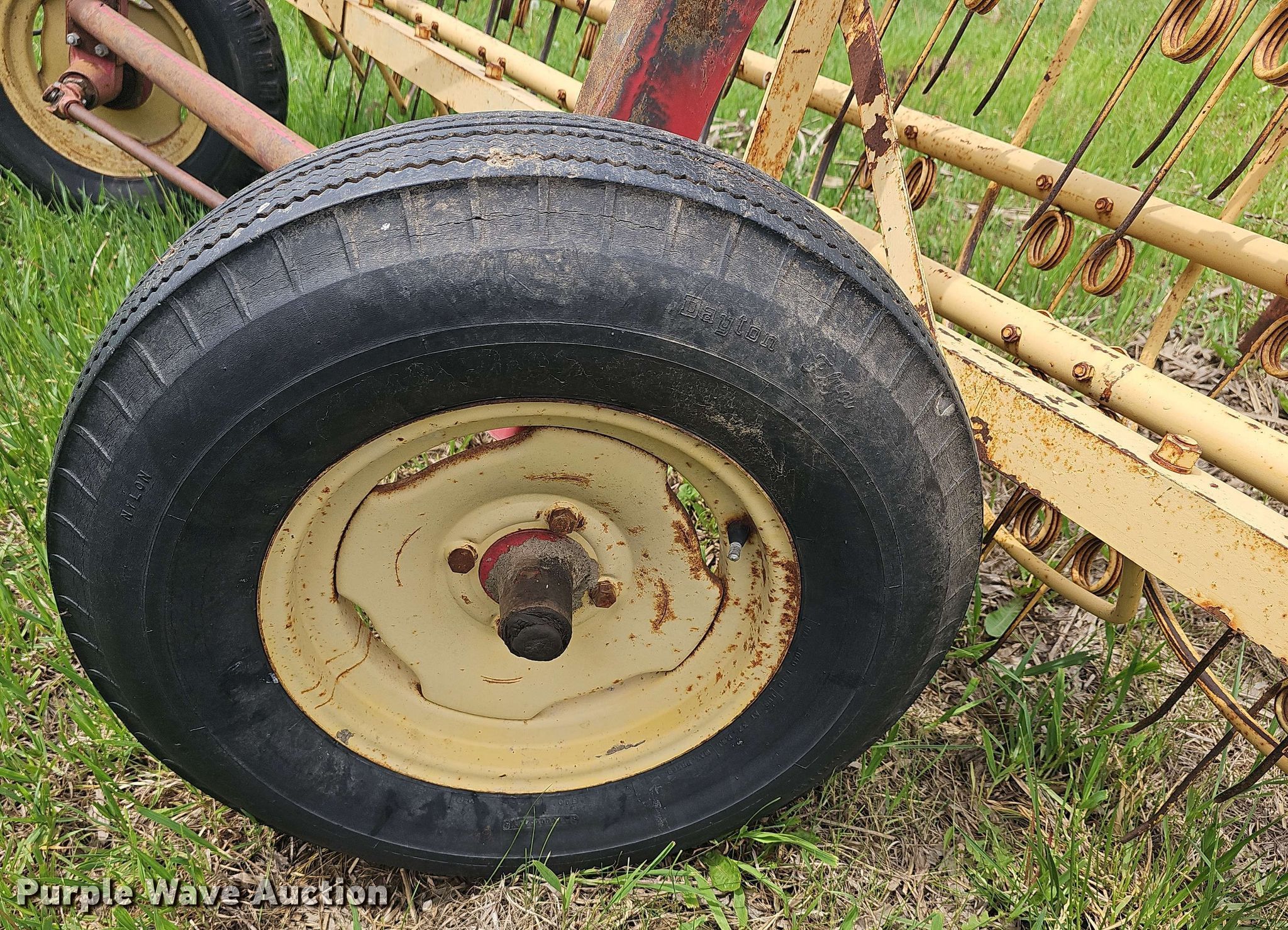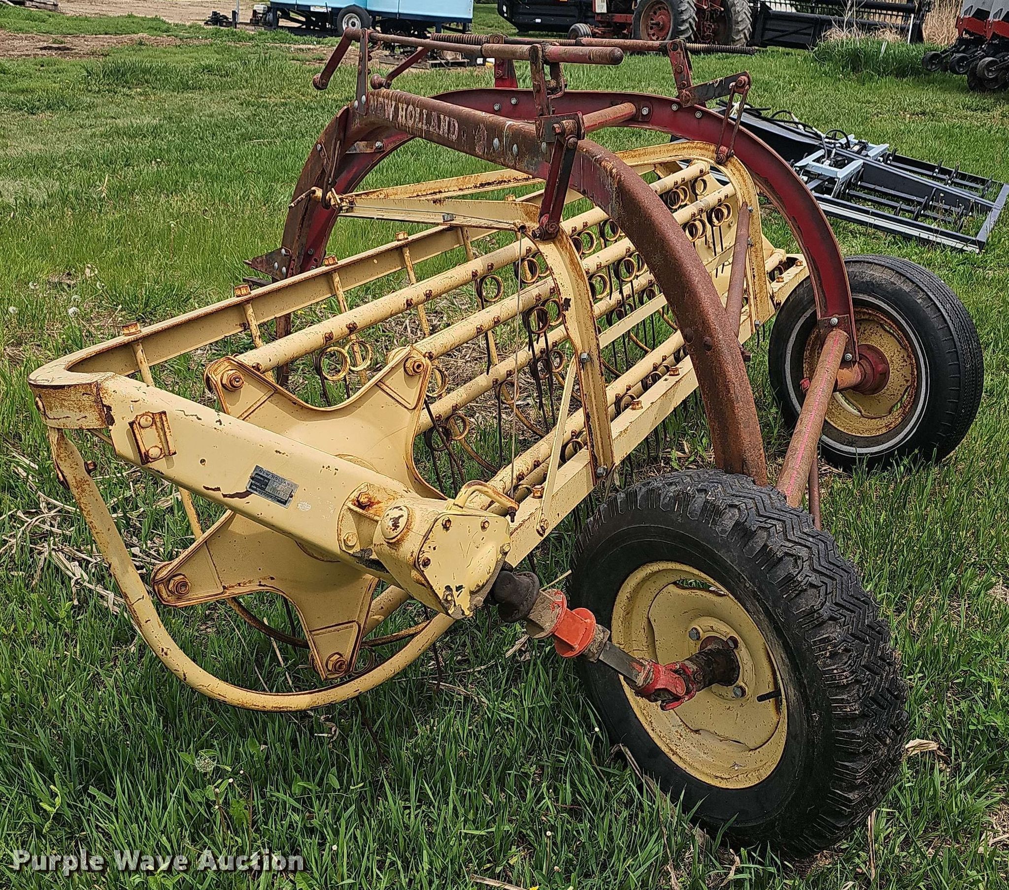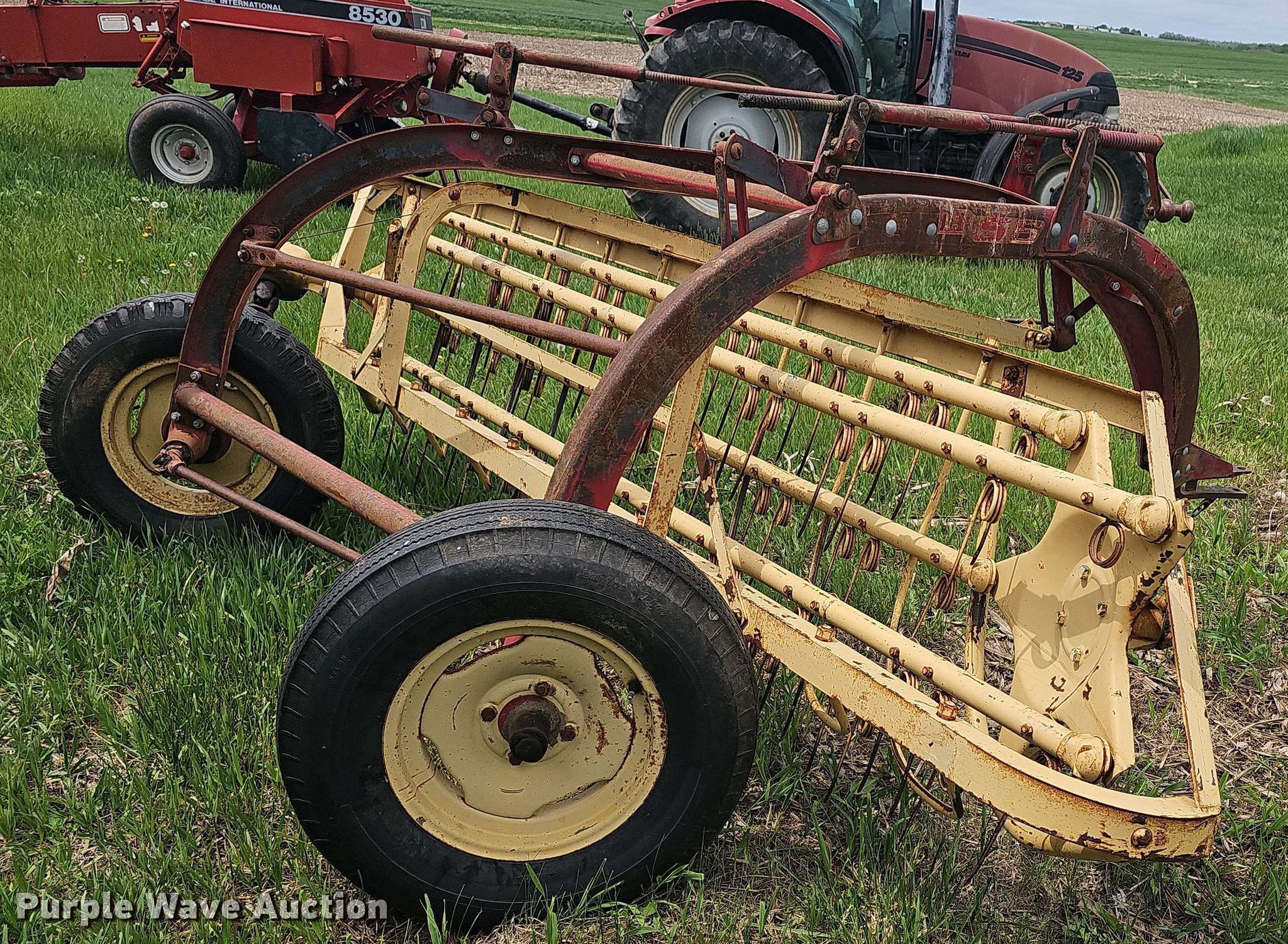 New Holland 56 hay rake. Serial: 22835. Features Width: 9', Ground driven, Hitch: Pin. Tires Size: 7.10-15. Abilene, KS 67410