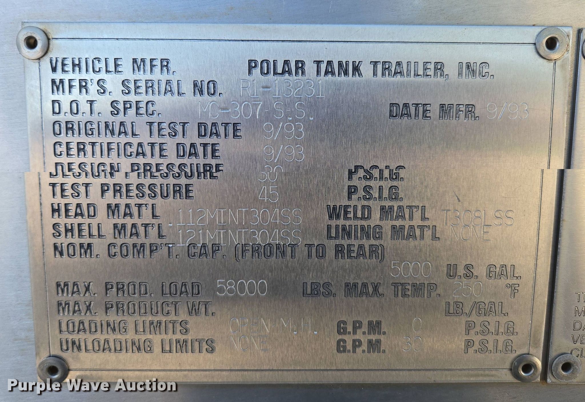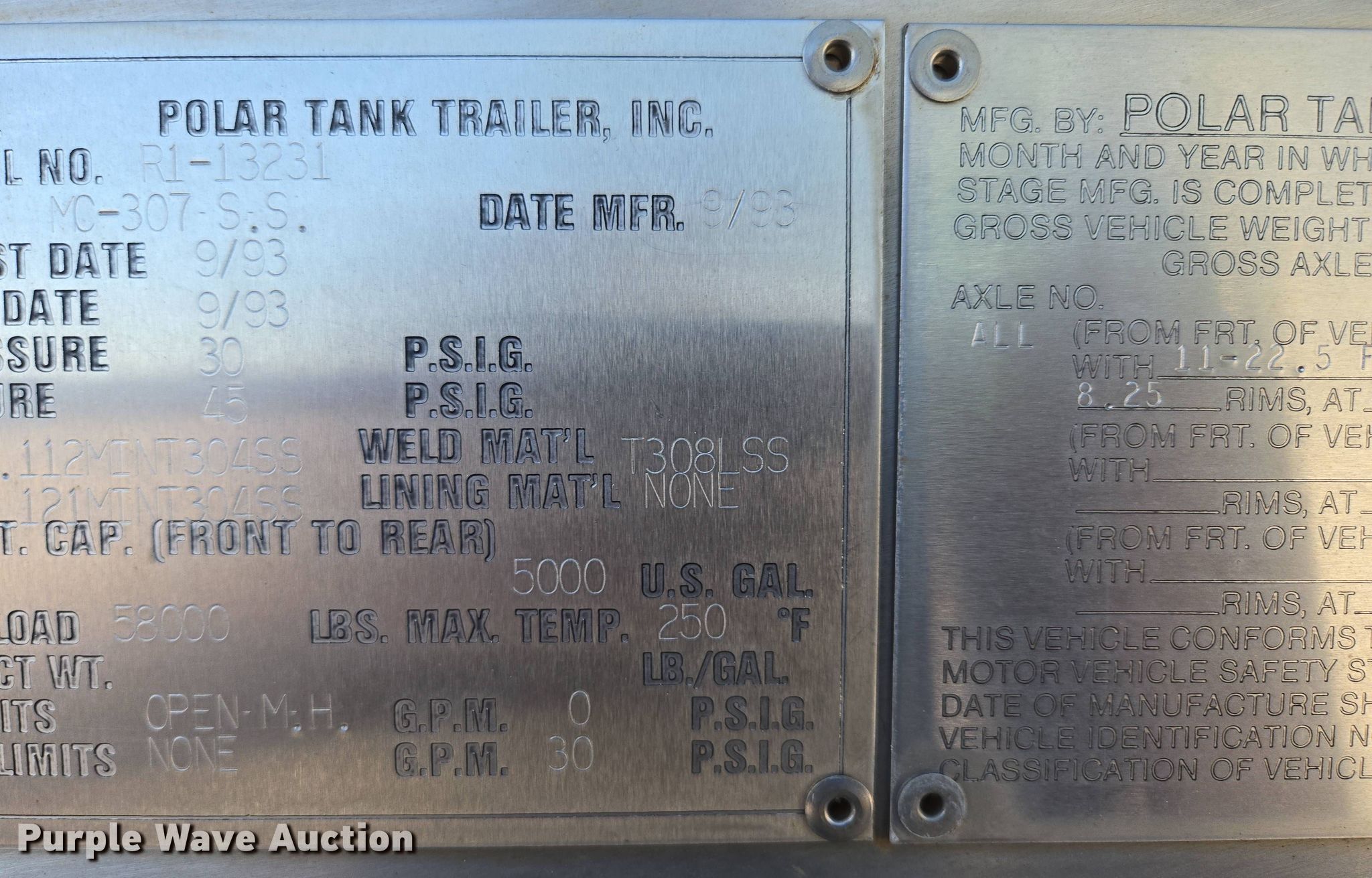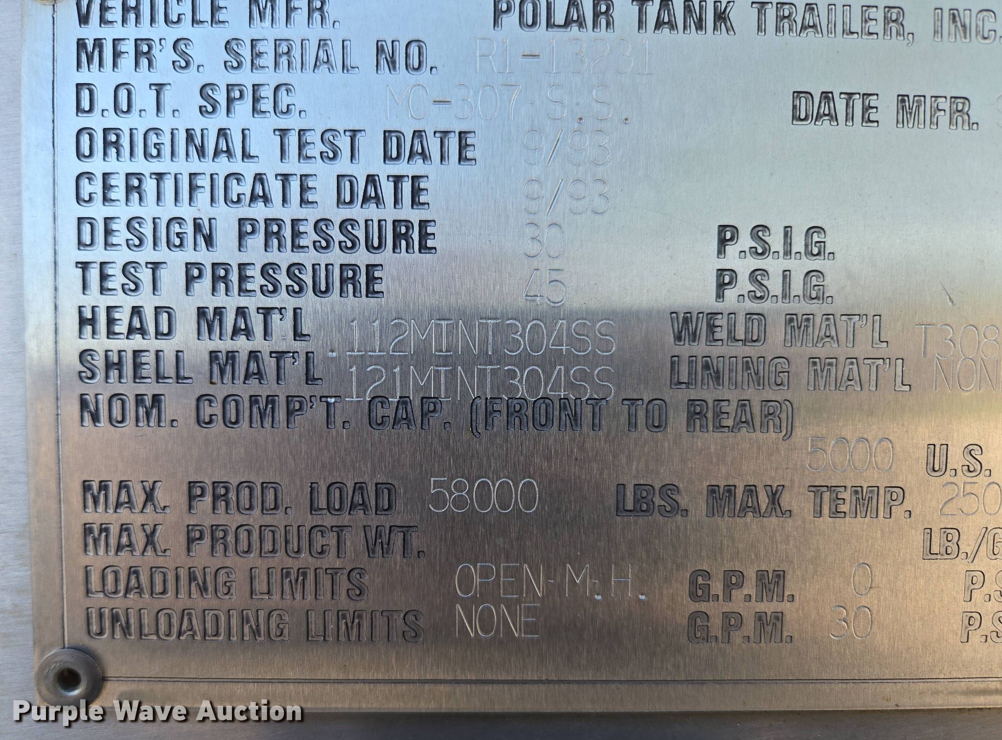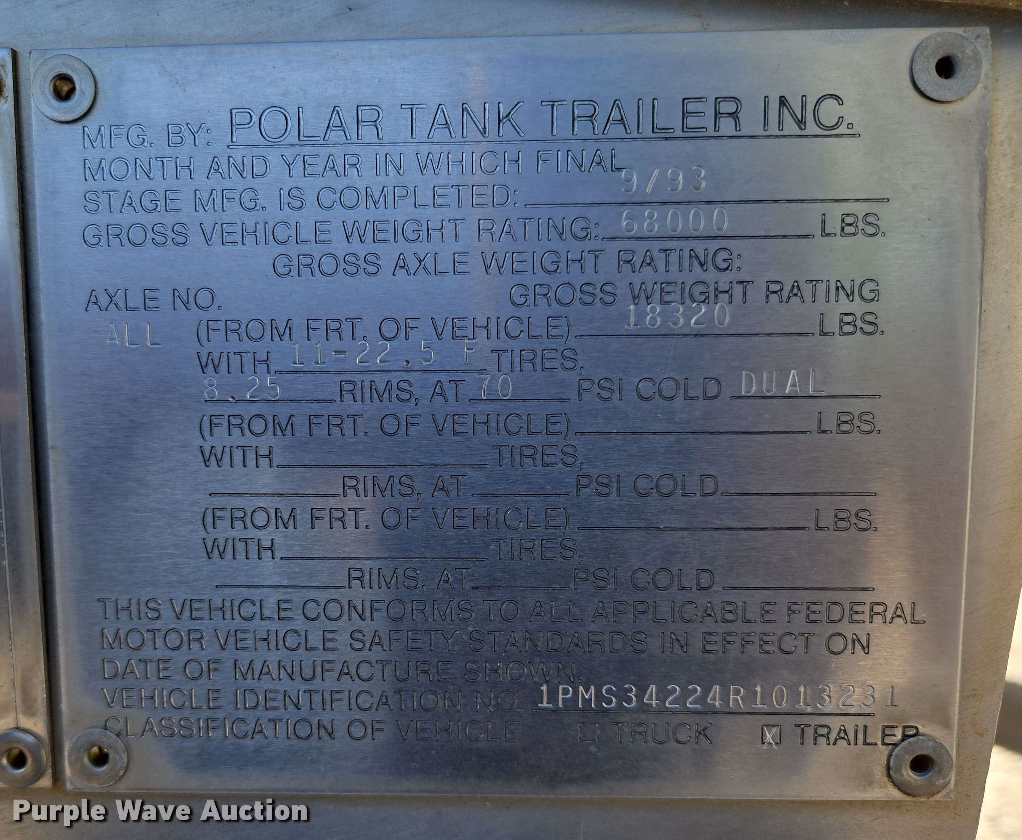 Purple Wave is selling a used Tank Trailer in Kansas. This item is a 1994 Polar tank trailer with the following: VIN: 1PMS34224R1013231, Unit #: 231